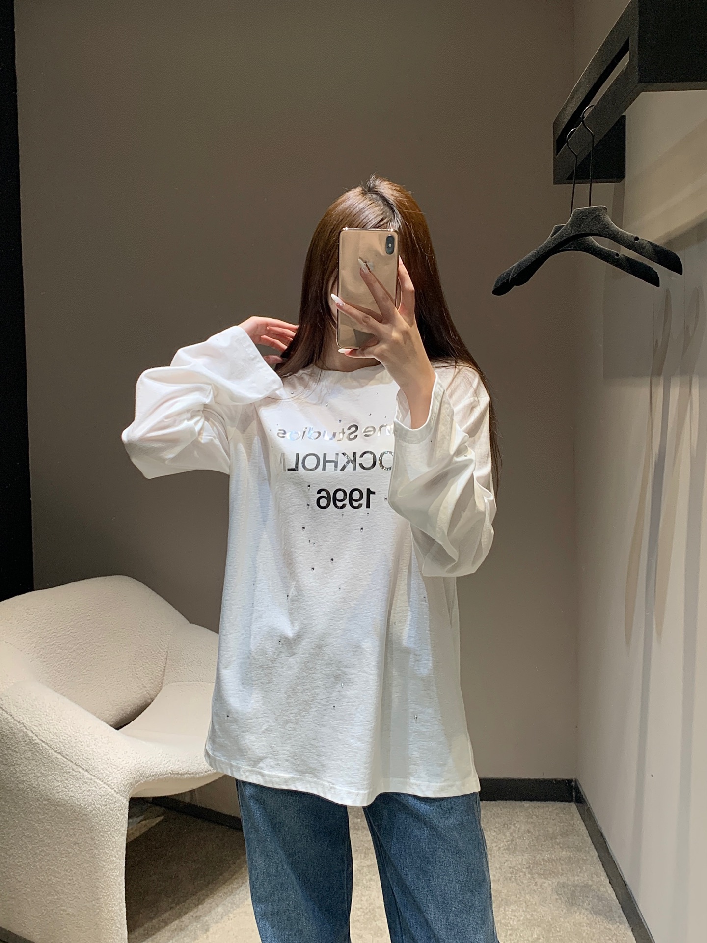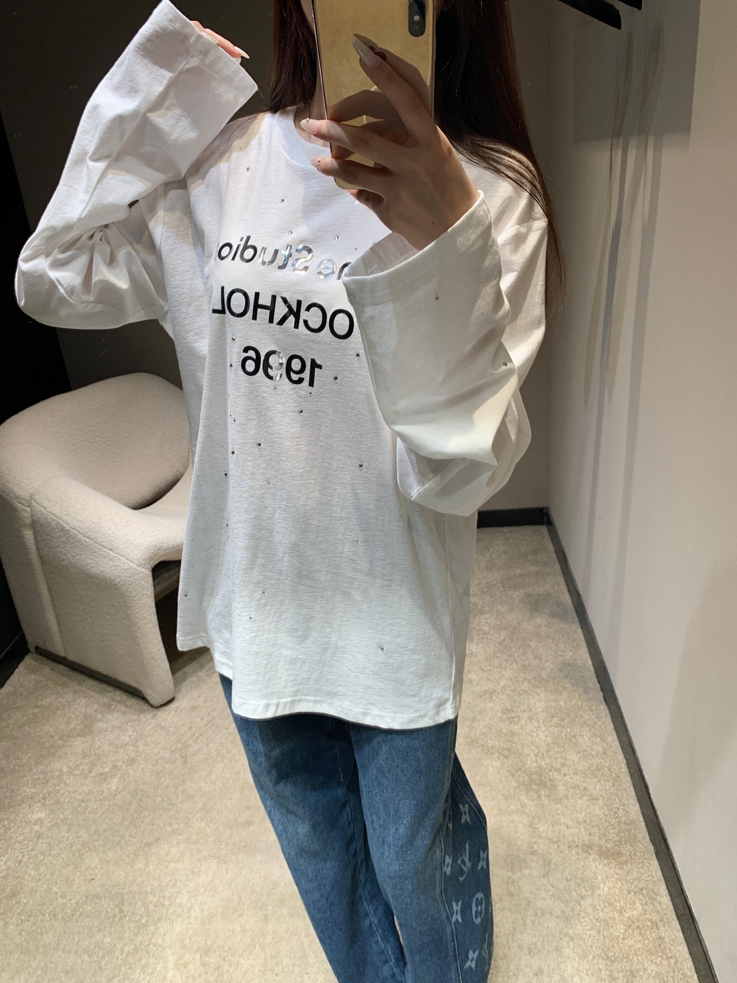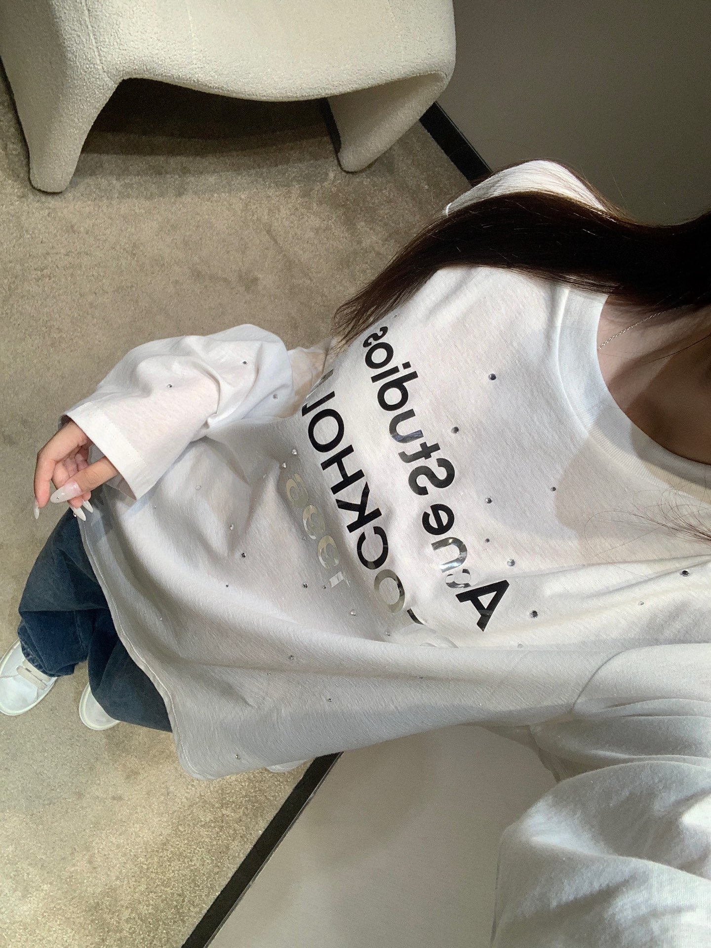 Tags: Acne Studios Long Sleeve, Casual Long Sleeve Shirt, Comfortable Long Sleeve, Mirror Print Long Sleeve, Rhinestone Long Sleeve Shirt, Women's Long Sleeve