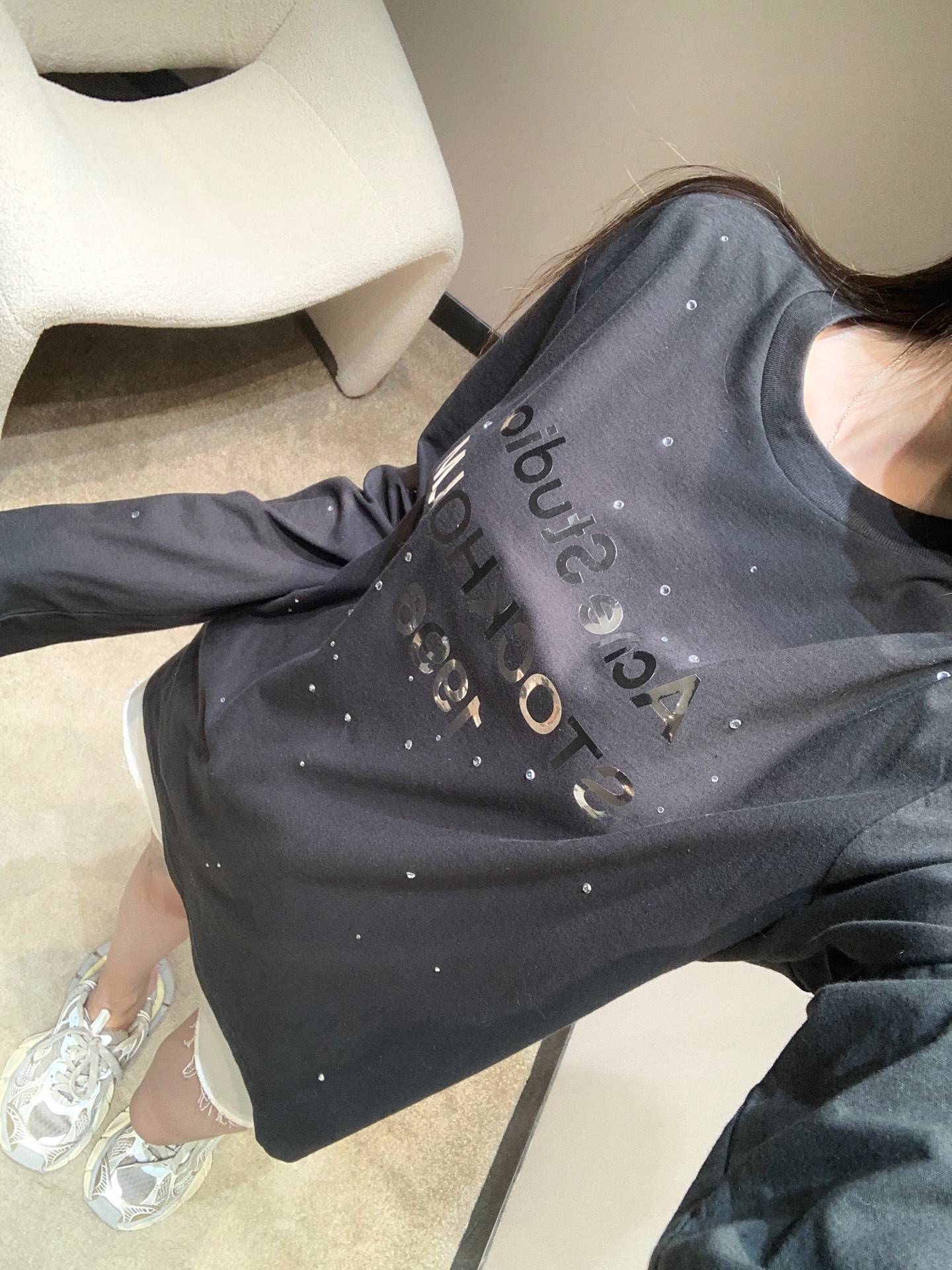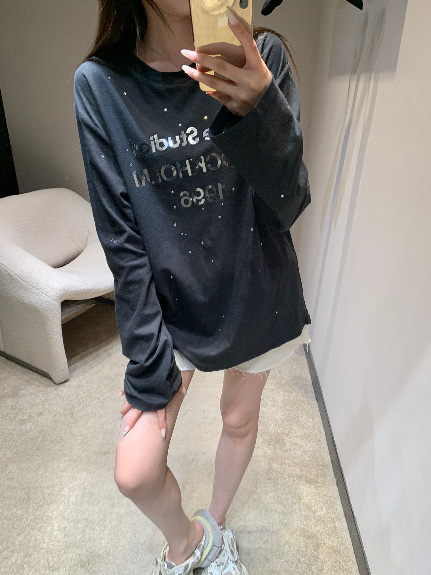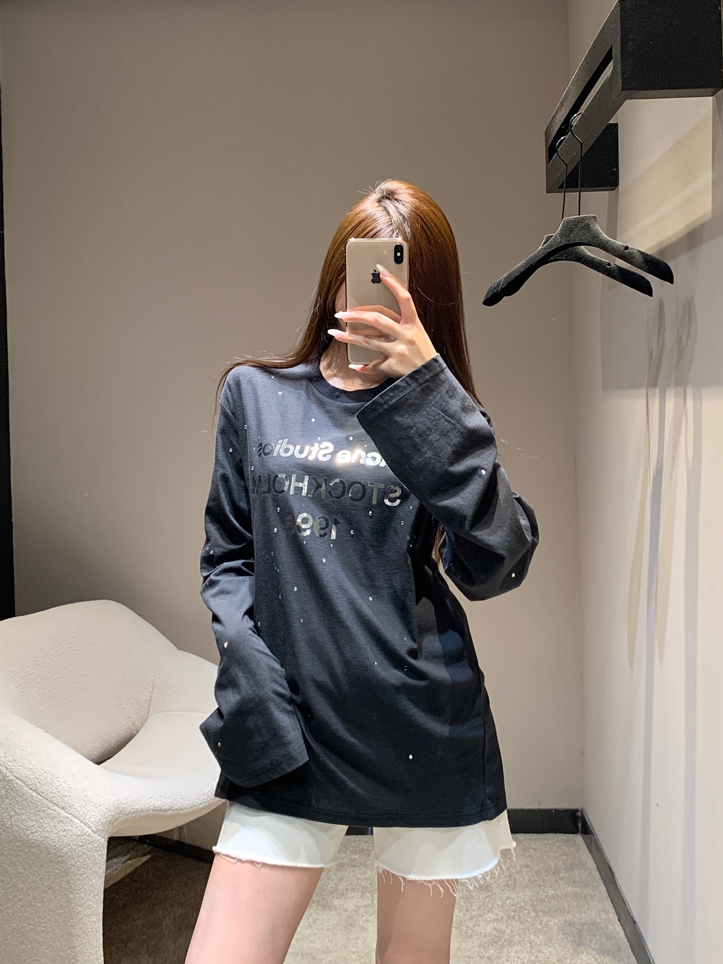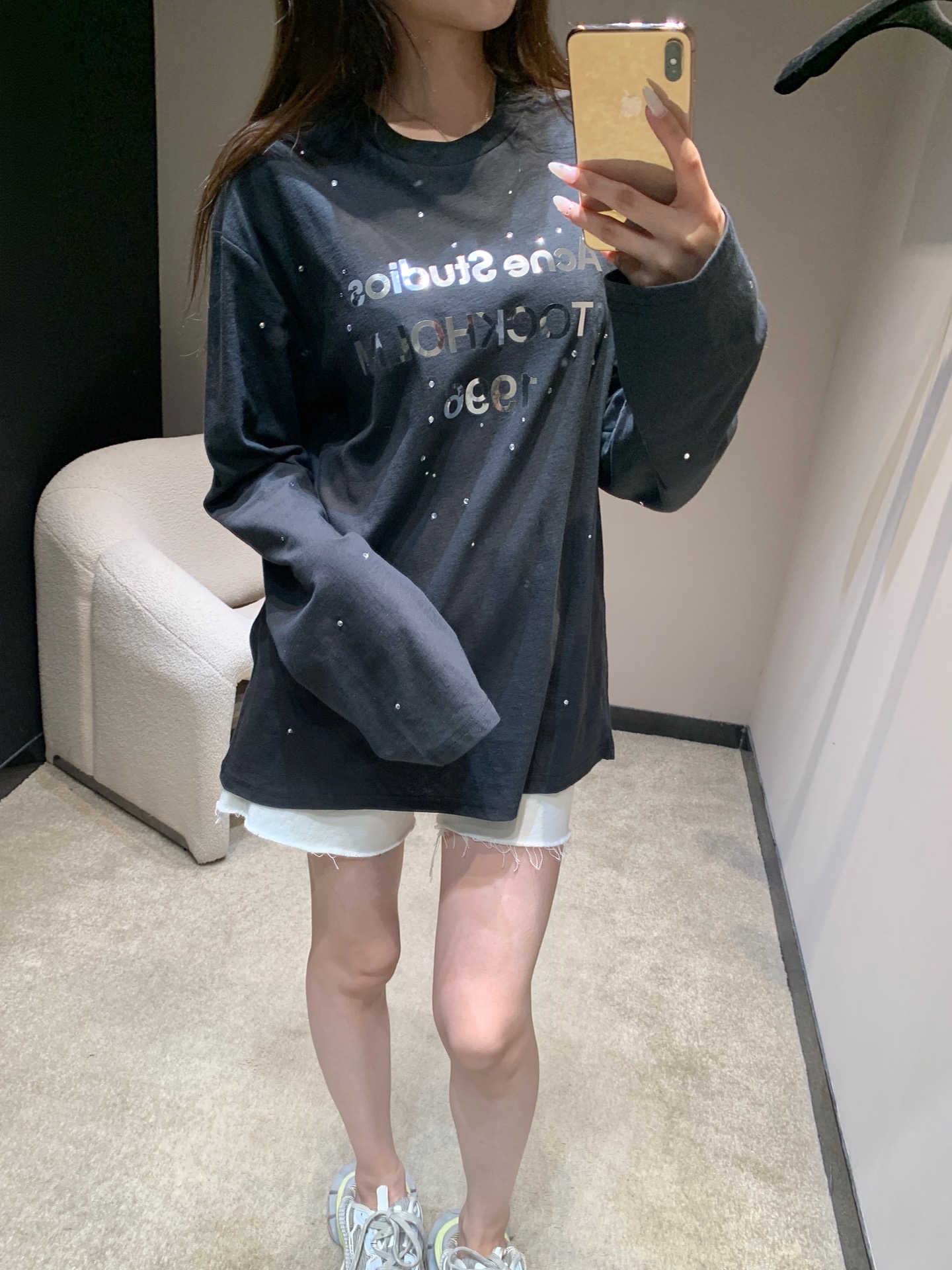Tags: Acne Studios T-Shirt, Designer Long Sleeve, Mirror Print Tee, Rhinestone Long Sleeve, Streetwear T-Shirt, Trendy Women's Top