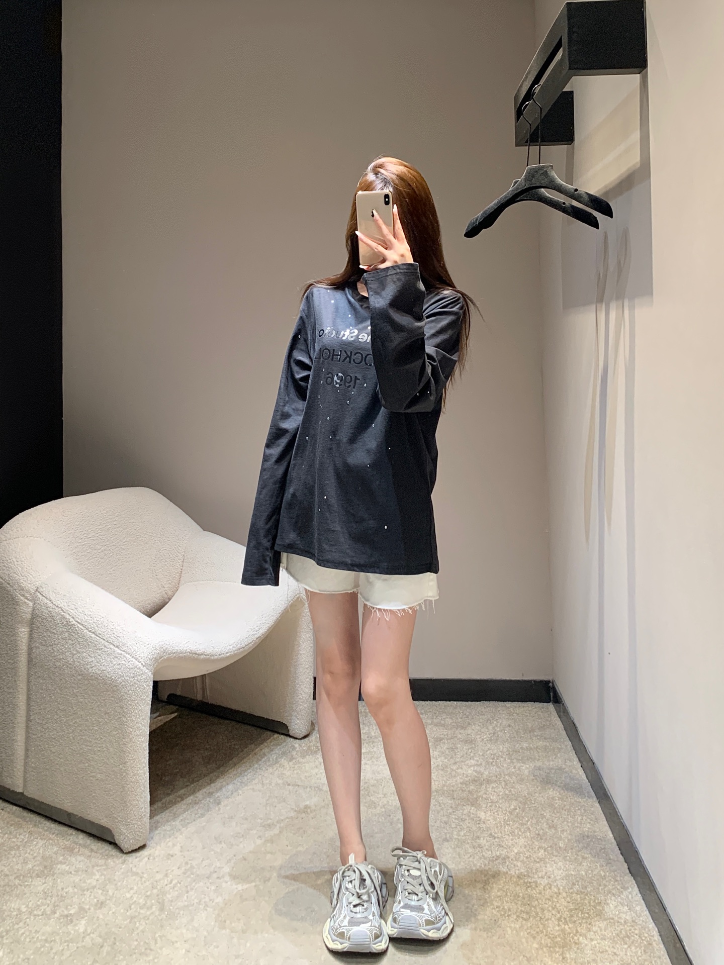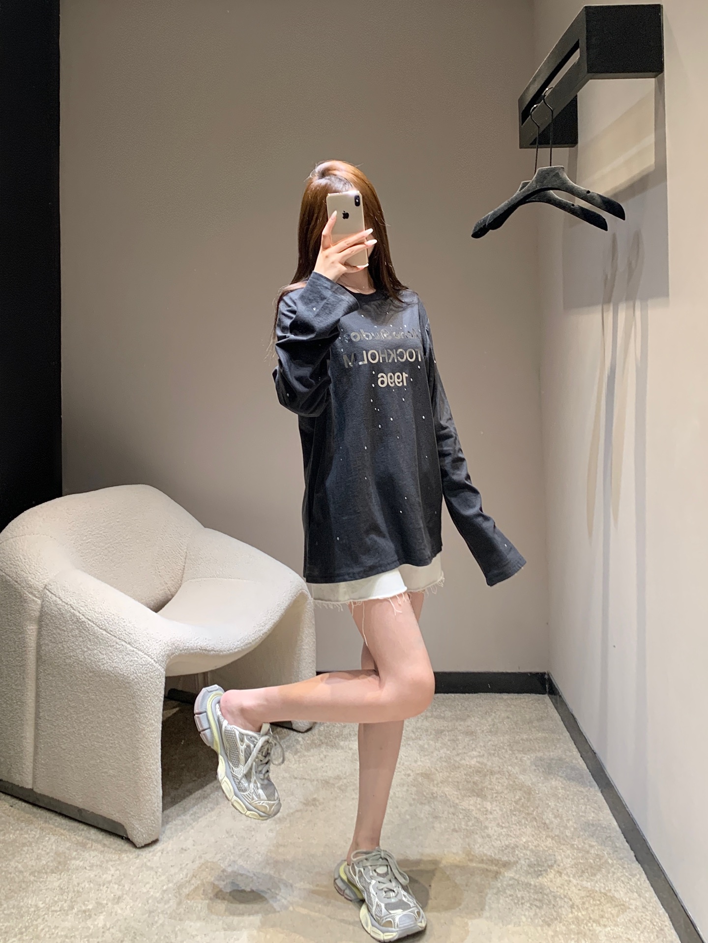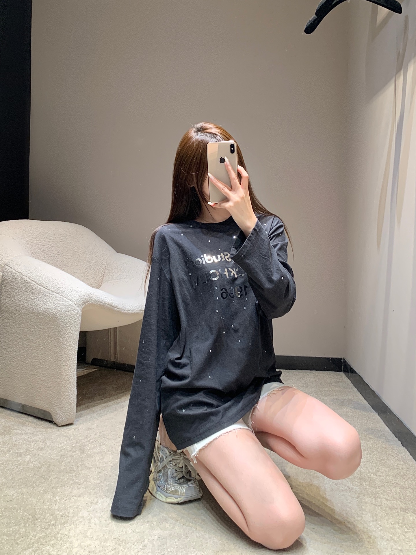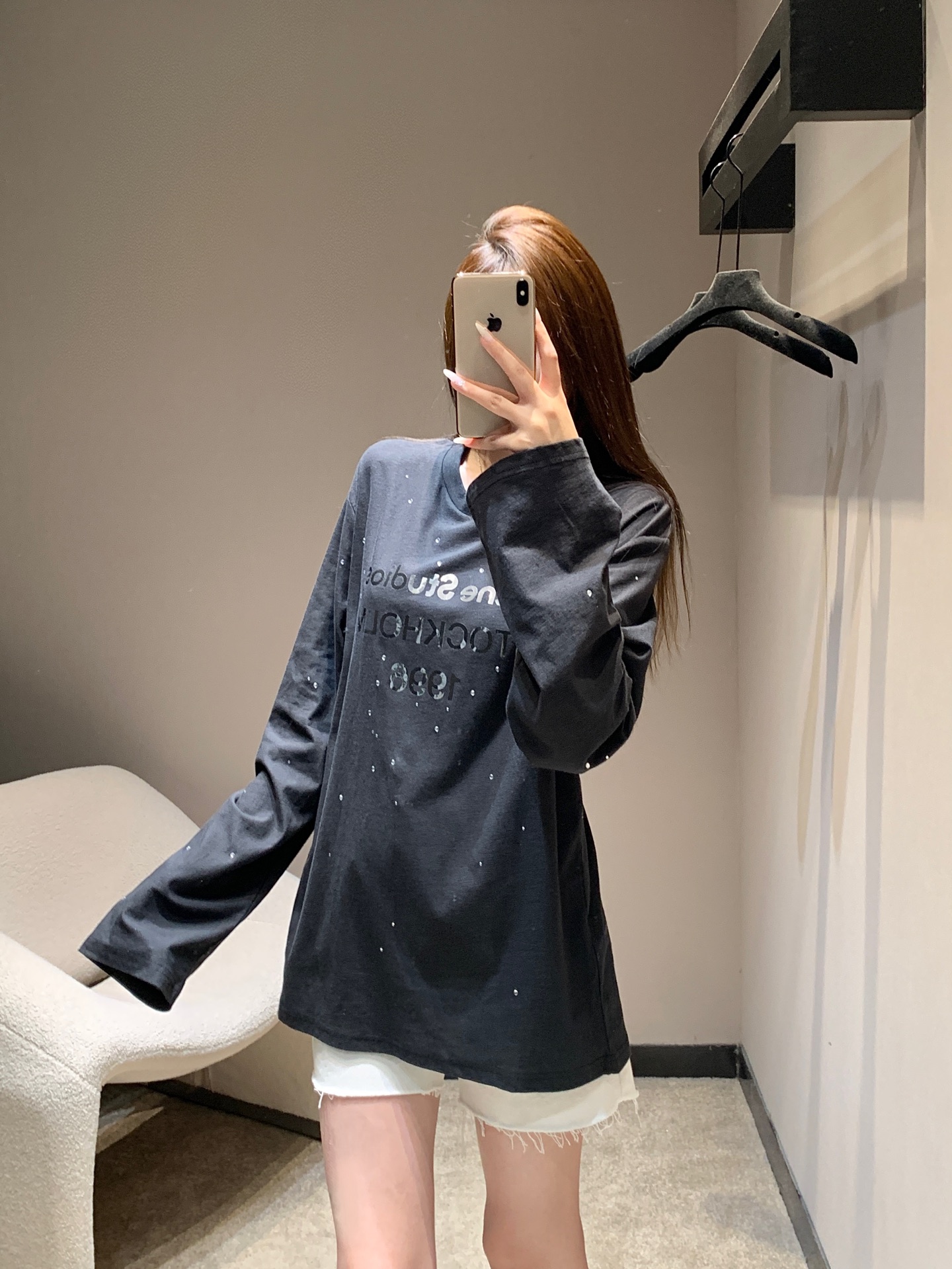 Tags: Acne Studios T-Shirt, Designer Long Sleeve, Mirror Print Tee, Rhinestone Long Sleeve, Streetwear T-Shirt, Trendy Women's Top