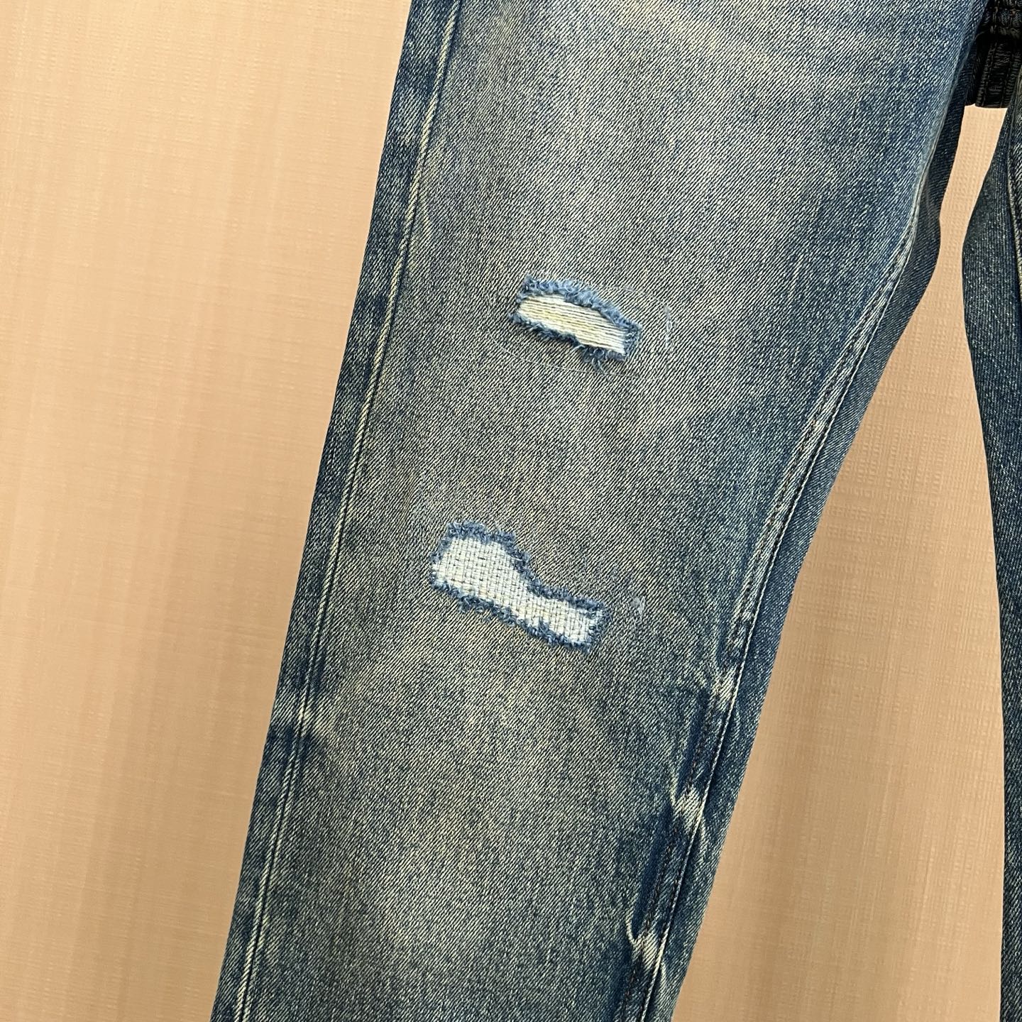 - Distressed detailing with strategic rips and repairs for a unique, worn-in look.