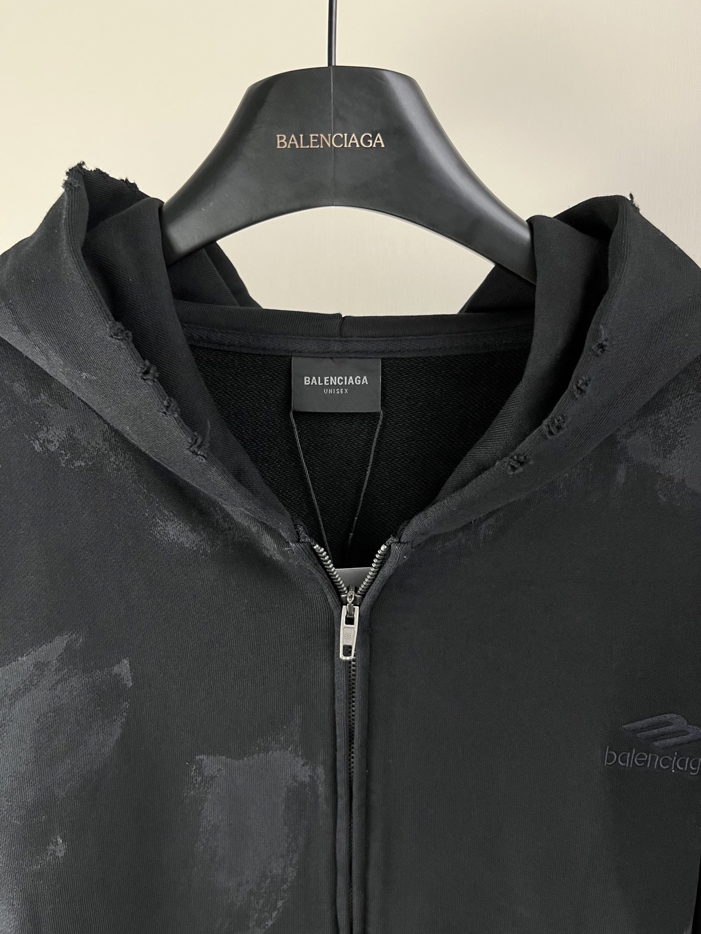 Elevate your streetwear with Balenciaga's vintage-washed zip-up hoodie. Crafted from premium cotton with unique distressed details for a stylish, edgy look.