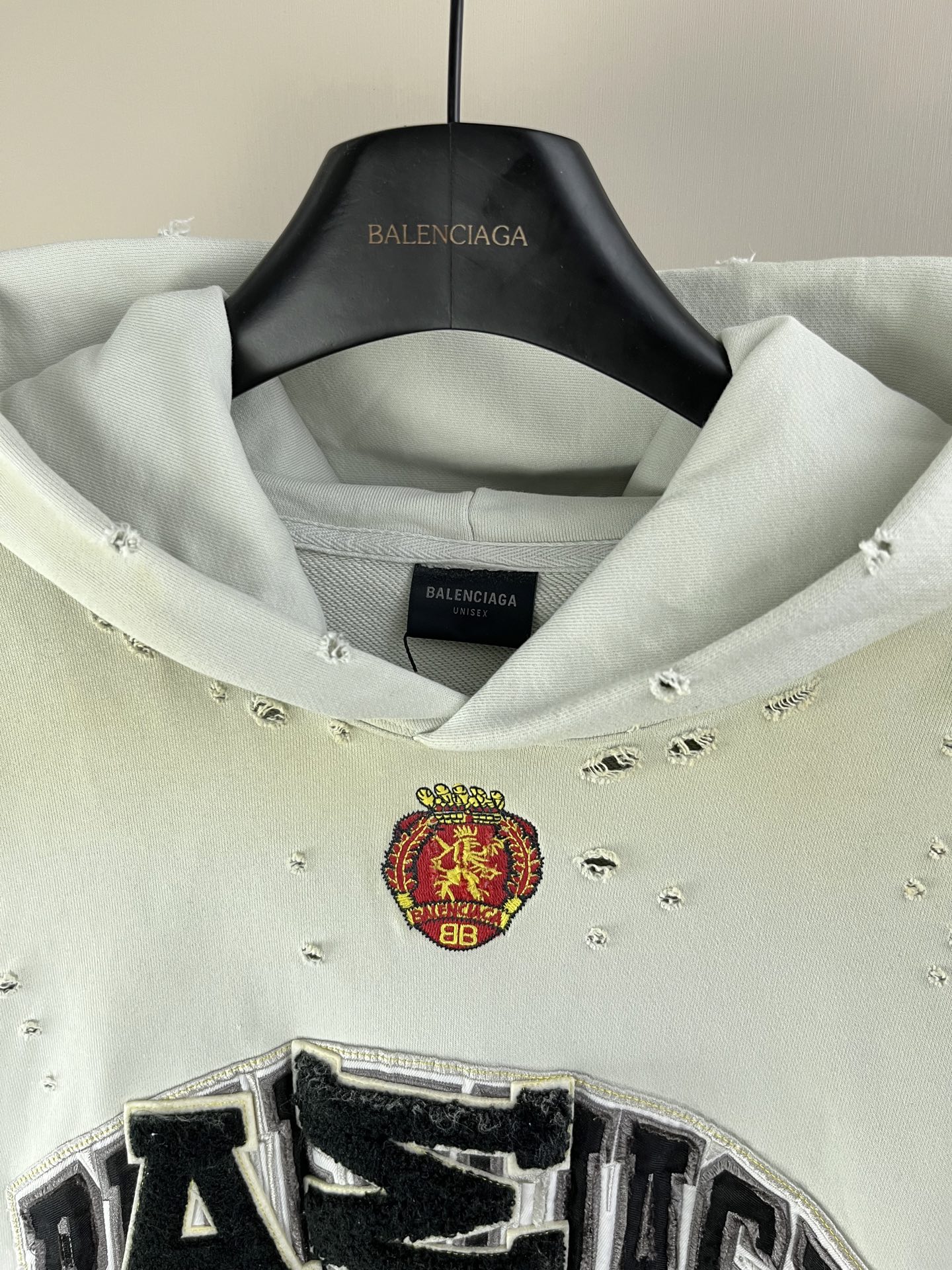 Elevate your streetwear with this Balenciaga x Manchester United hoodie. Features a distressed design, cotton, and a comfortable oversized fit.