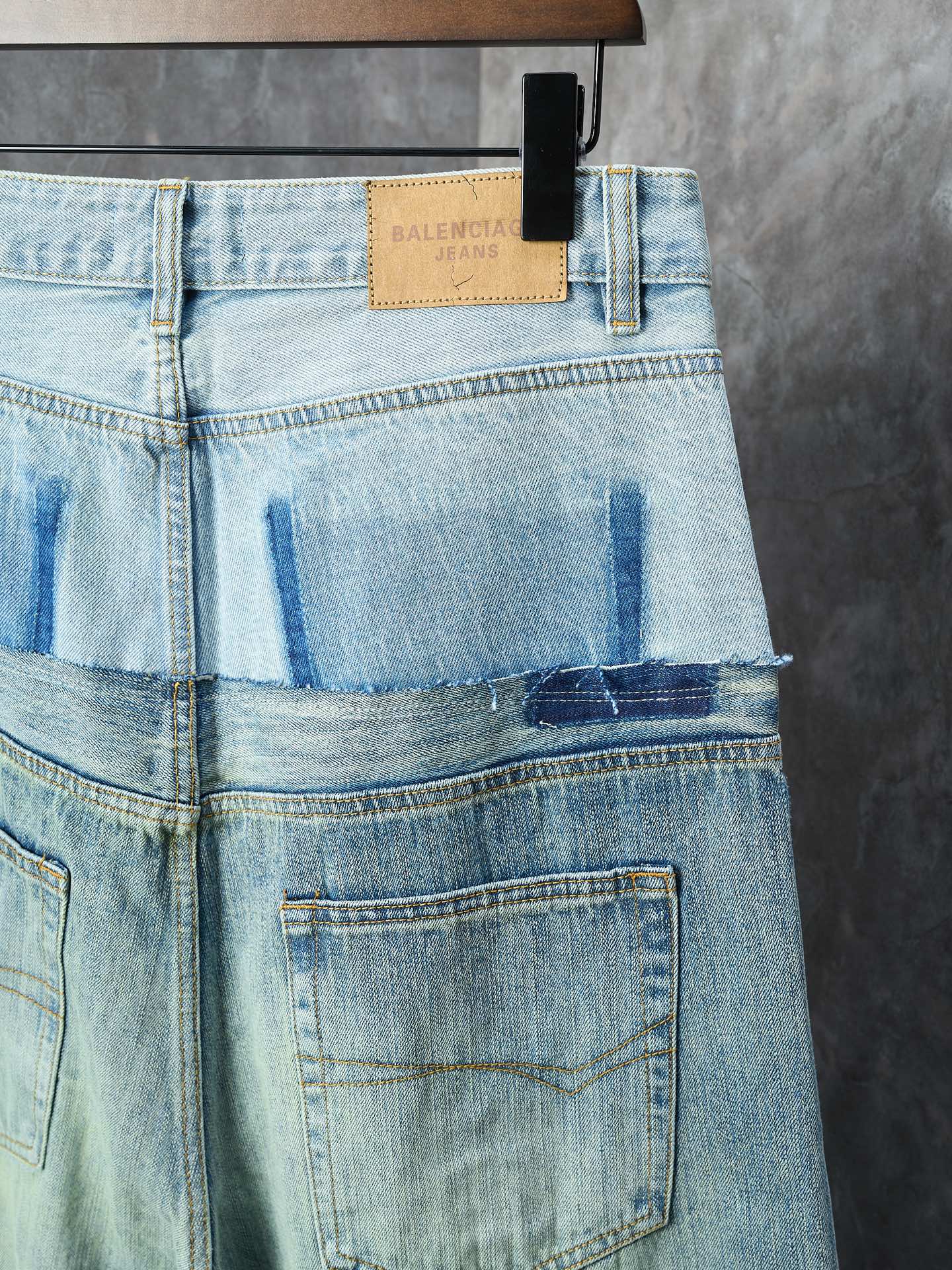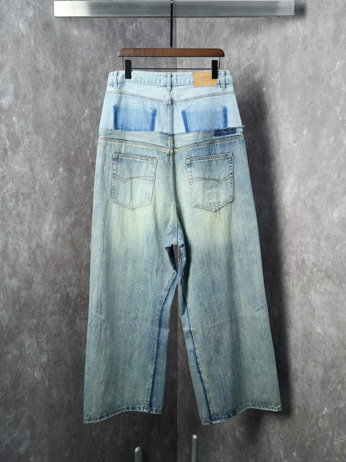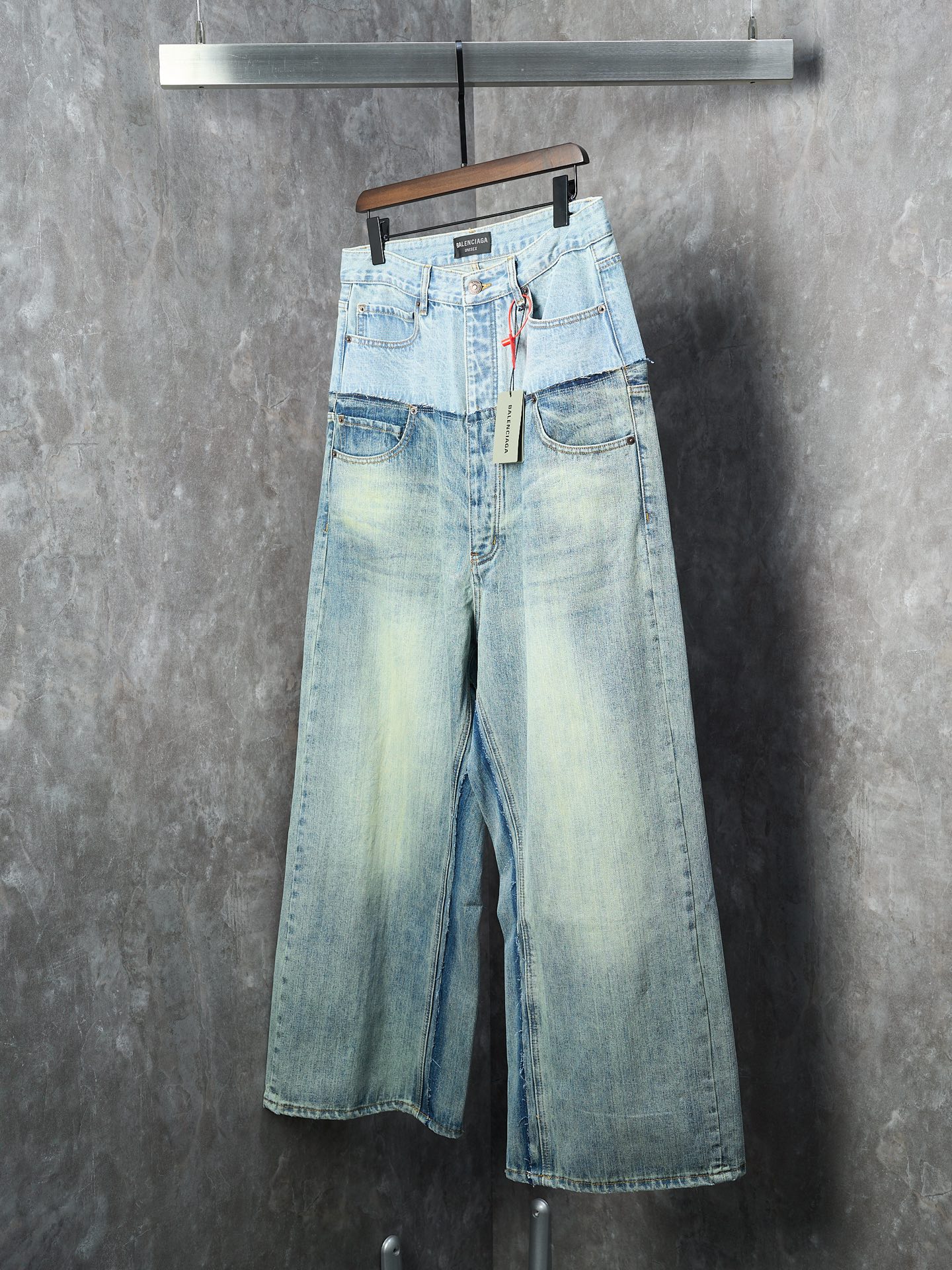 Balenciaga Multi-Pocket Two-Tone Jeans Distressed Denim Wide Leg Pants