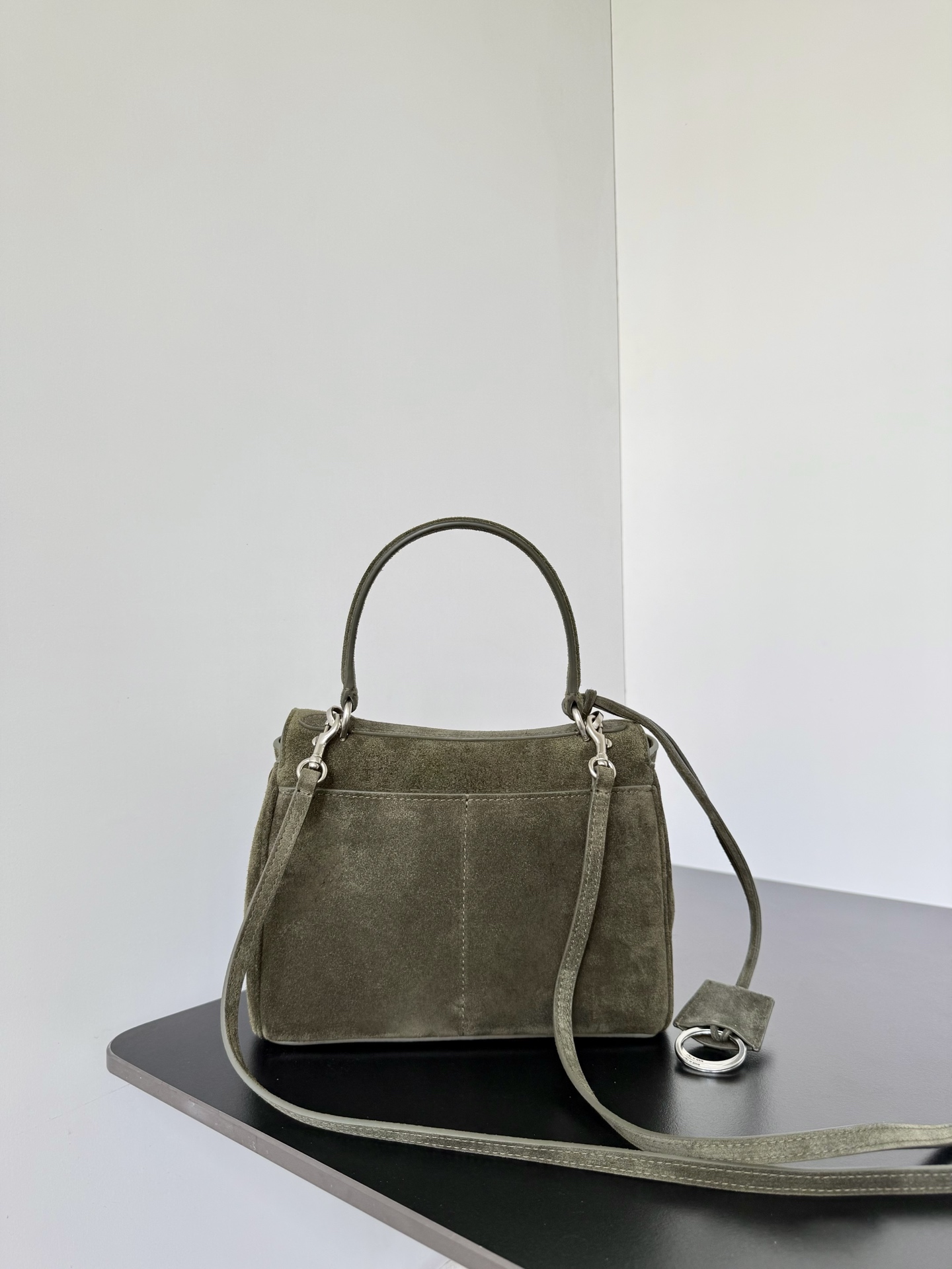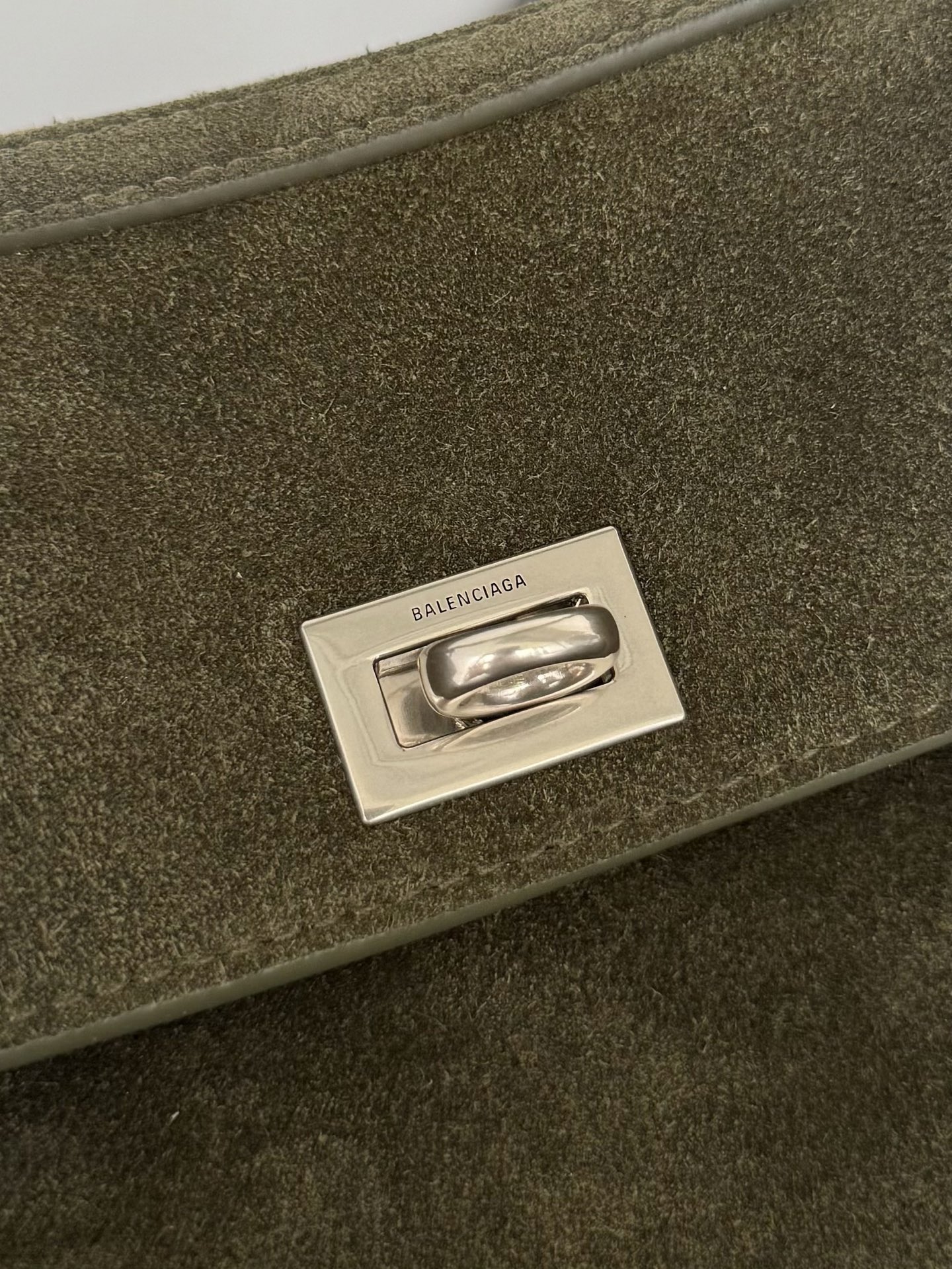 Discover the Balenciaga Rodeo bag. This olive green suede bag features a structured top handle and sleek silver hardware, perfect for everyday elegance.