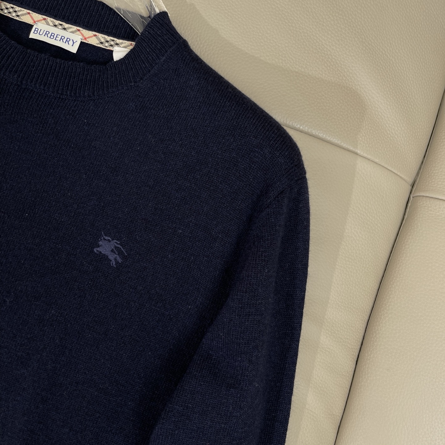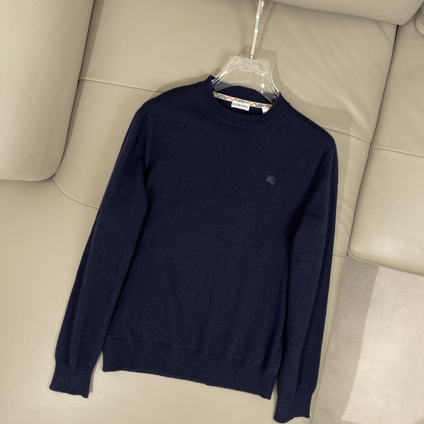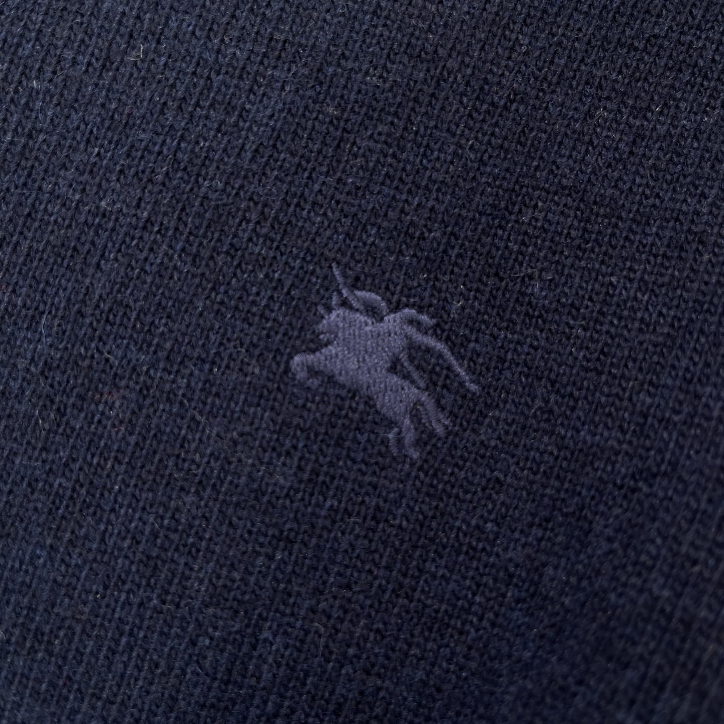 Tags: Burberry Wool Sweater, Designer Wool Sweater, Embroidered Logo Sweater, Luxury Men's Knitwear, Men's Crew Neck Sweater, Navy Wool Sweater
