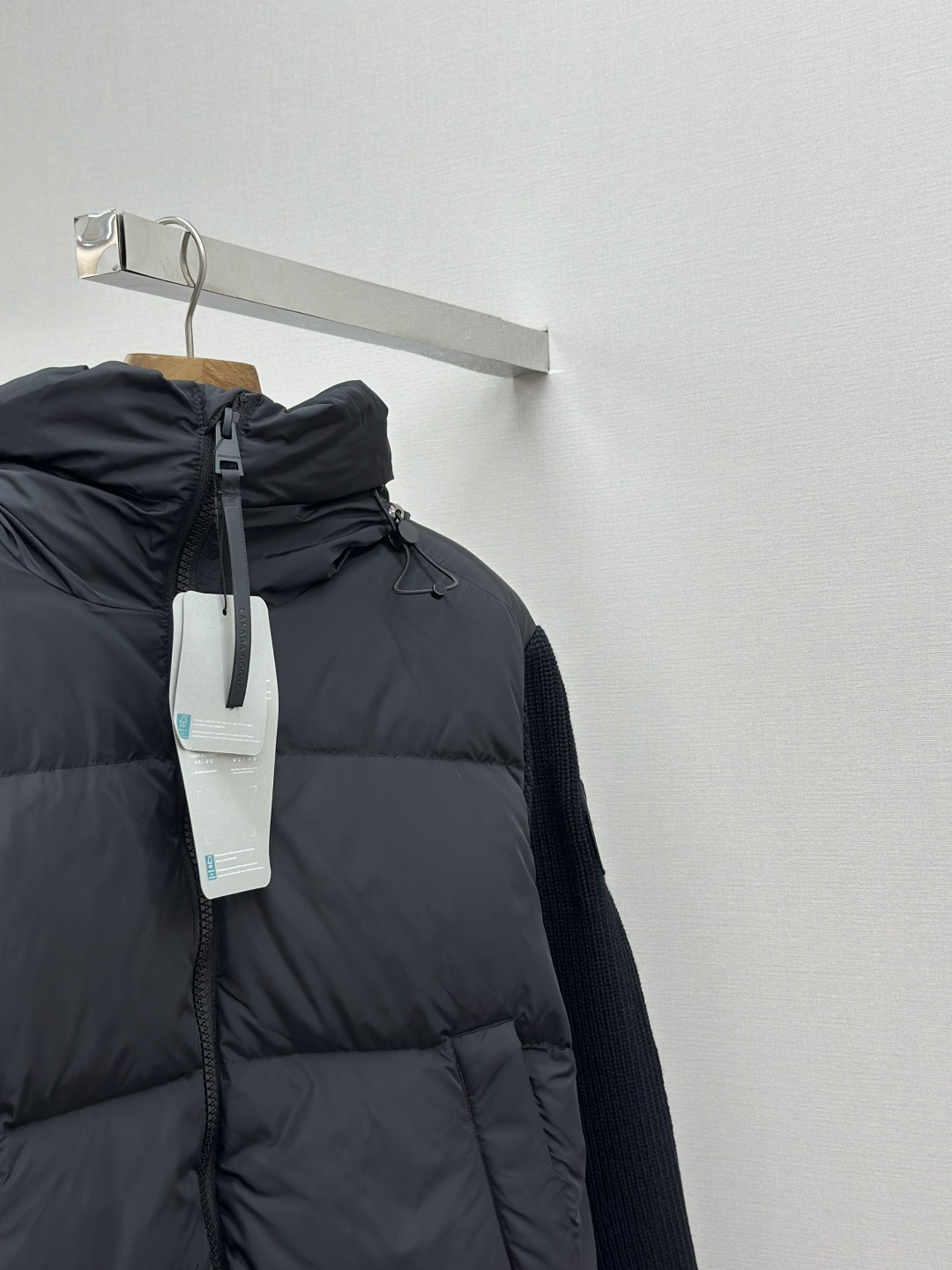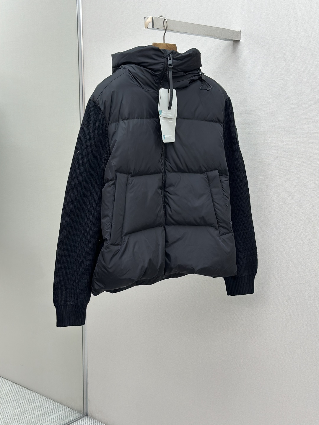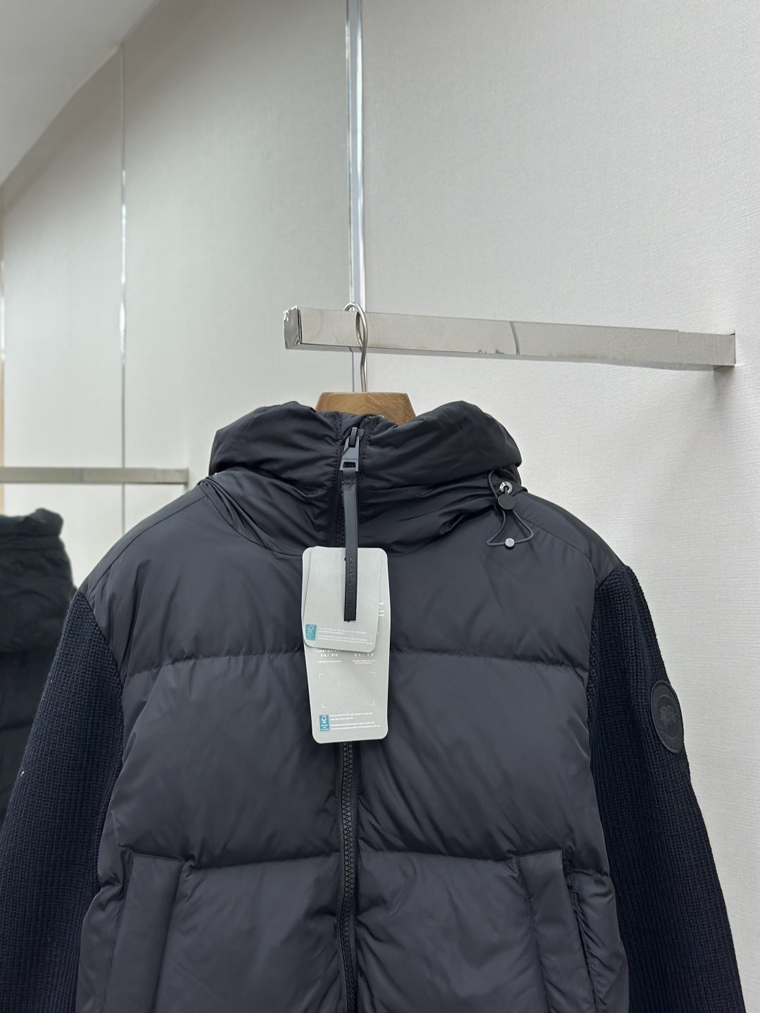 Tags: Canada Goose Down Jacket, Designer Padded Coat, Hooded Winter Jacket, Knit Sleeve Down Puffer, Luxury Winter Outerwear, Warm Knitted Down Jacket