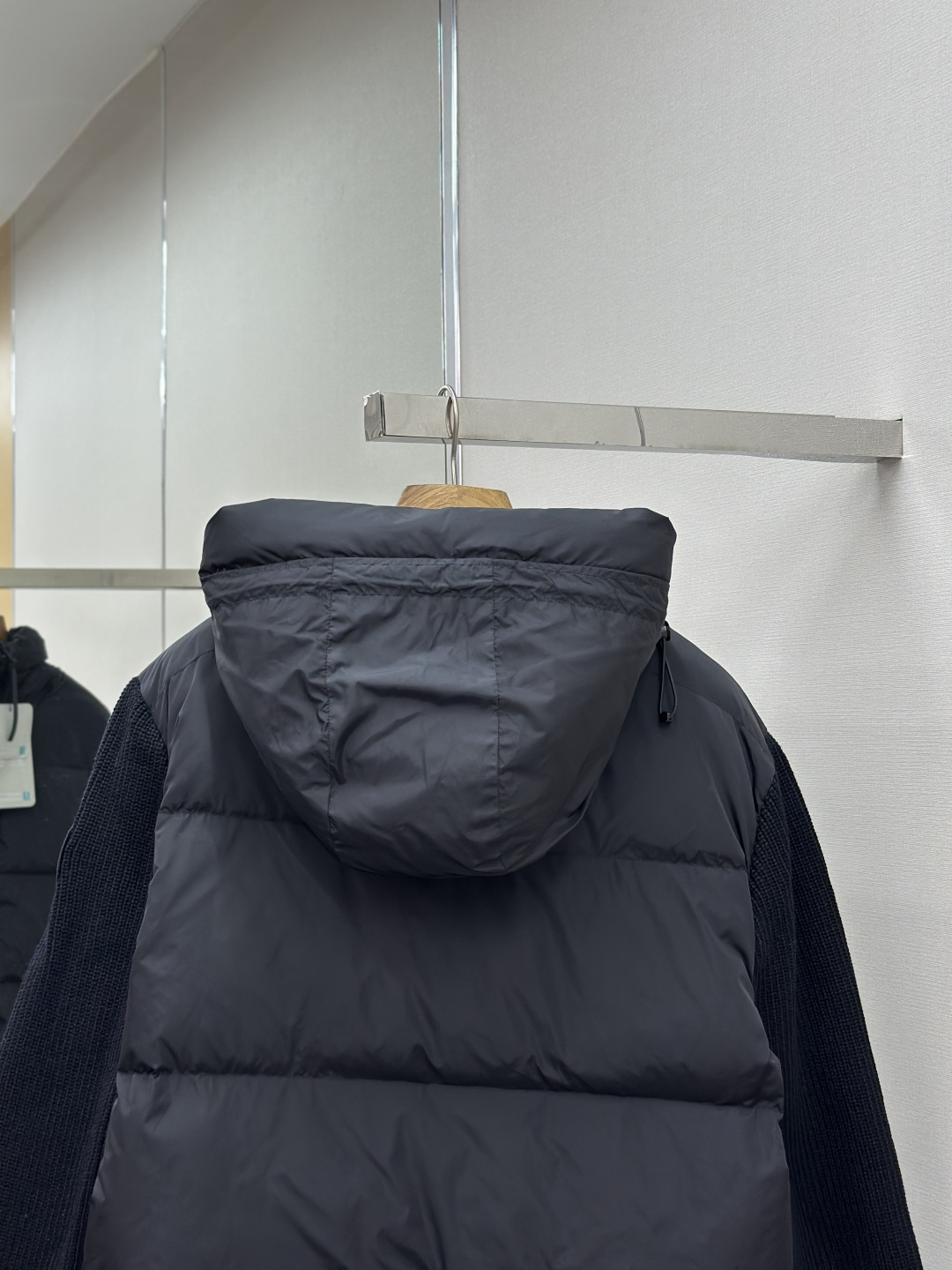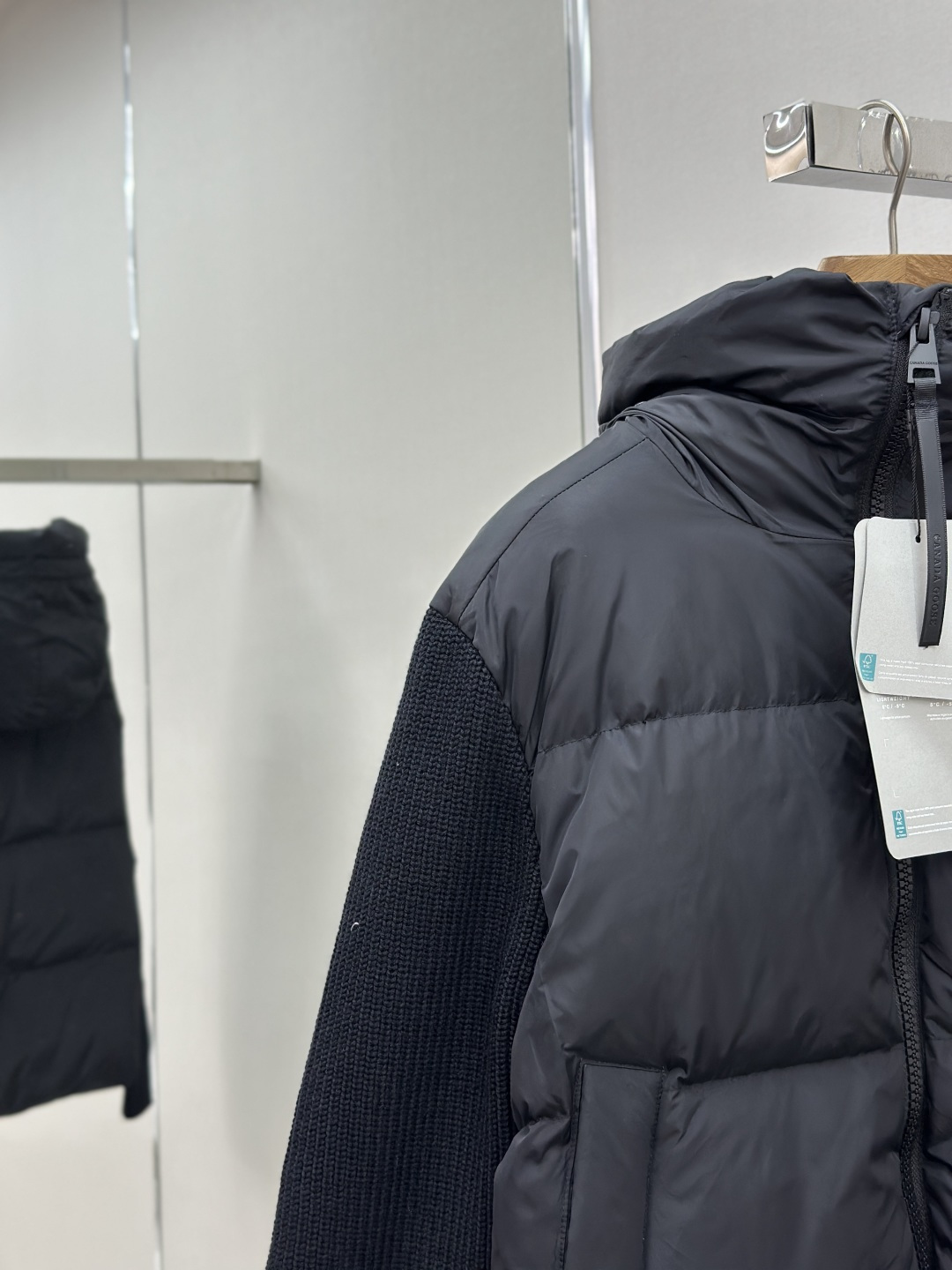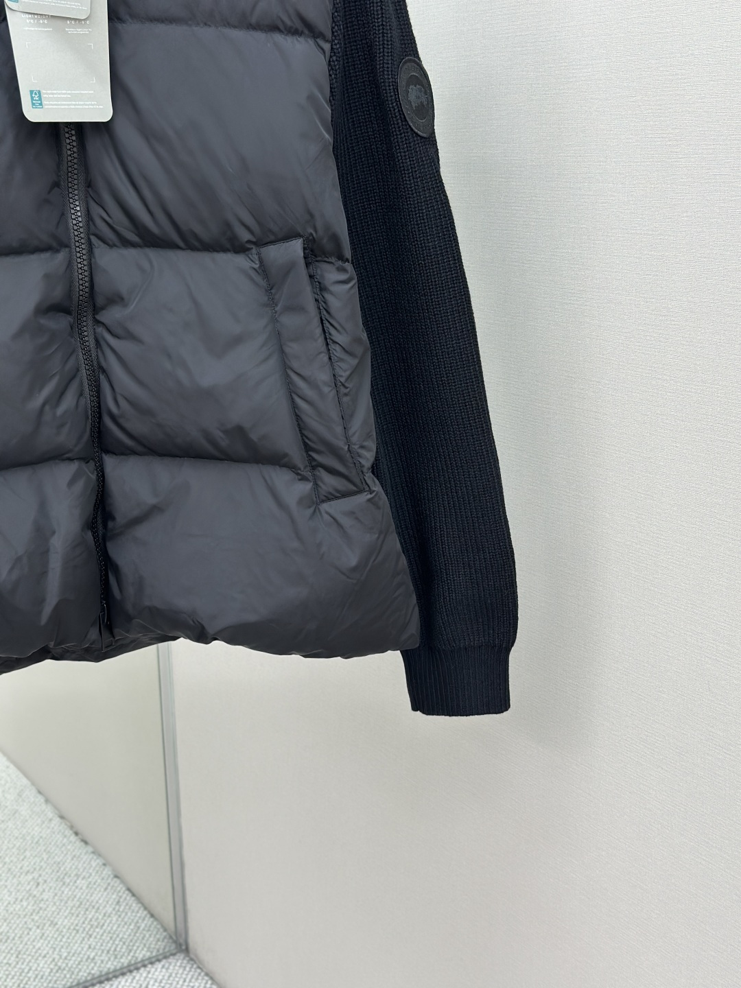 Tags: Canada Goose Down Jacket, Designer Padded Coat, Hooded Winter Jacket, Knit Sleeve Down Puffer, Luxury Winter Outerwear, Warm Knitted Down Jacket