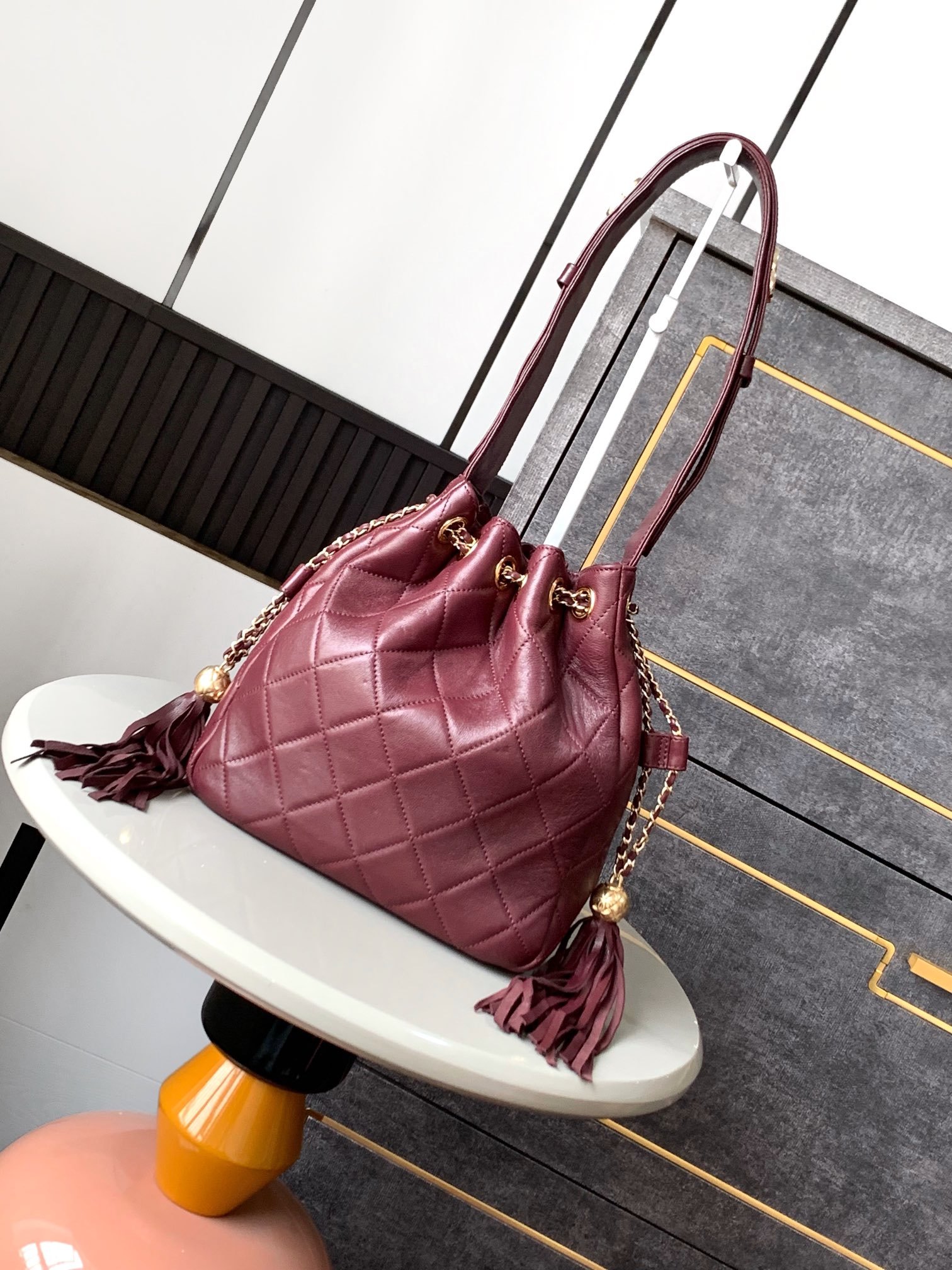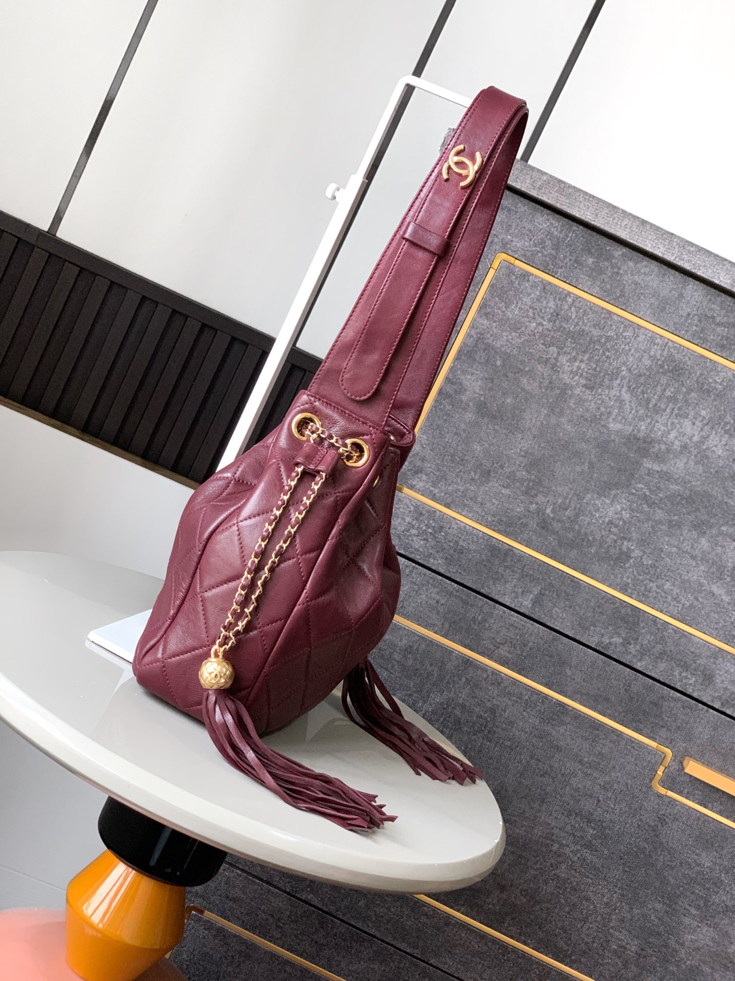 Elevate your style with the Chanel 25A bucket bag. Features wine red lambskin leather, double pendant, and leather-woven chain. Classic and practical.