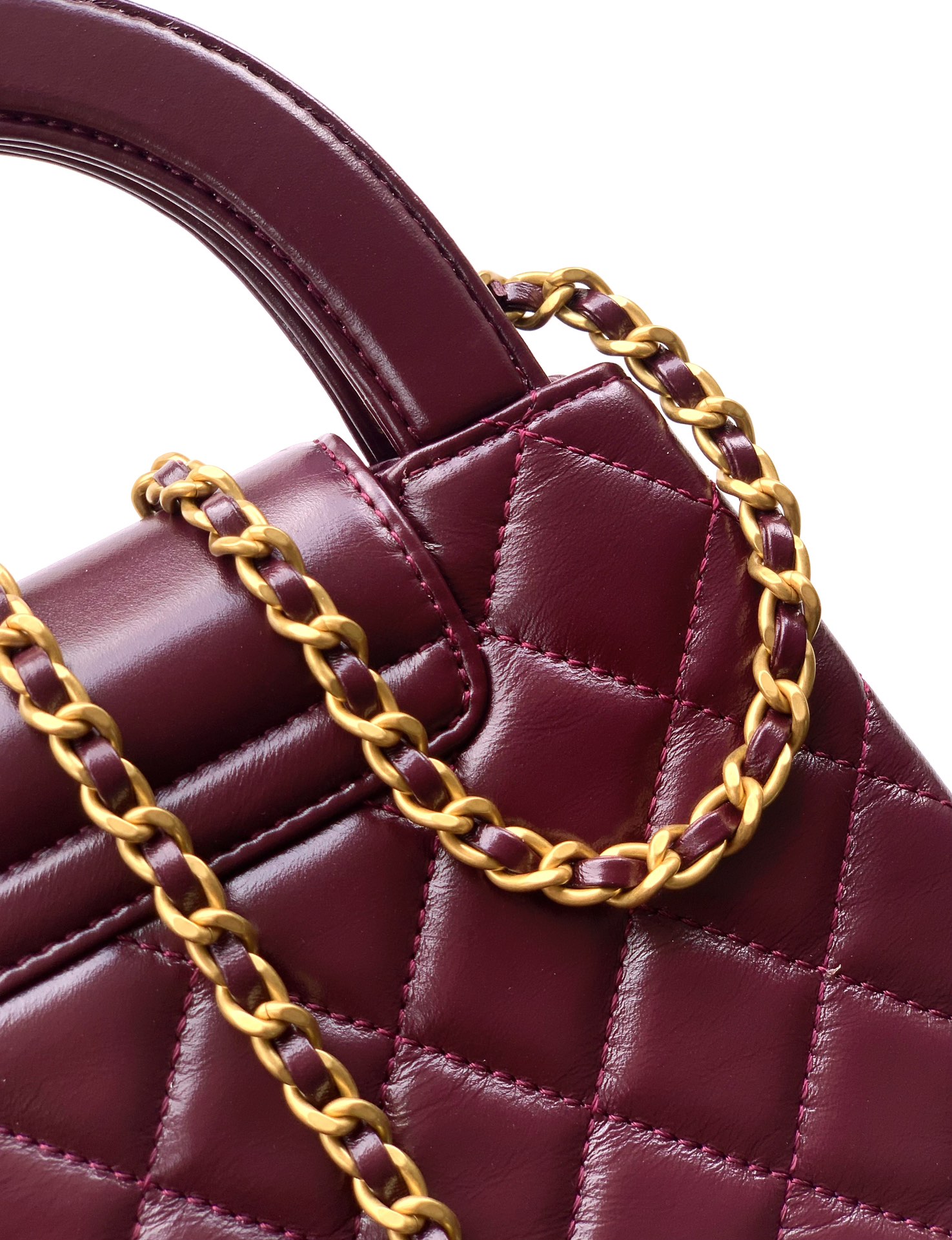 Vintage Chanel 25A Kelly bag in deep brown wine red. Features chain accent, perfect for crossbody or hand carry, compact size.