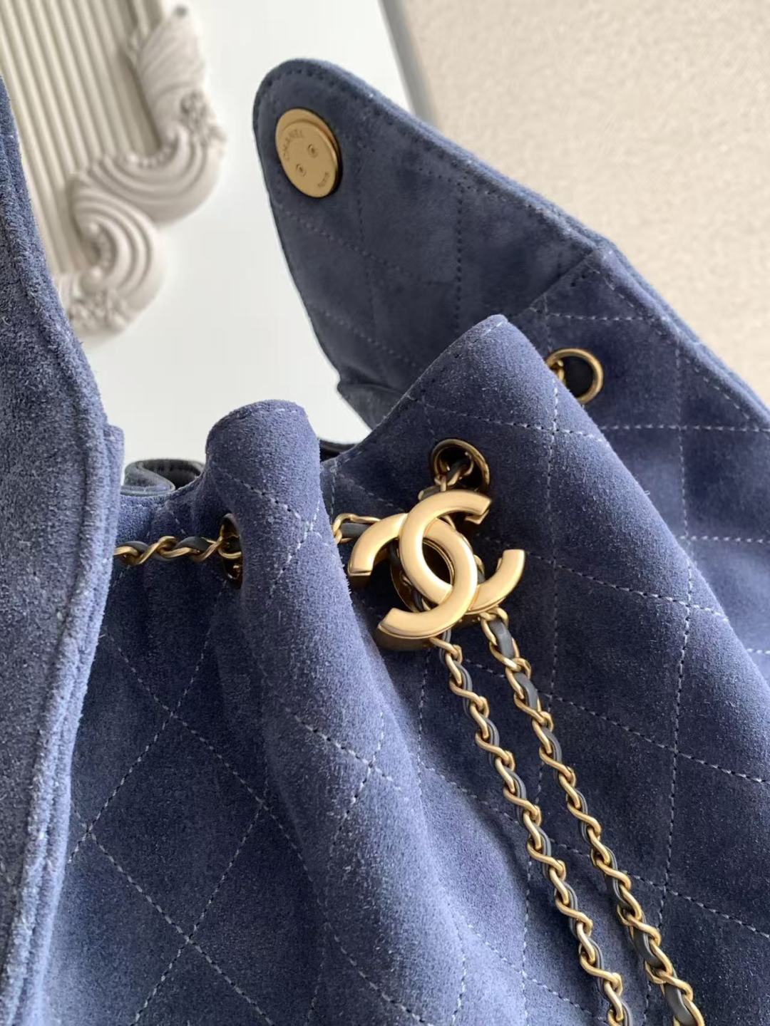 Elevate your style with this Chanel 25c hobo bag. Crafted from luxurious blue suede, it features a drawstring closure, gold chain, and iconic coin details.