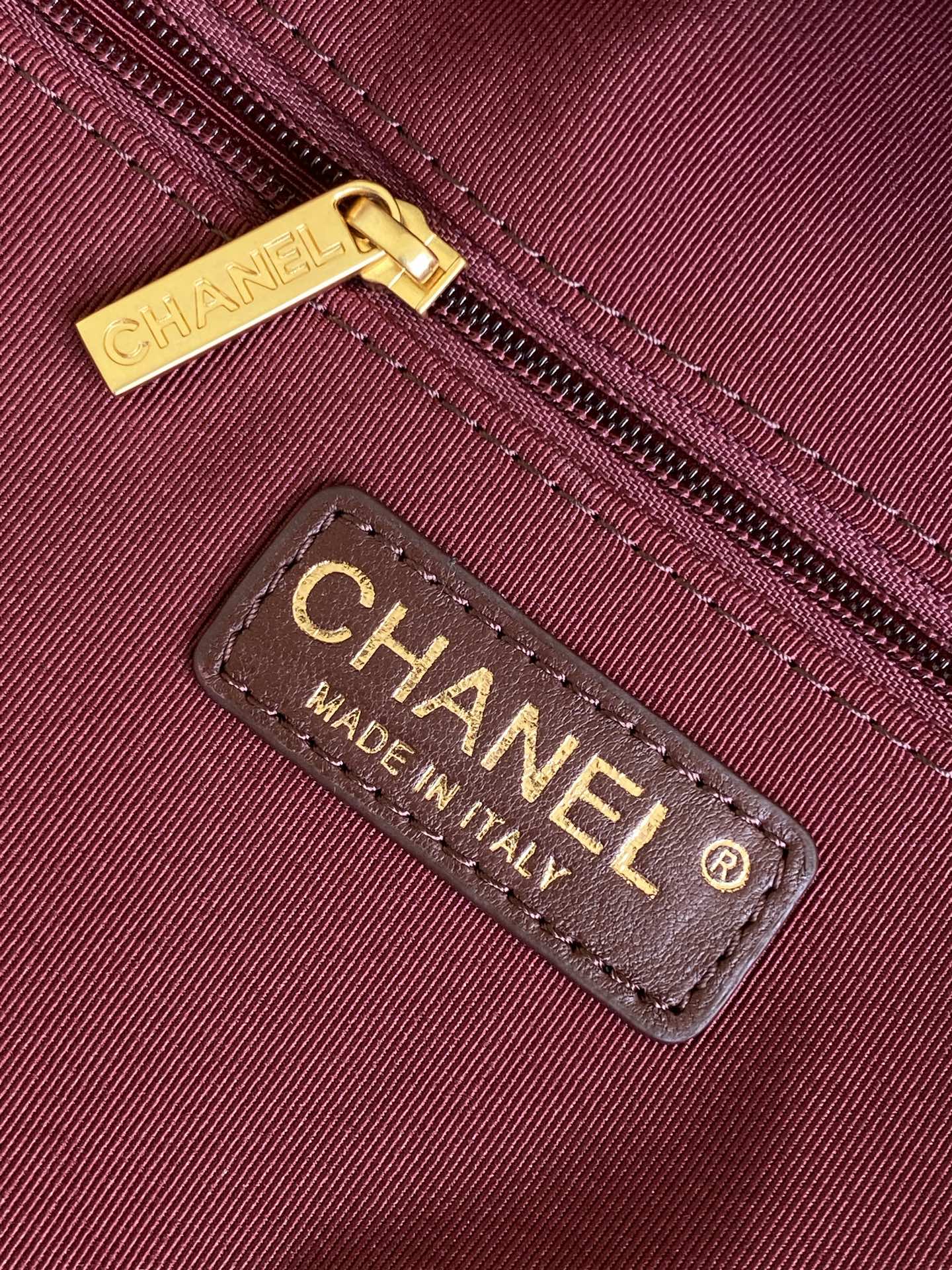 This Chanel bowling bag is a timeless piece that combines luxury with practicality. Crafted from supple burgundy lambskin, it features the iconic diamond quilting and brushed gold-tone hardware.