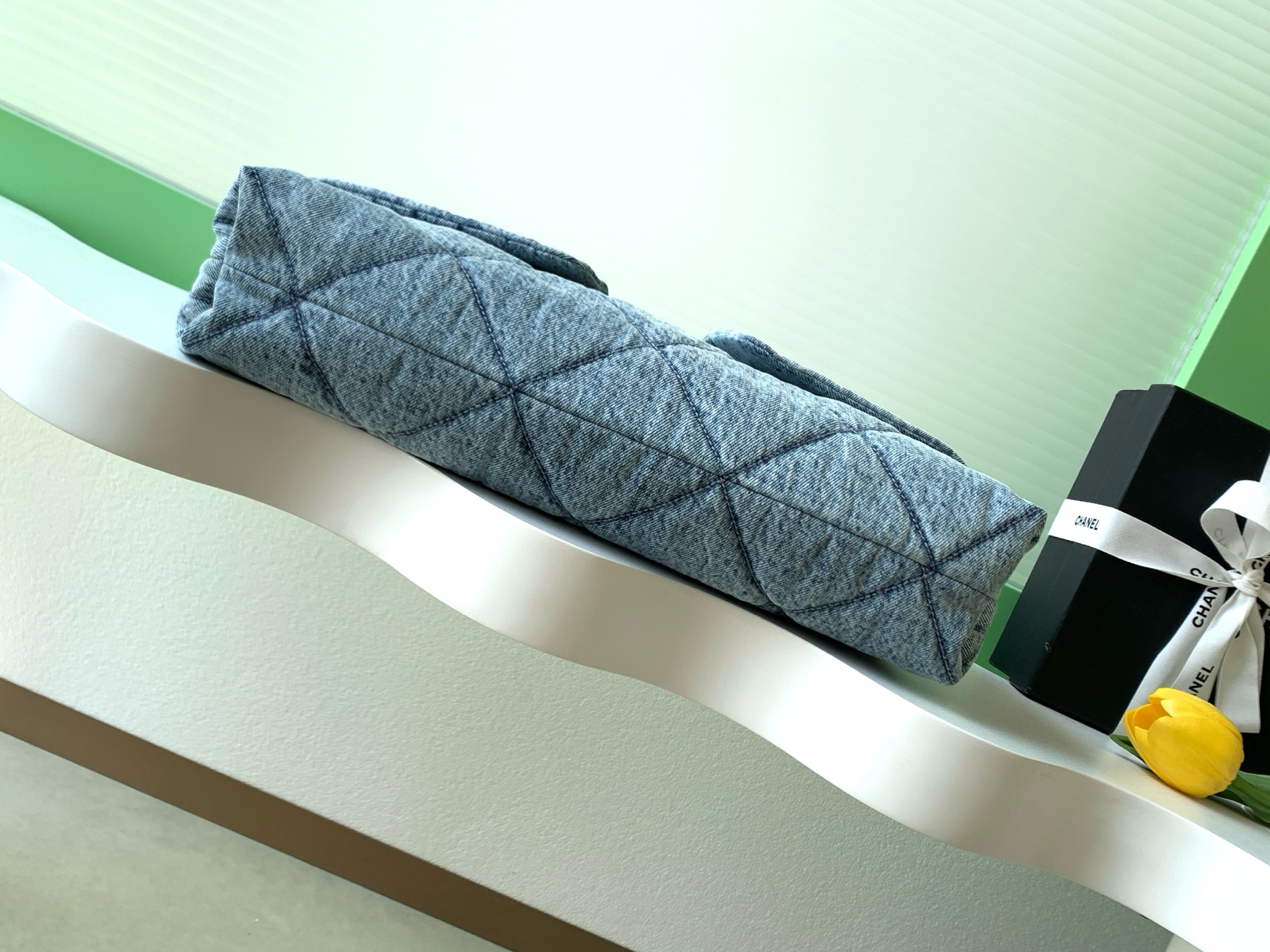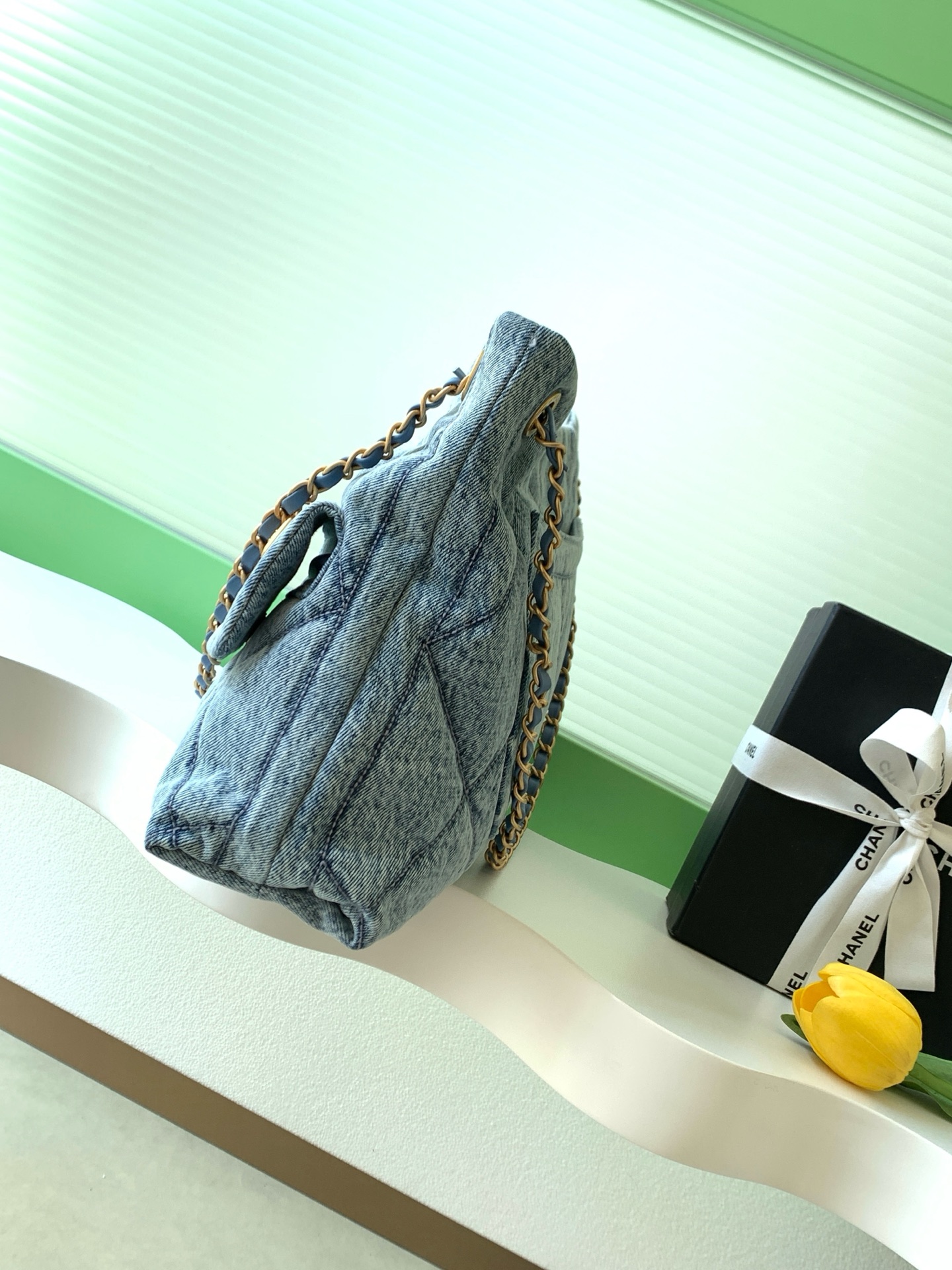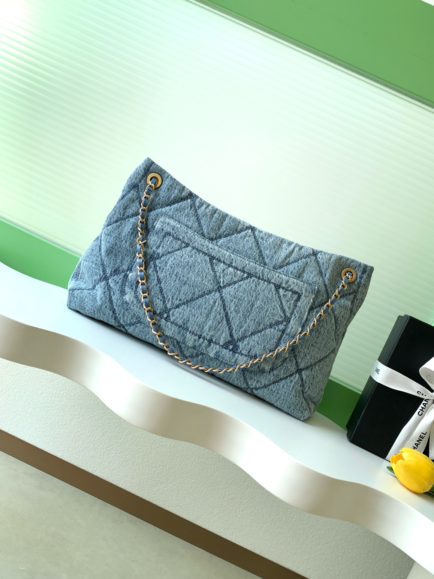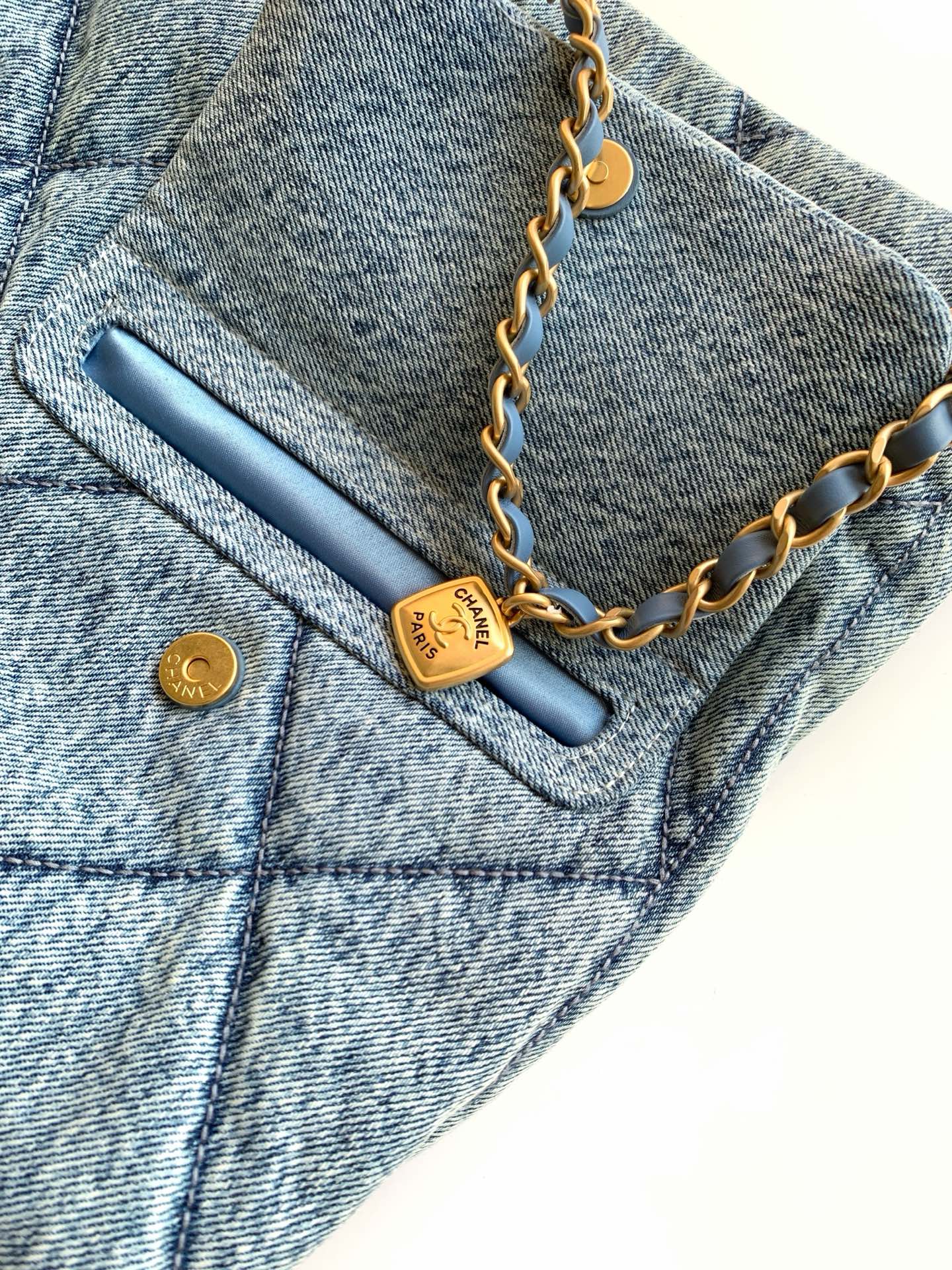 This Chanel denim bag is stunning. I've been looking for a denim bag and finally got one. The gold hardware complements the denim perfectly. It's also surprisingly spacious. A great addition to my collection!