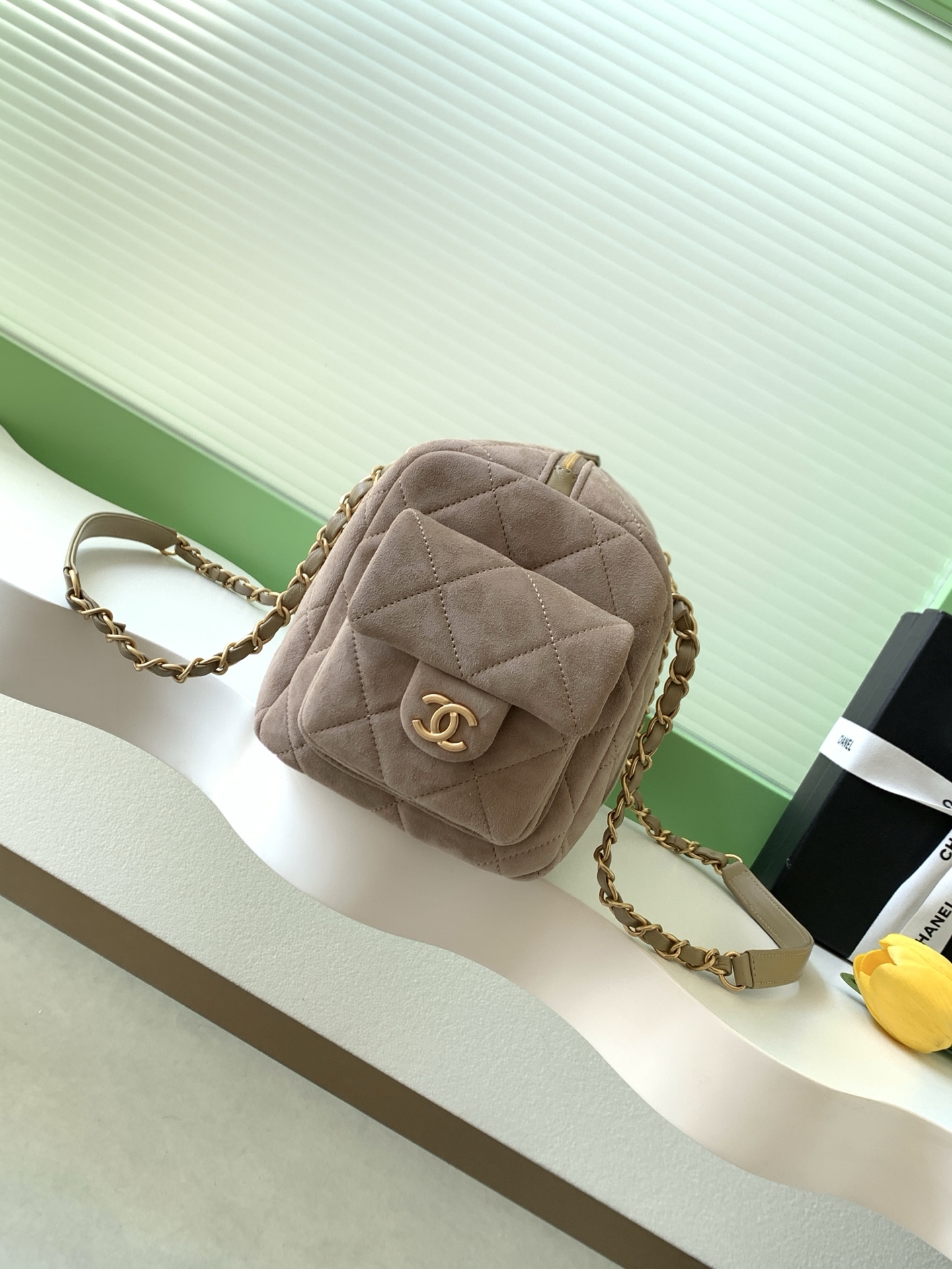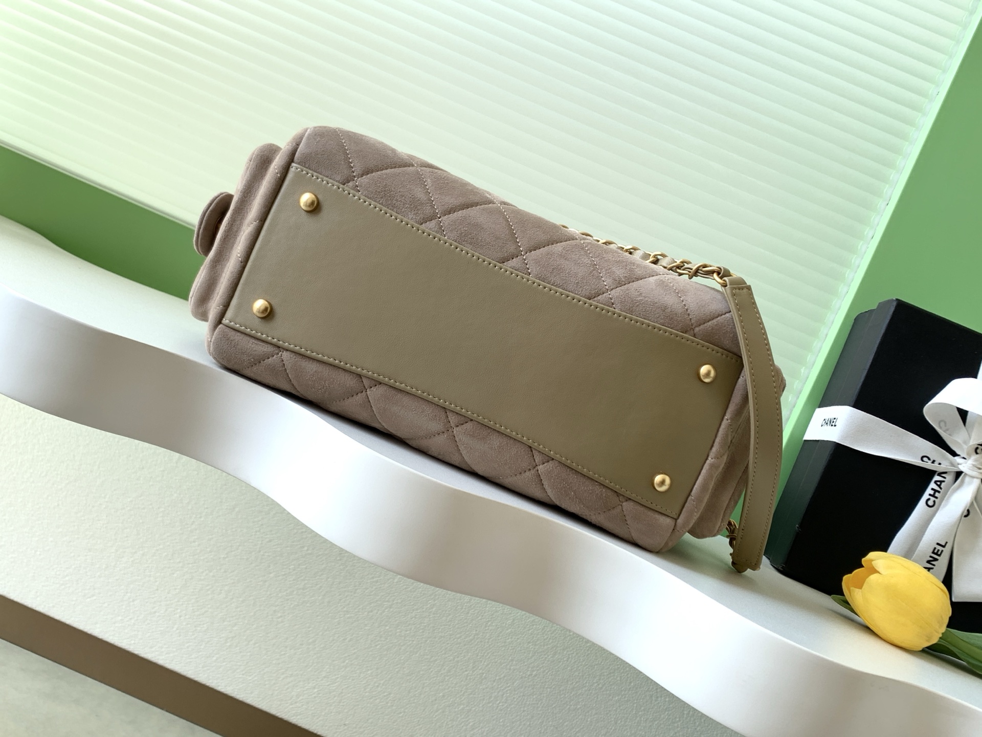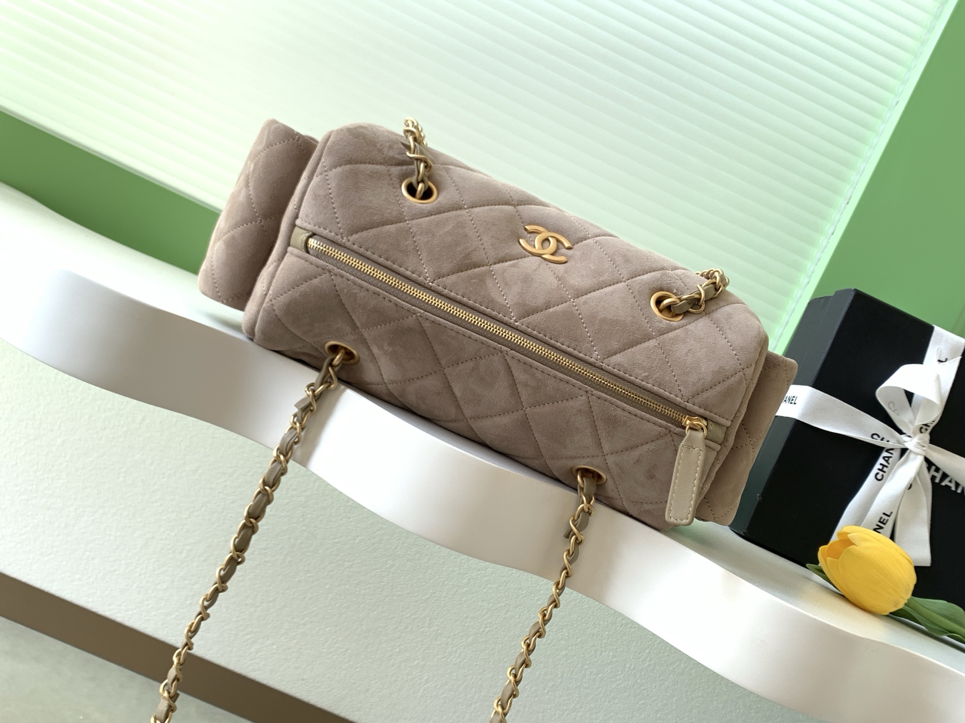 The Chanel bowling bag is a must-have for any fashion lover. The suede material is luxurious and the brushed gold hardware adds a touch of elegance. It's the perfect bag for everyday use or special occasions.