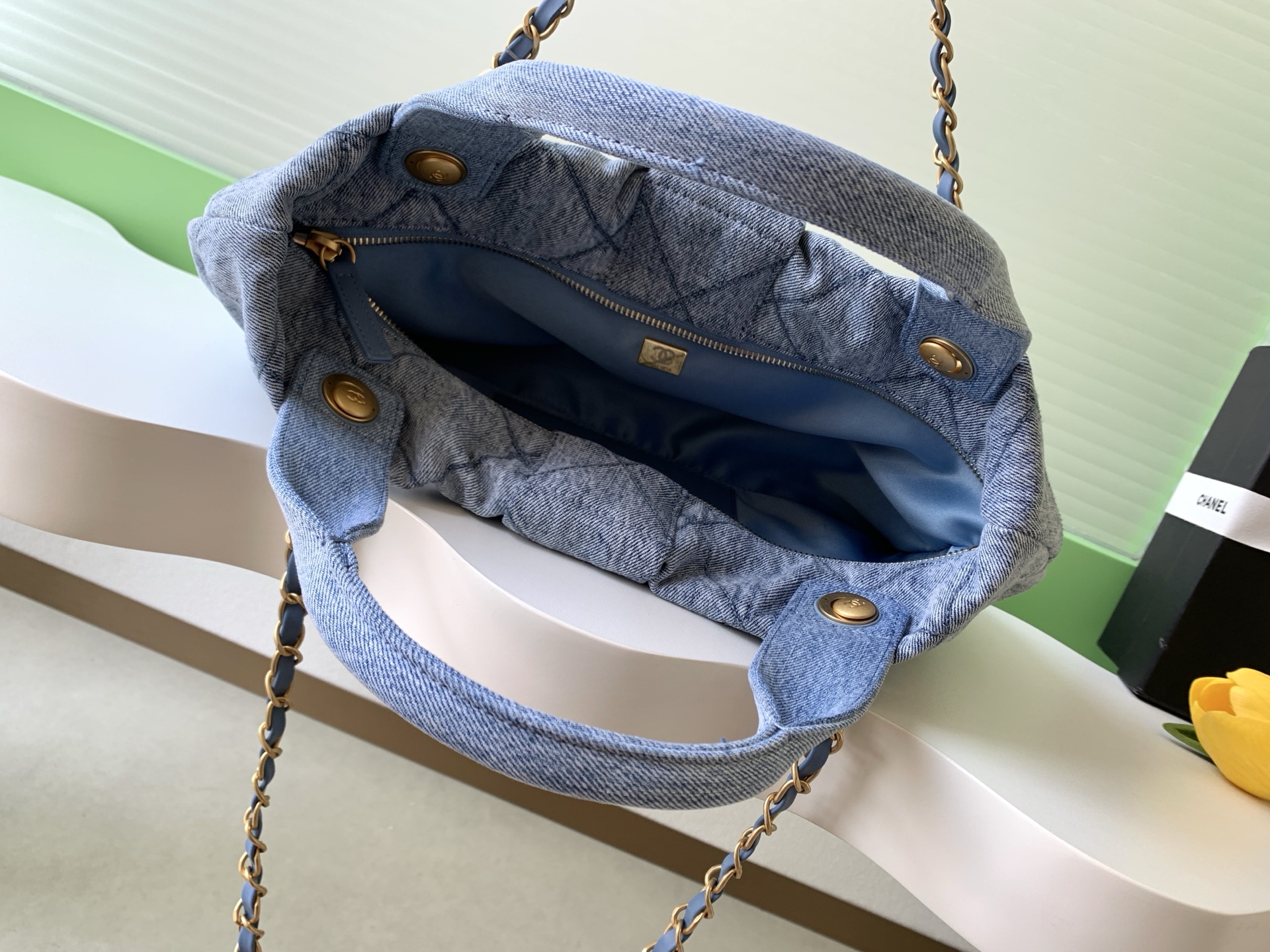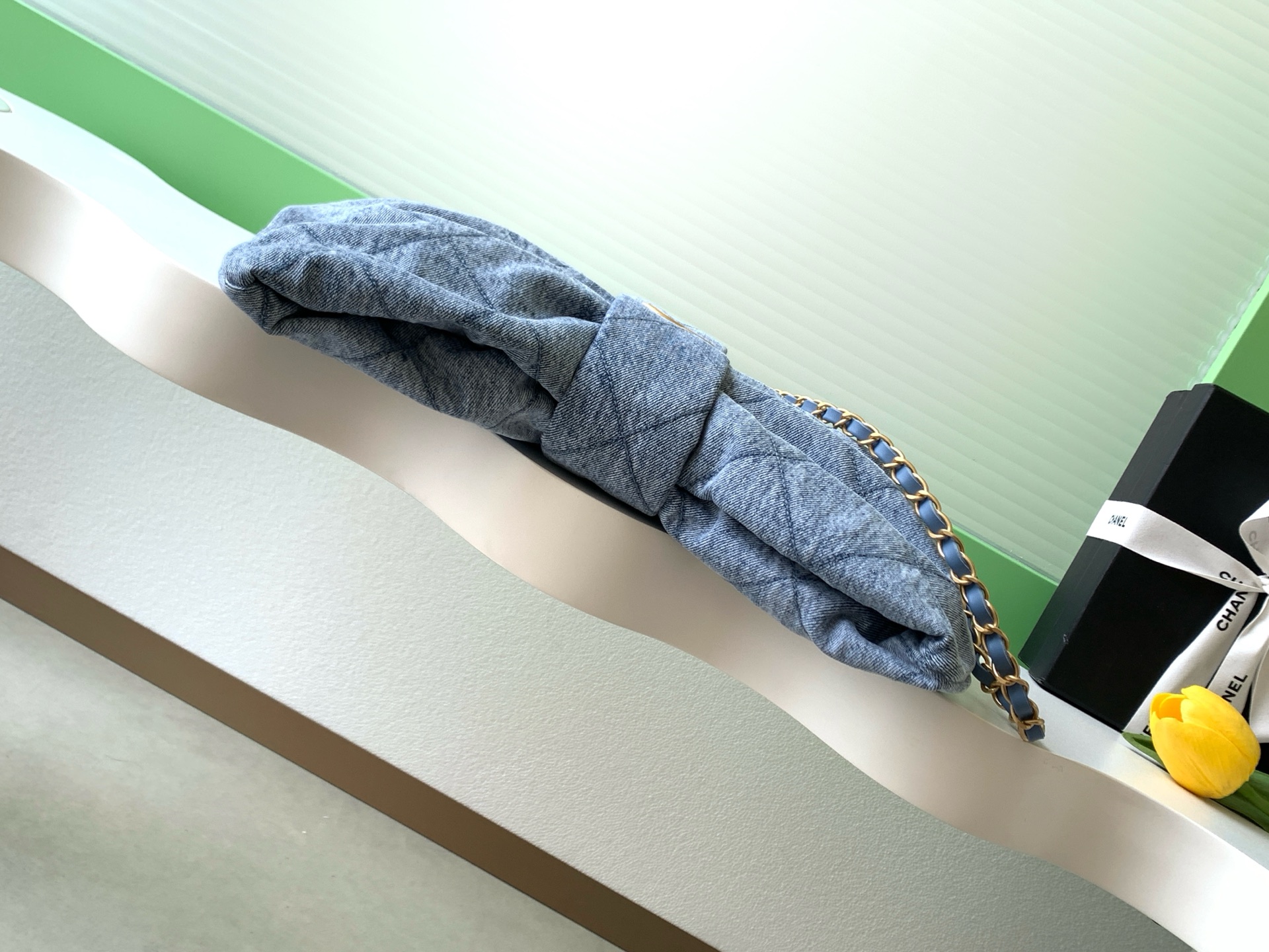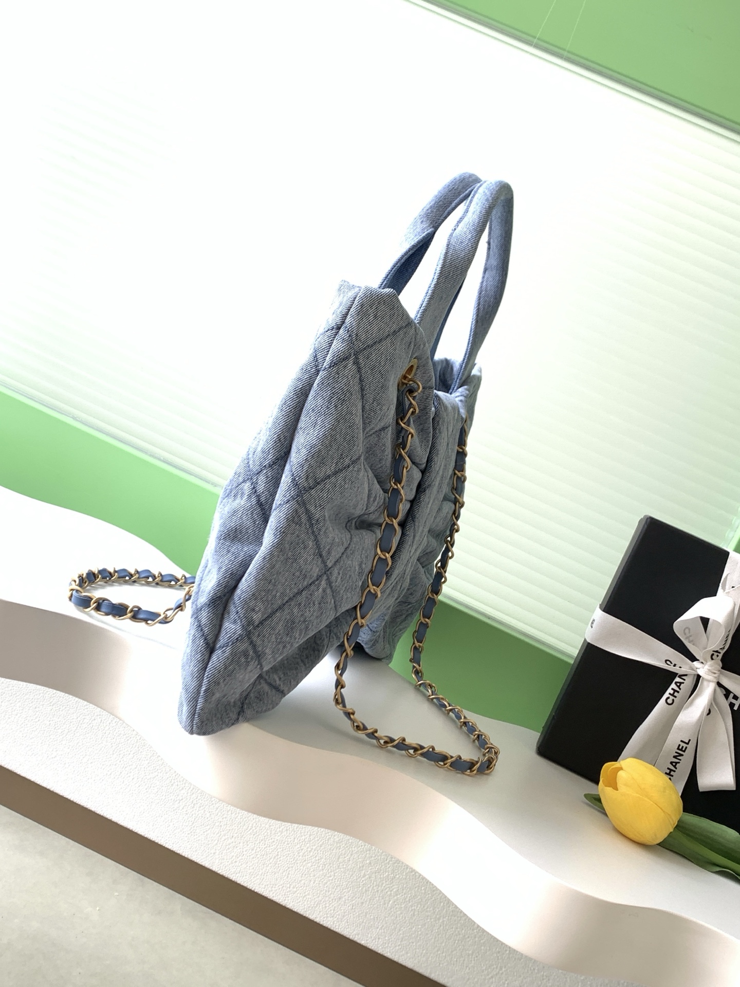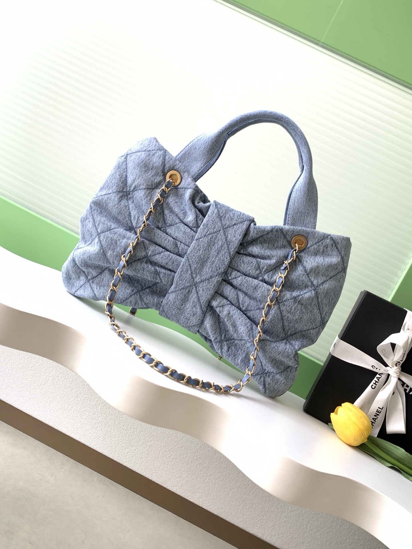Tags: Chanel Bow Bag, Designer Denim Bag, Flap Chain Bag, Lightweight Shoulder Bag, Stylish Tote Bag