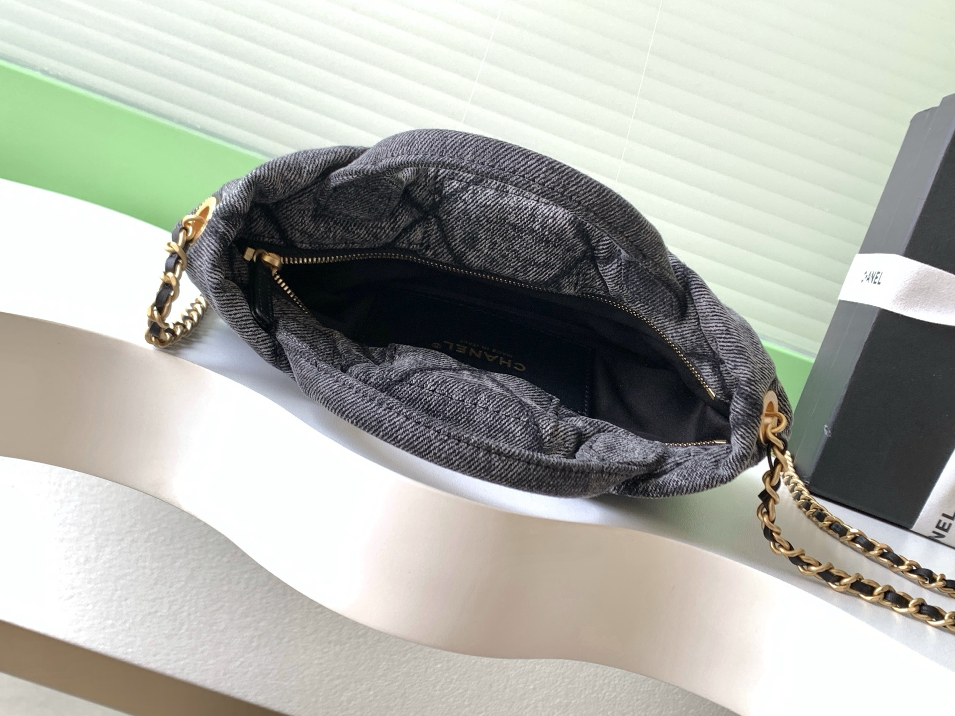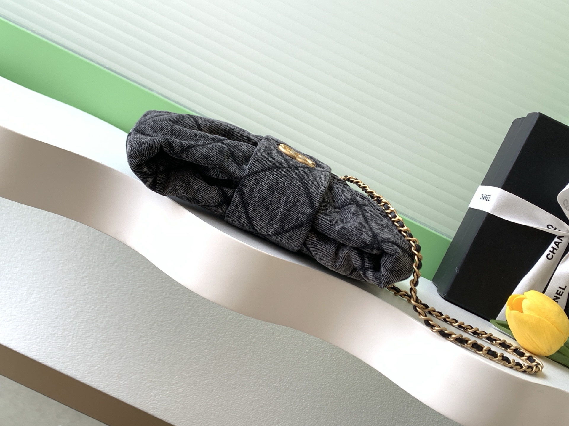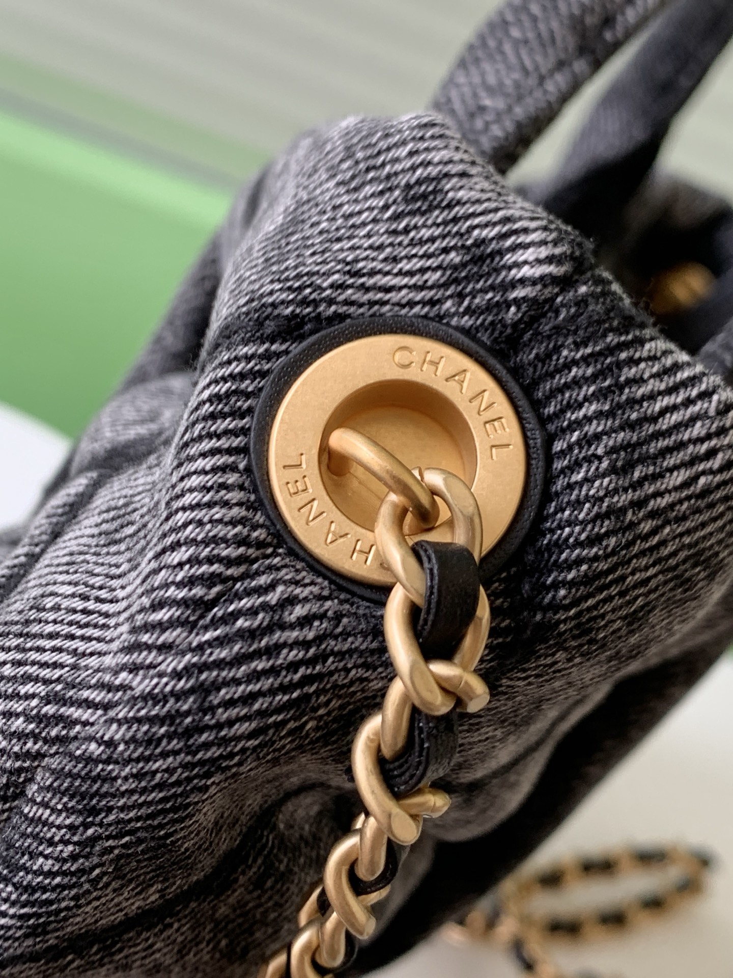 Elevate your style with this Chanel denim flap bag! Features a chic bow, chain strap, and signature luxury. Size: 18-26-5 cm. Model: AS5849.