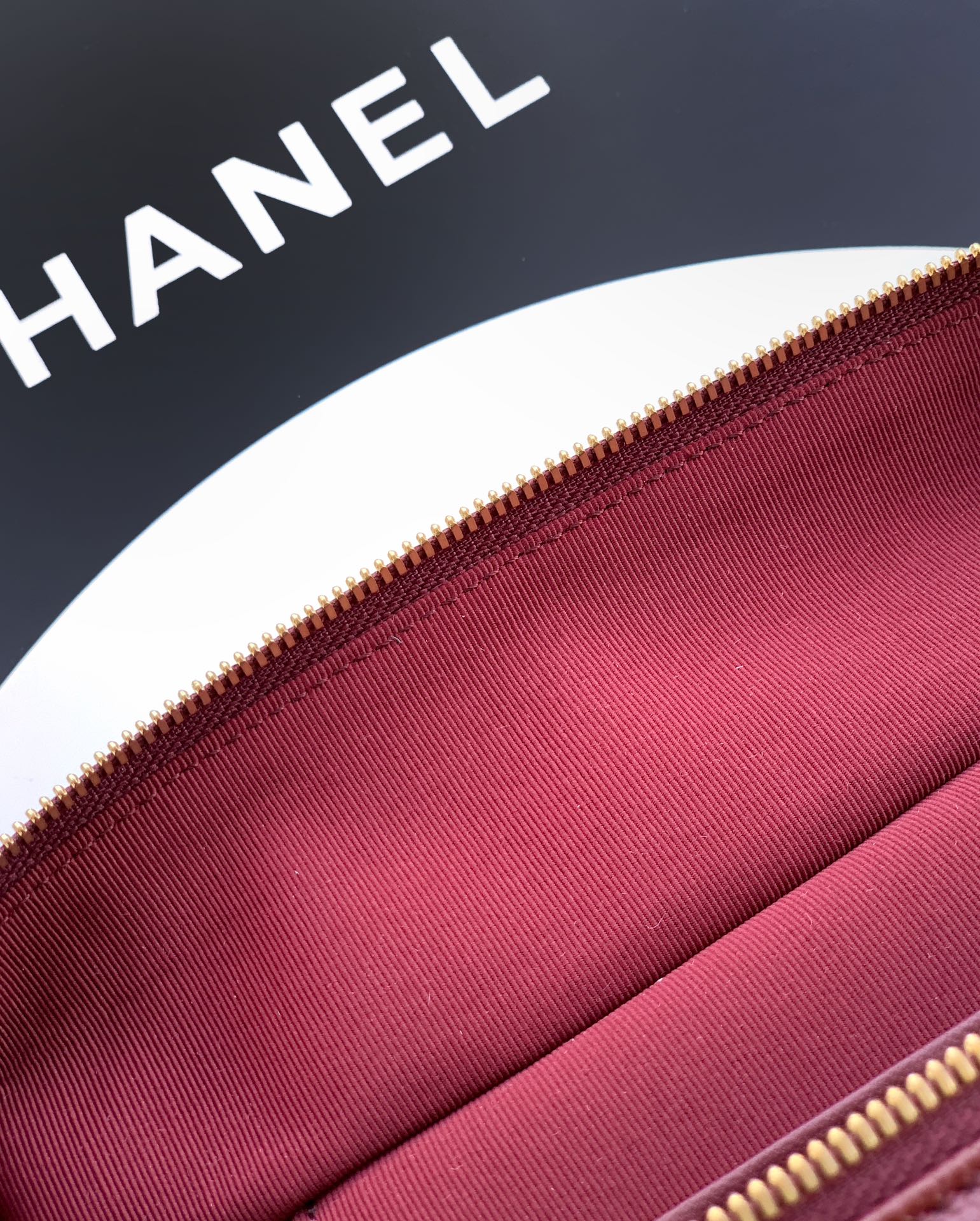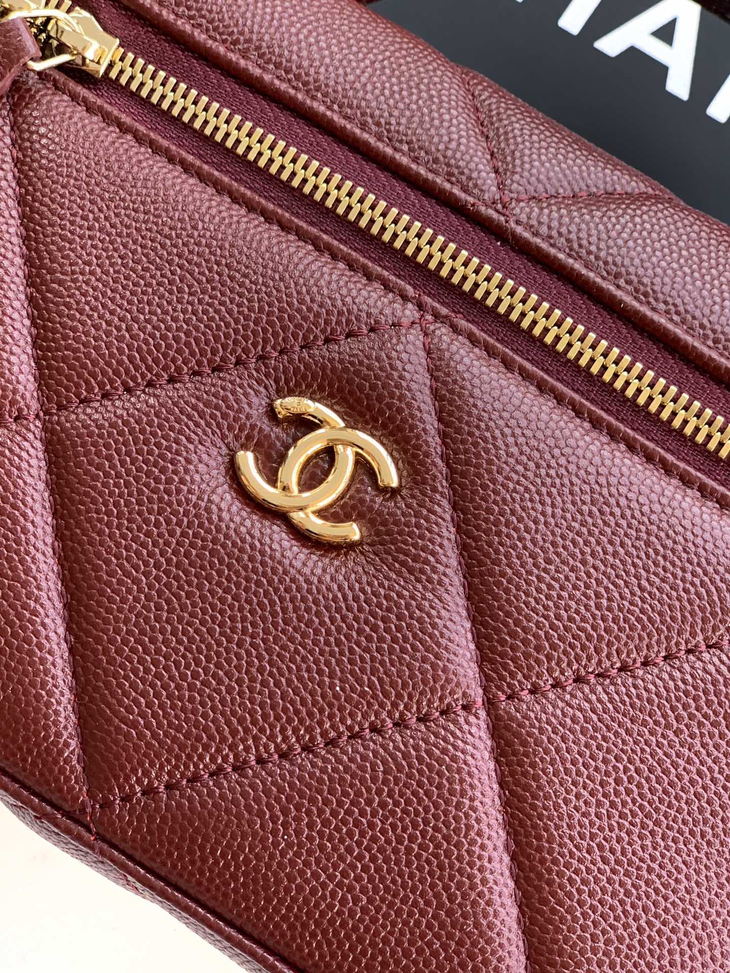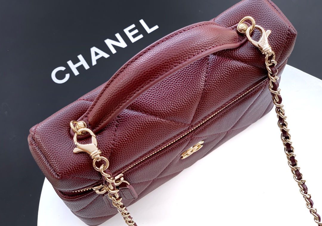 Elegant Chanel wine red leather vanity bag featuring a diamond quilted pattern and gold-tone hardware. Compact yet spacious for daily essentials.