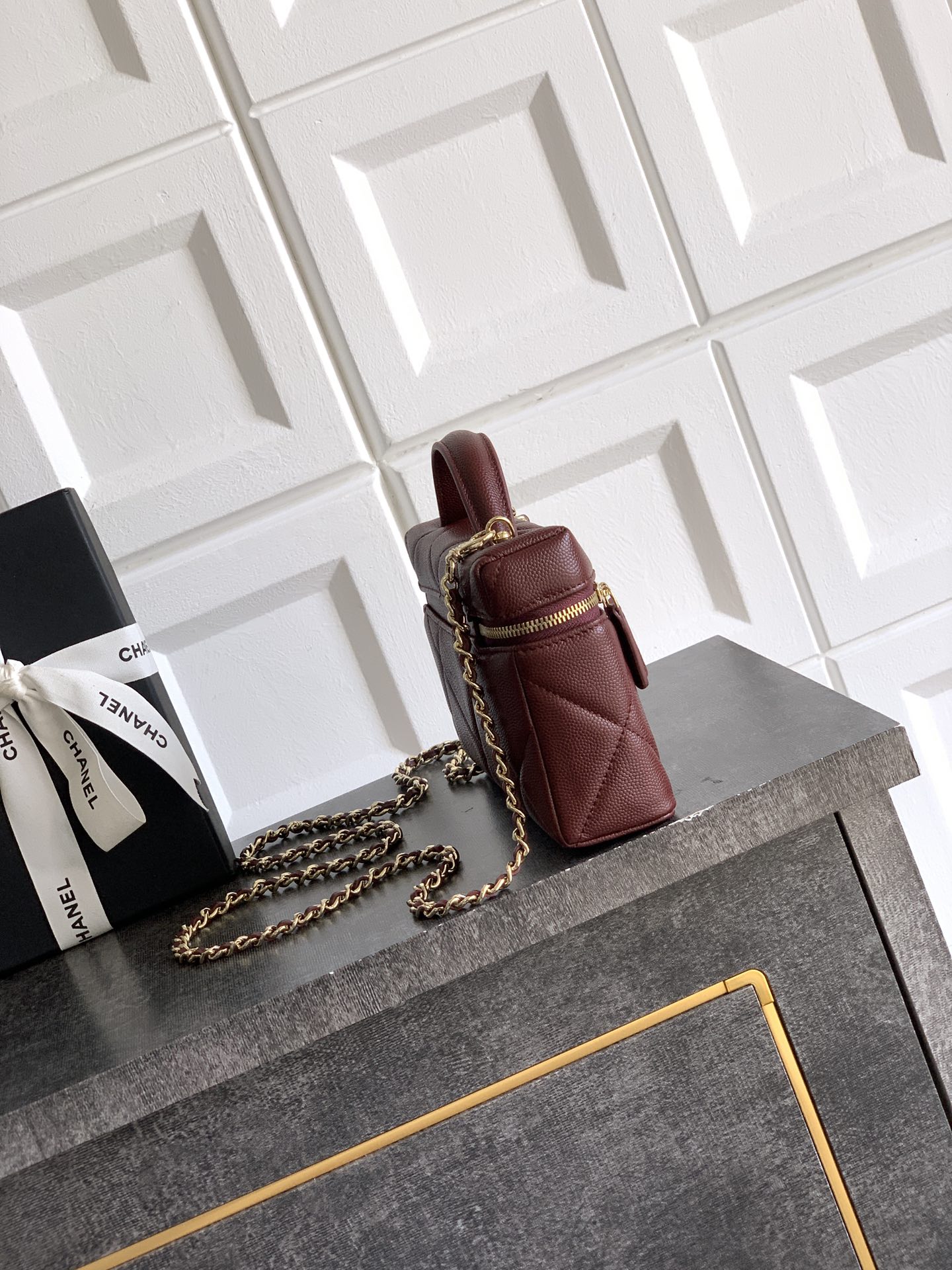 Tags: Chain Strap Bag, Chanel Vanity Case, Designer Vanity Bag, Luxury Leather Handbag, Quilted Handbag, Wine Red Leather Bag