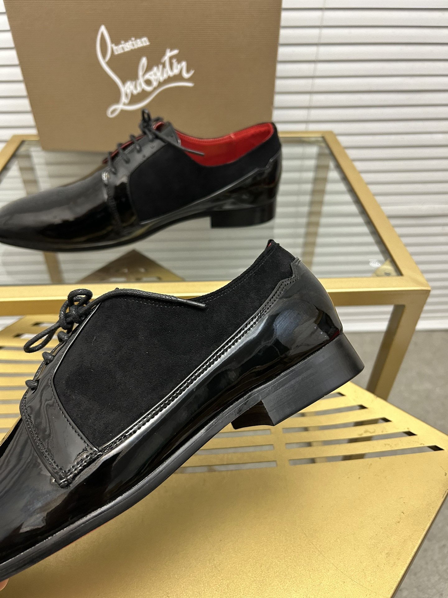 Introducing the classic elegance of Christian Louboutin with these striking black leather lace-up dress shoes. These shoes are designed to make a statement, blending luxury with timeless style.