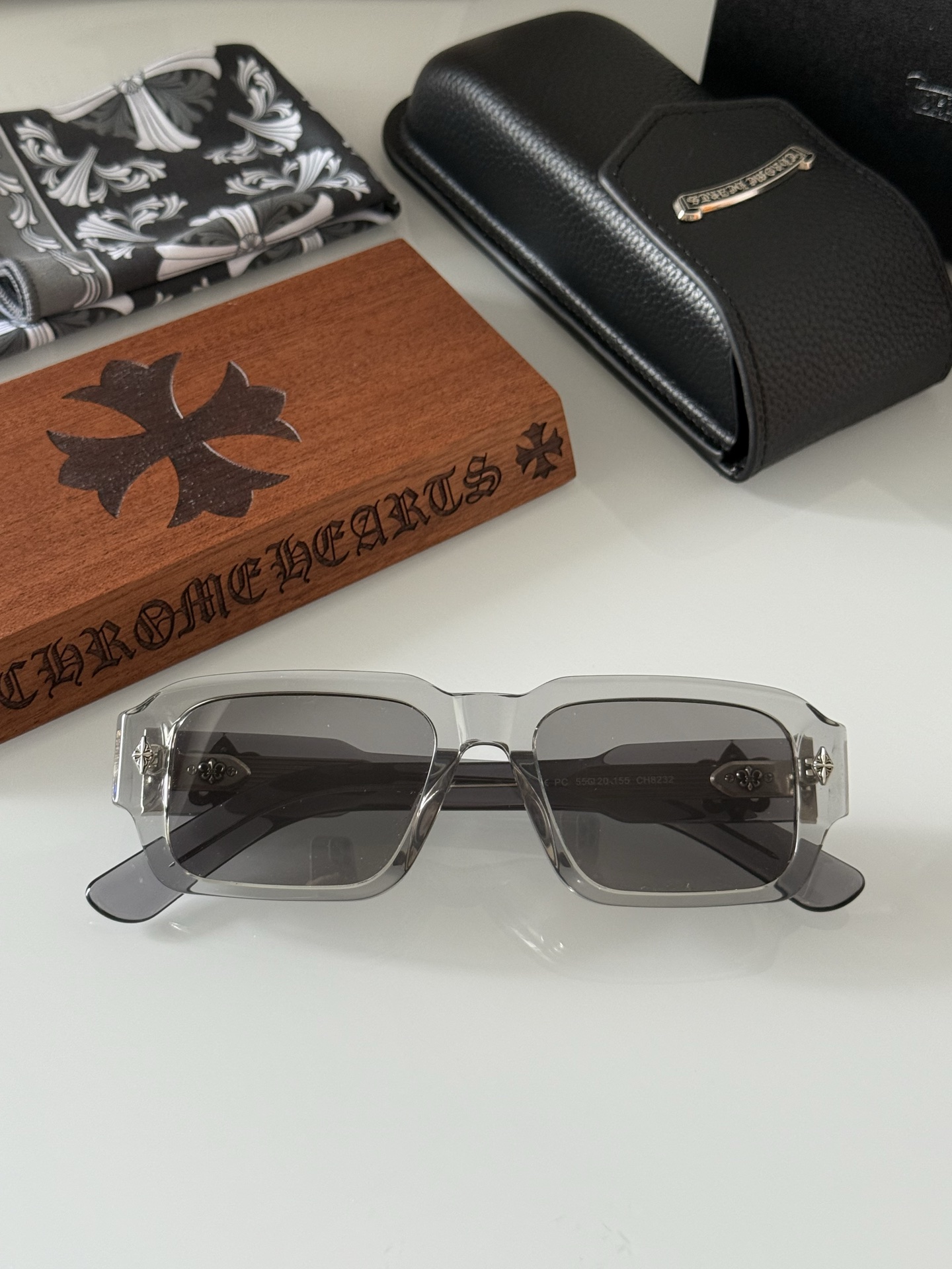 Elevate your style with these CHROME HEART retro sunglasses, featuring a small narrow frame, chunky edge, and classic logo. Size: 55-20-155.