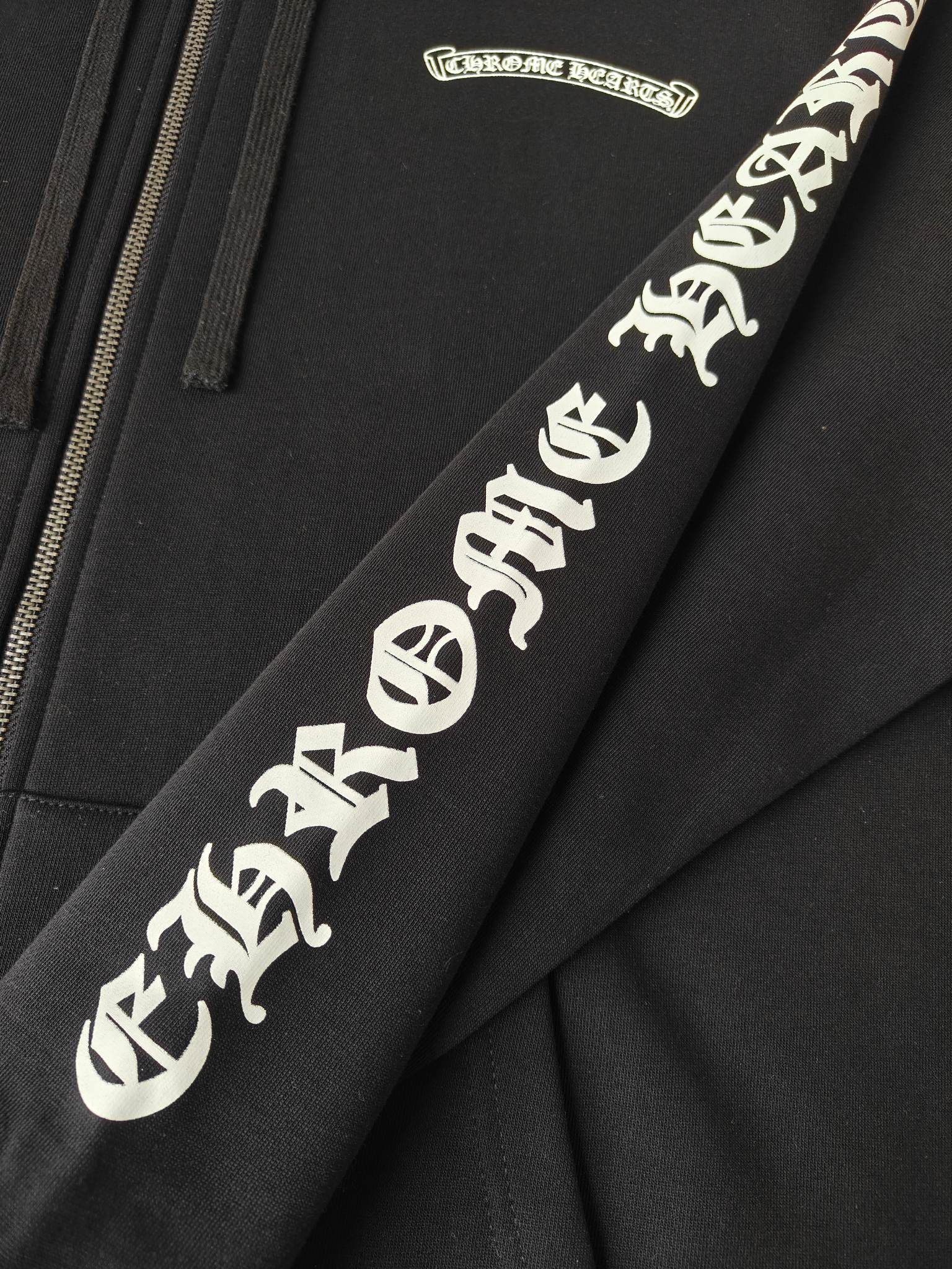 This Chrome Hearts black scroll logo zip-up hoodie is a must-have for any streetwear enthusiast. Crafted from a premium 420g cotton blend with a soft, brushed interior, this hoodie offers both comfort and style. The design features the iconic Chrome Hearts scroll logo on the sleeves and chest, adding a touch of edgy sophistication.