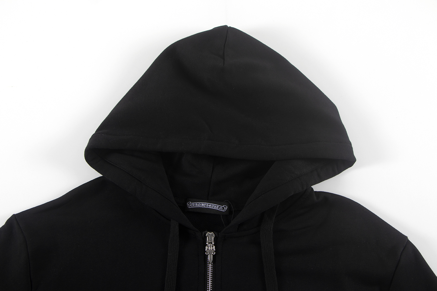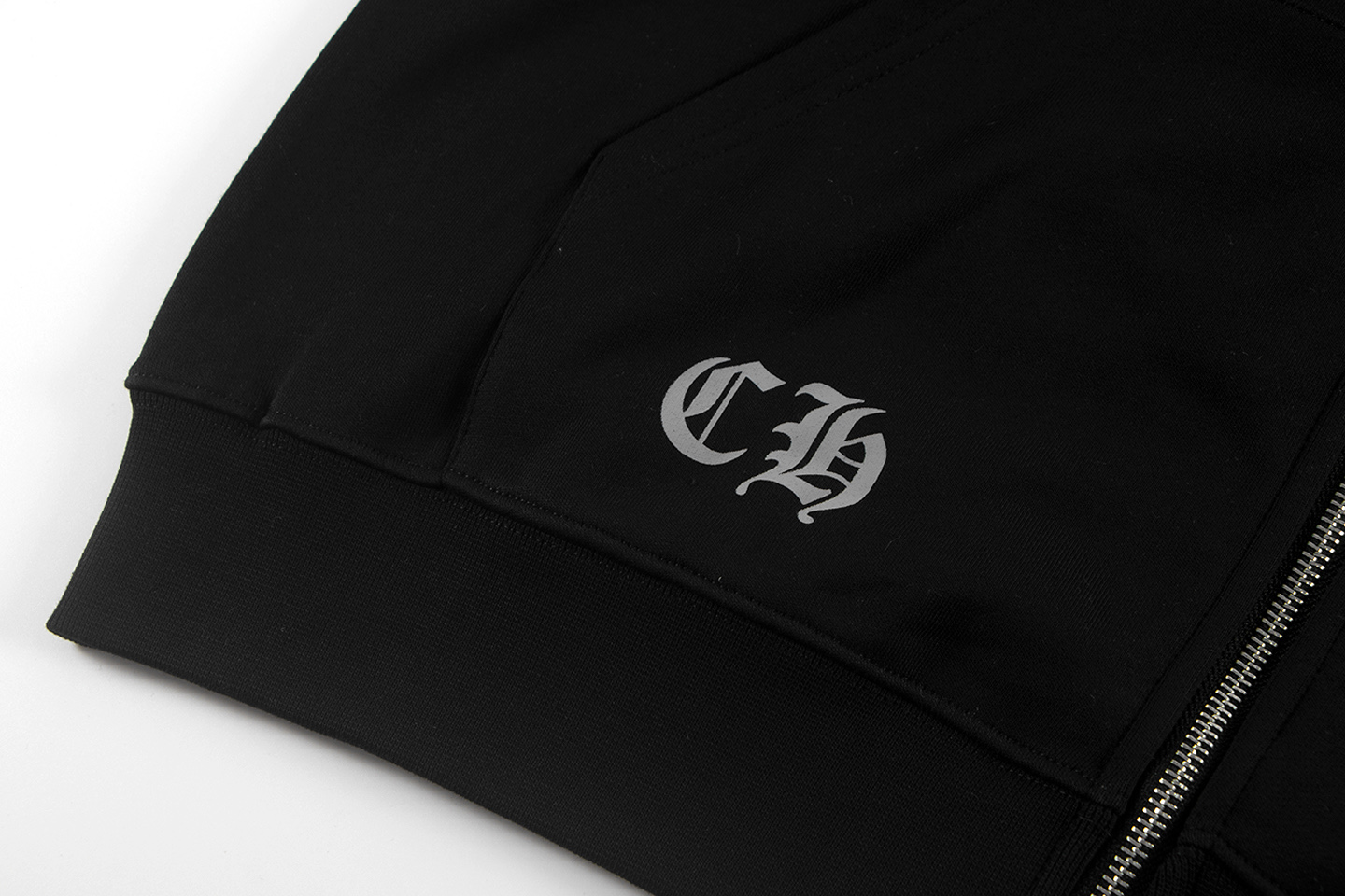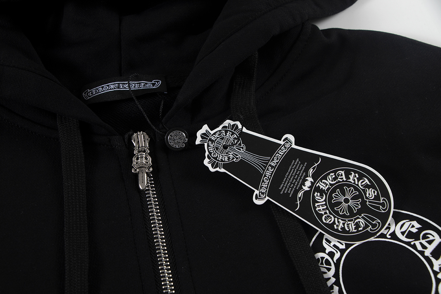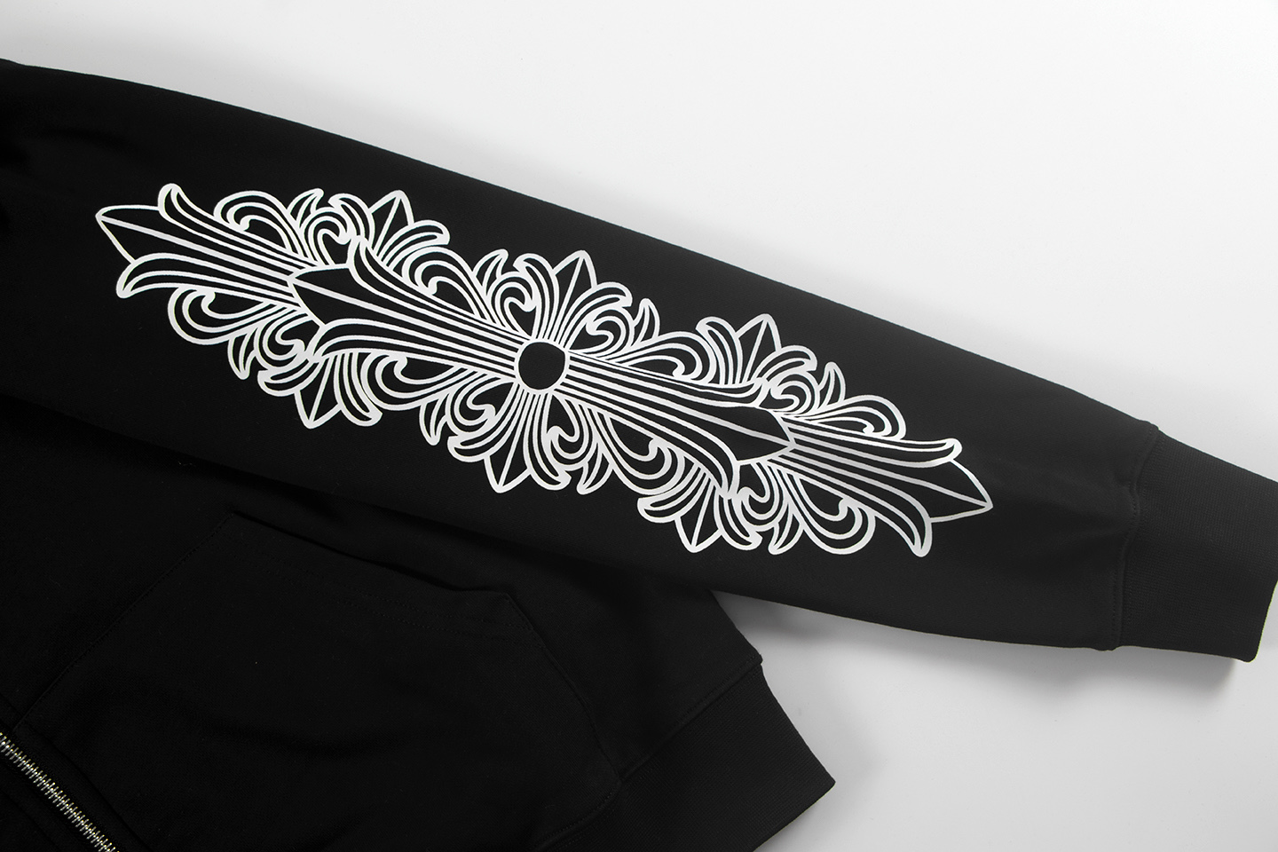 This Chrome Hearts hoodie is a stylish and comfortable addition to any wardrobe. Made from high-quality materials, this zip-up hoodie features a distinctive floral print on the arms and the iconic Chrome Hearts horseshoe logo on the chest.