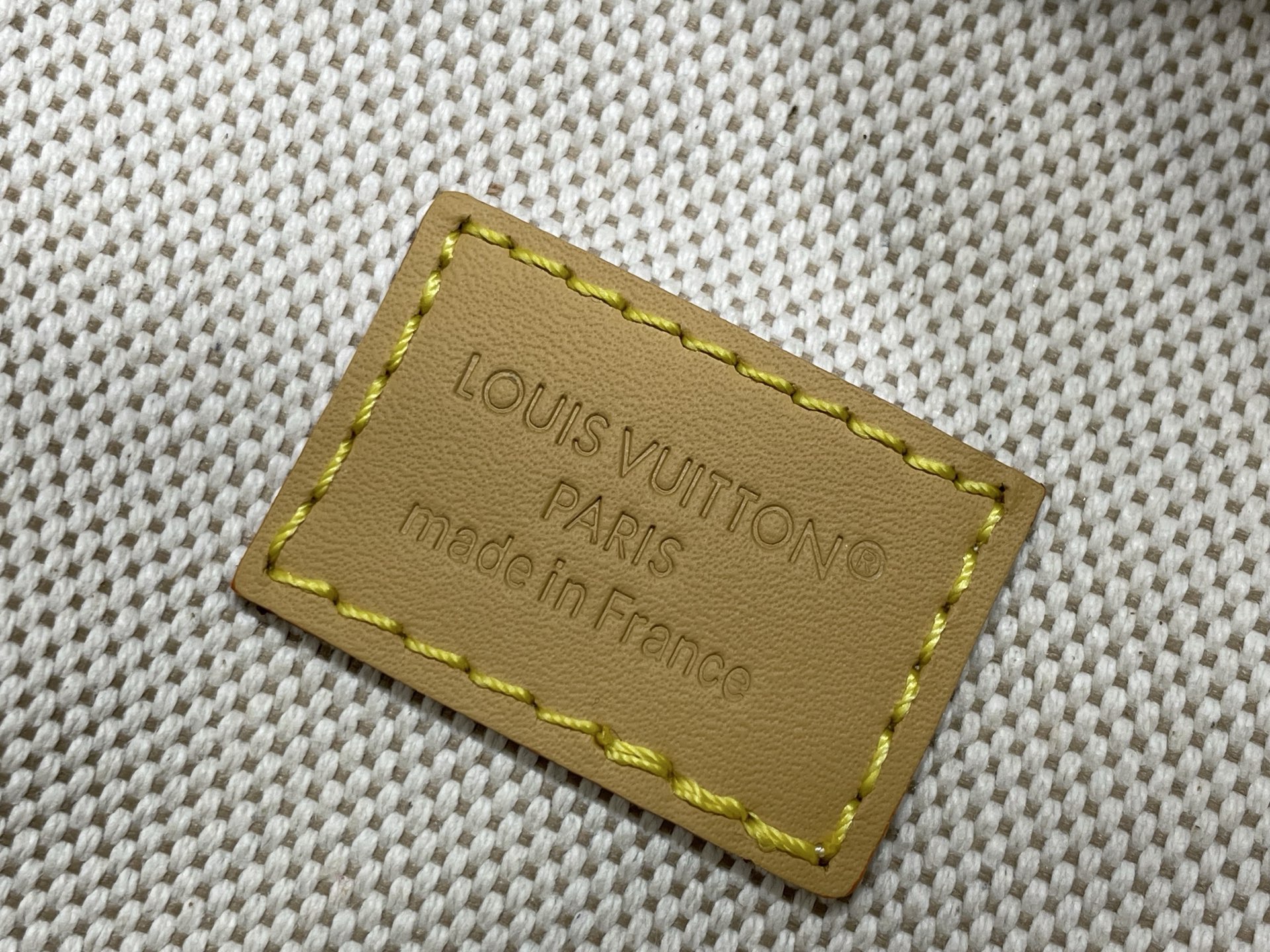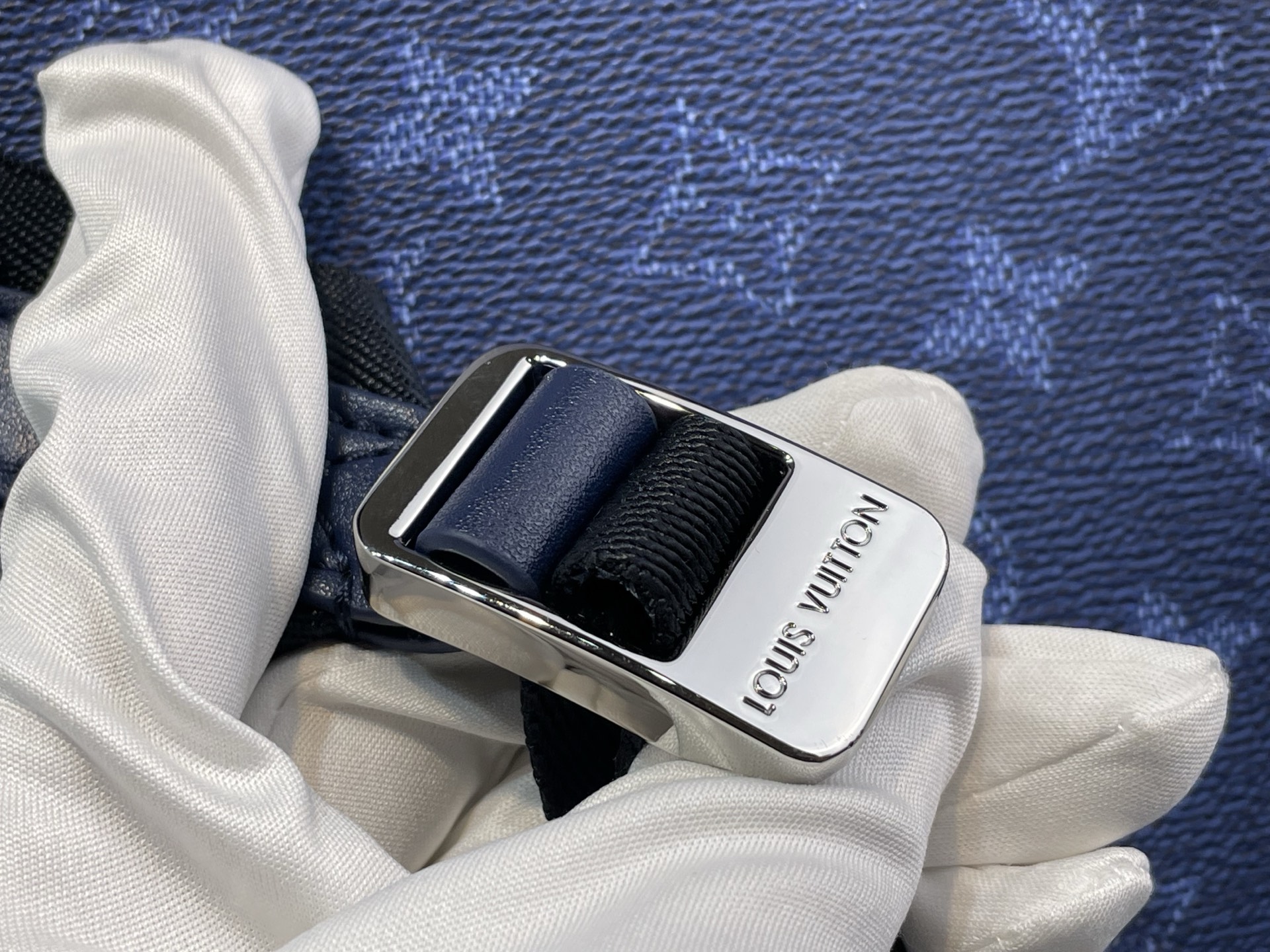 The Discovery backpack in Monogram Heritage canvas, with adjustable straps and multiple pockets, offers style and functionality.