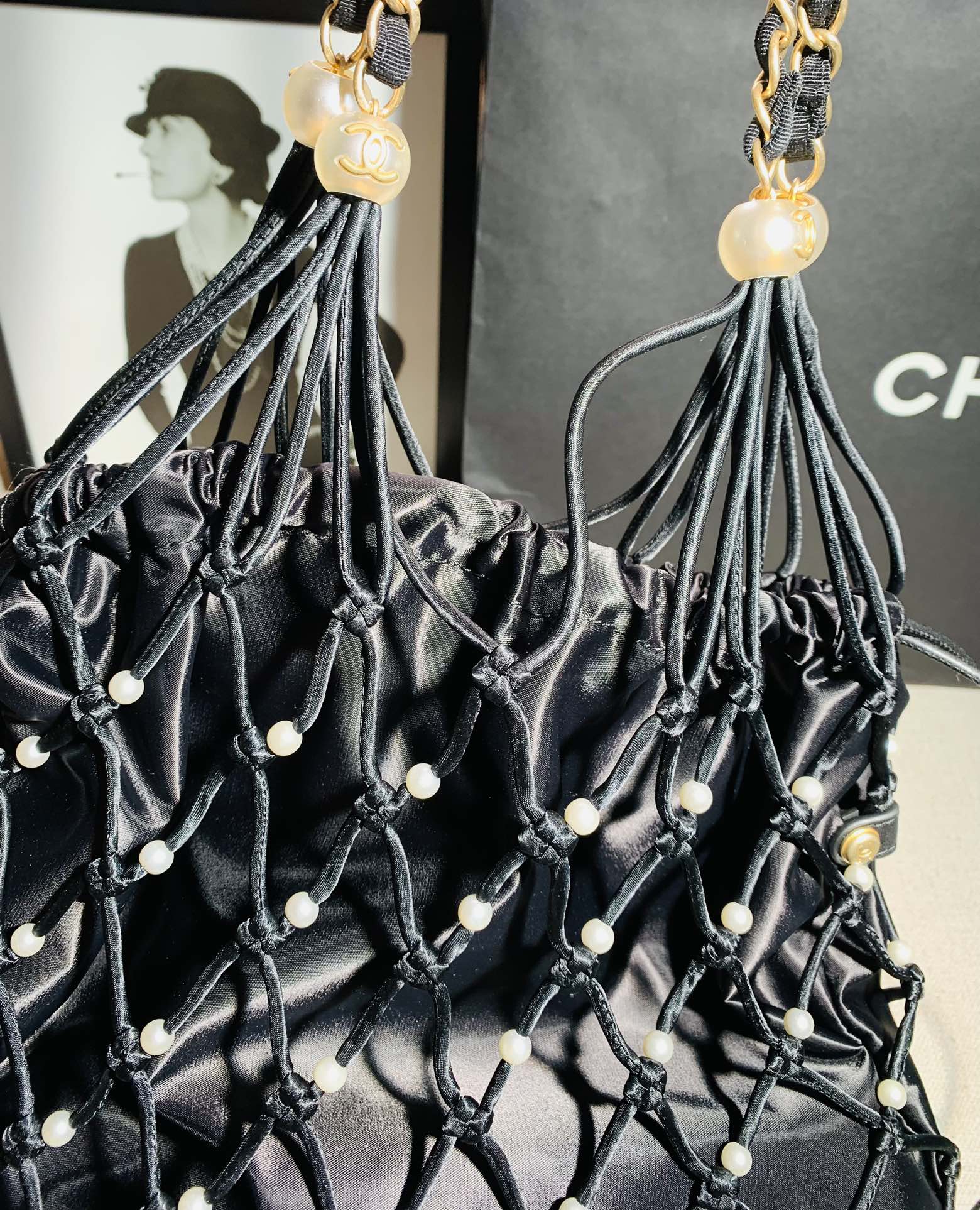 - Handle: Chain and pearl-embellished handles