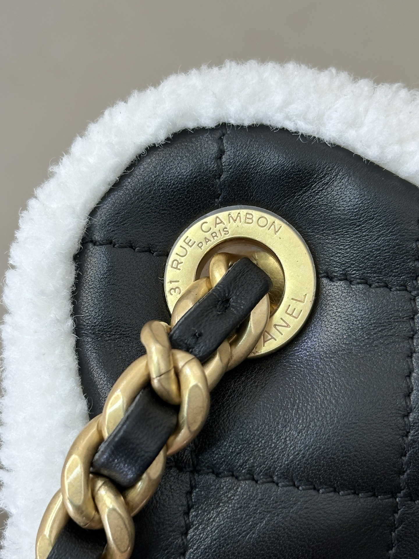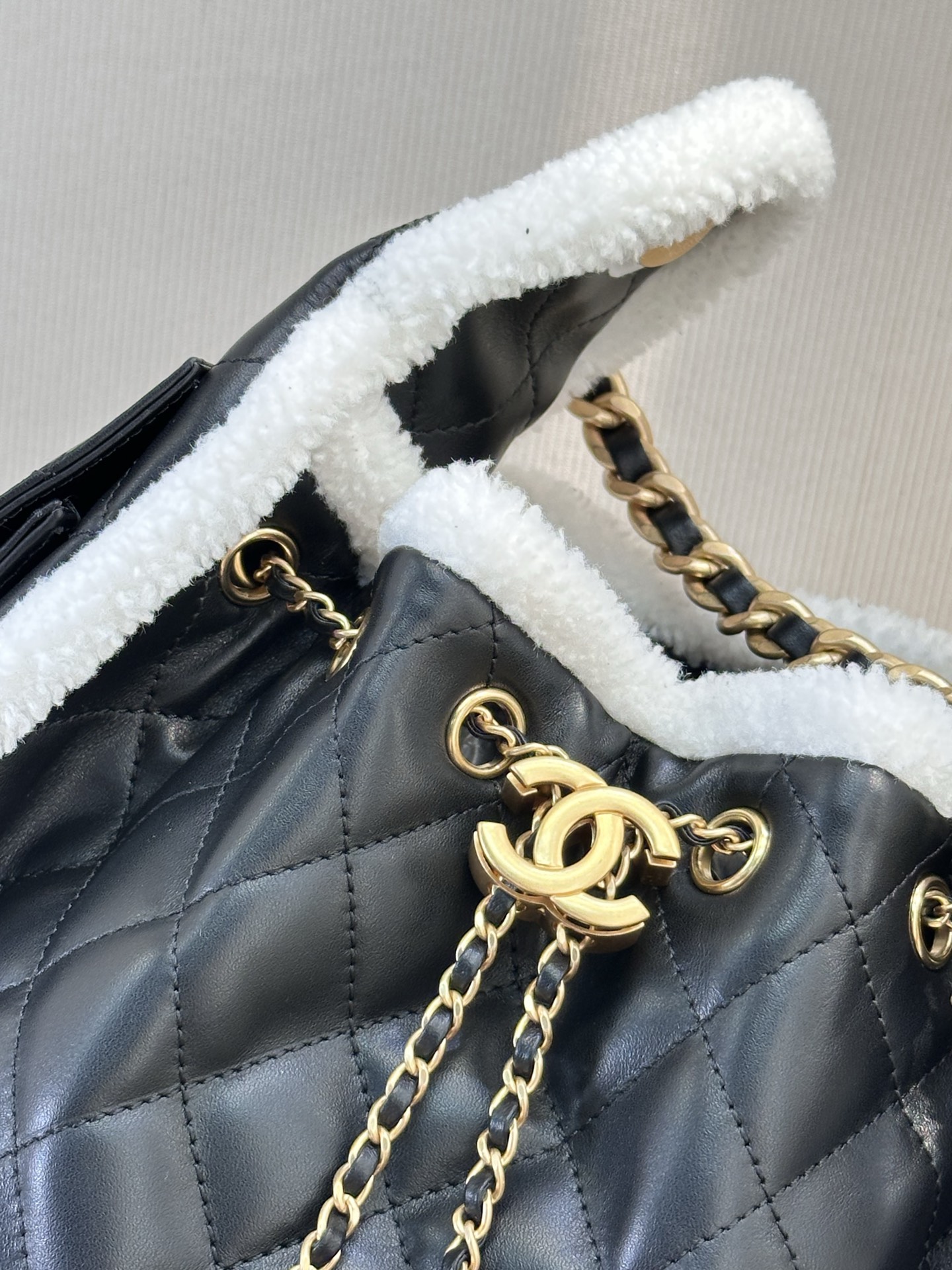 Tags: Chain Detail Bag, Designer Inspired Handbag, Elegant Shoulder Bag, Plush Trim Bag, Quilted Bucket Bag