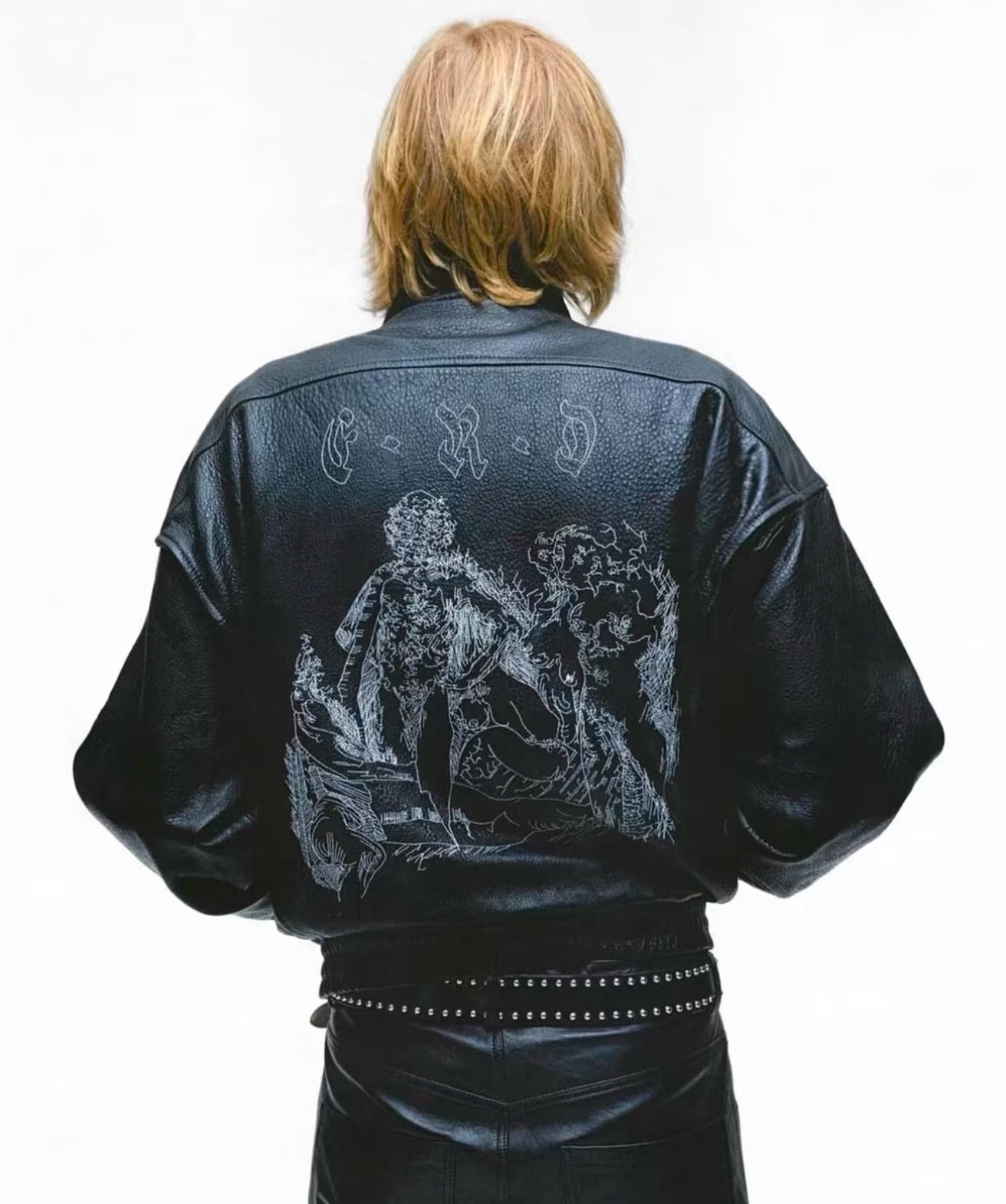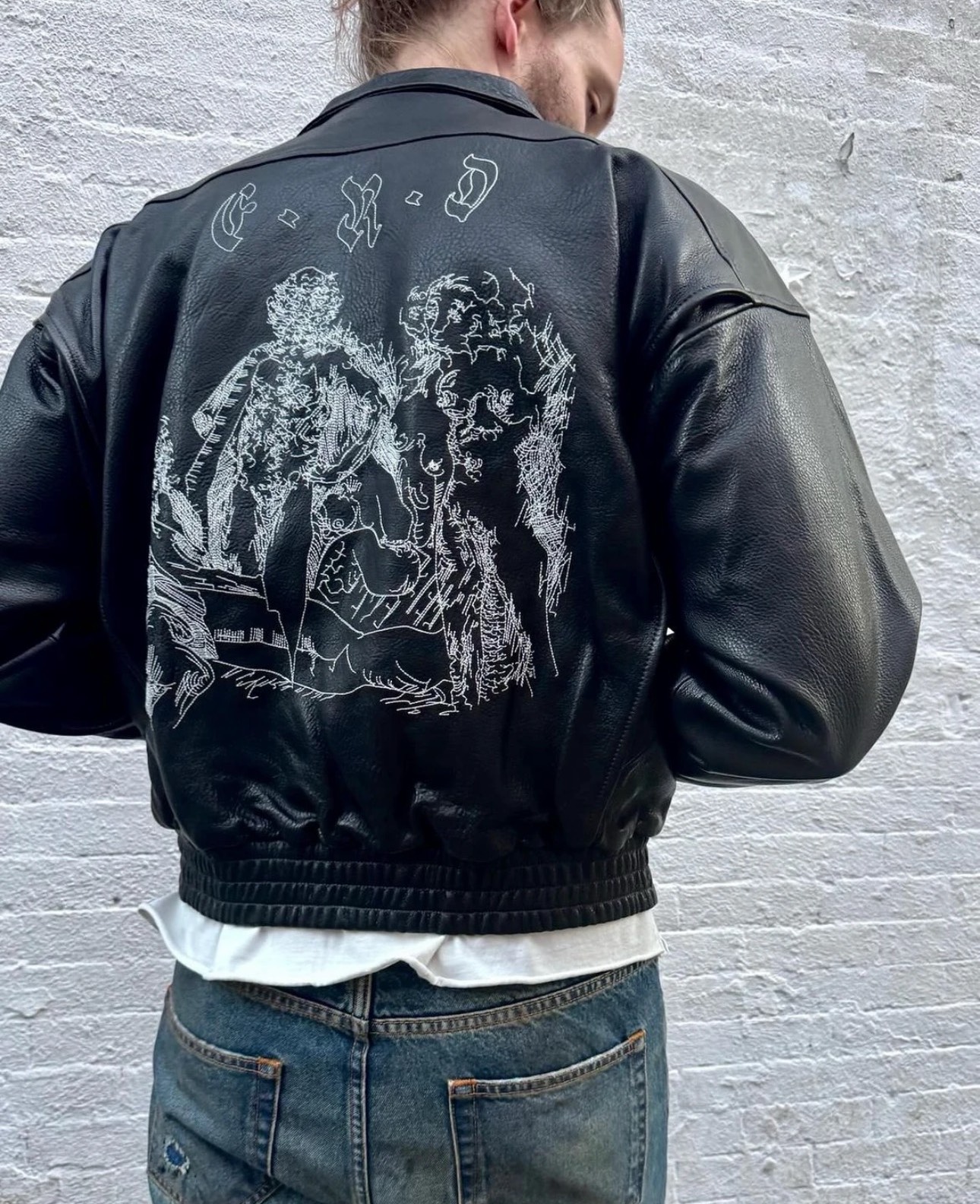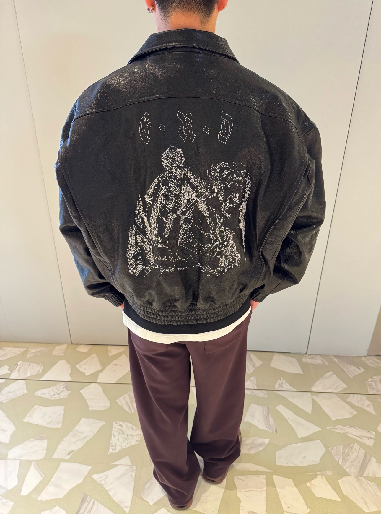 Tags: Black Leather Jacket, Designer Leather Coat, Embroidered Leather Jacket, Padded Leather Outerwear, Unisex Leather Apparel