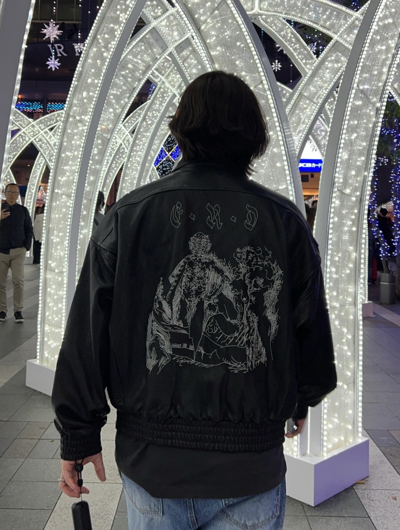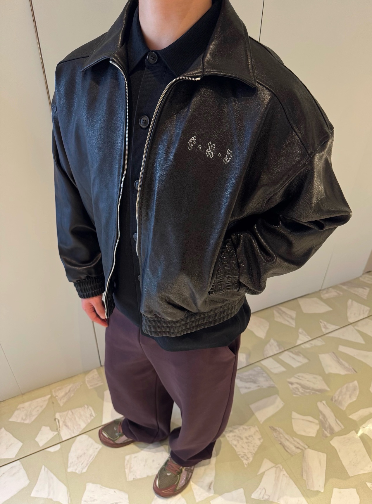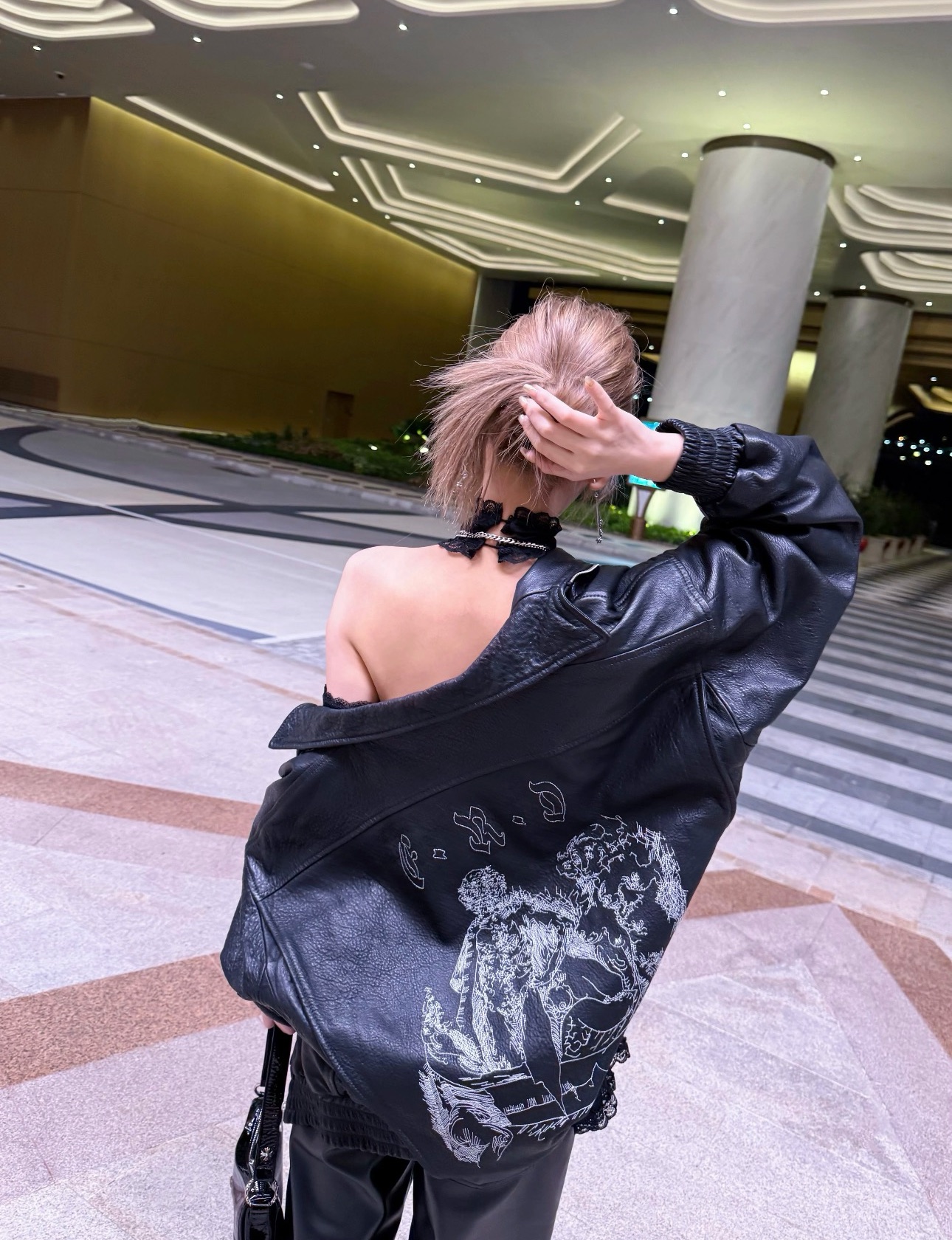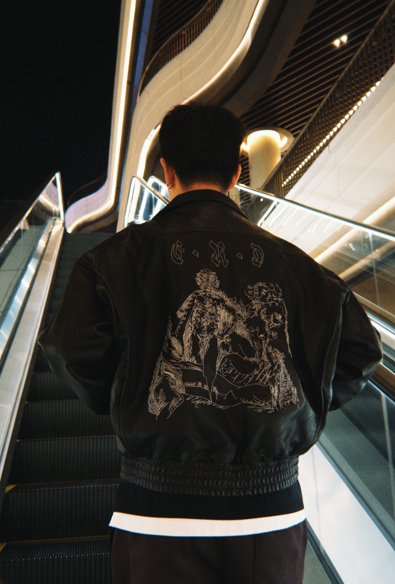 Tags: Black Leather Jacket, Designer Leather Coat, Embroidered Leather Jacket, Padded Leather Outerwear, Unisex Leather Apparel