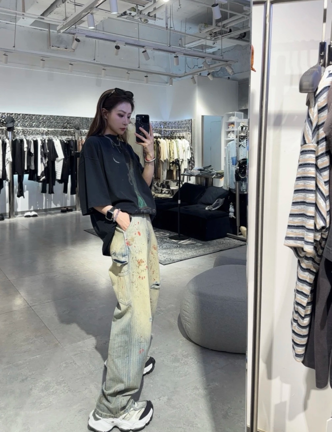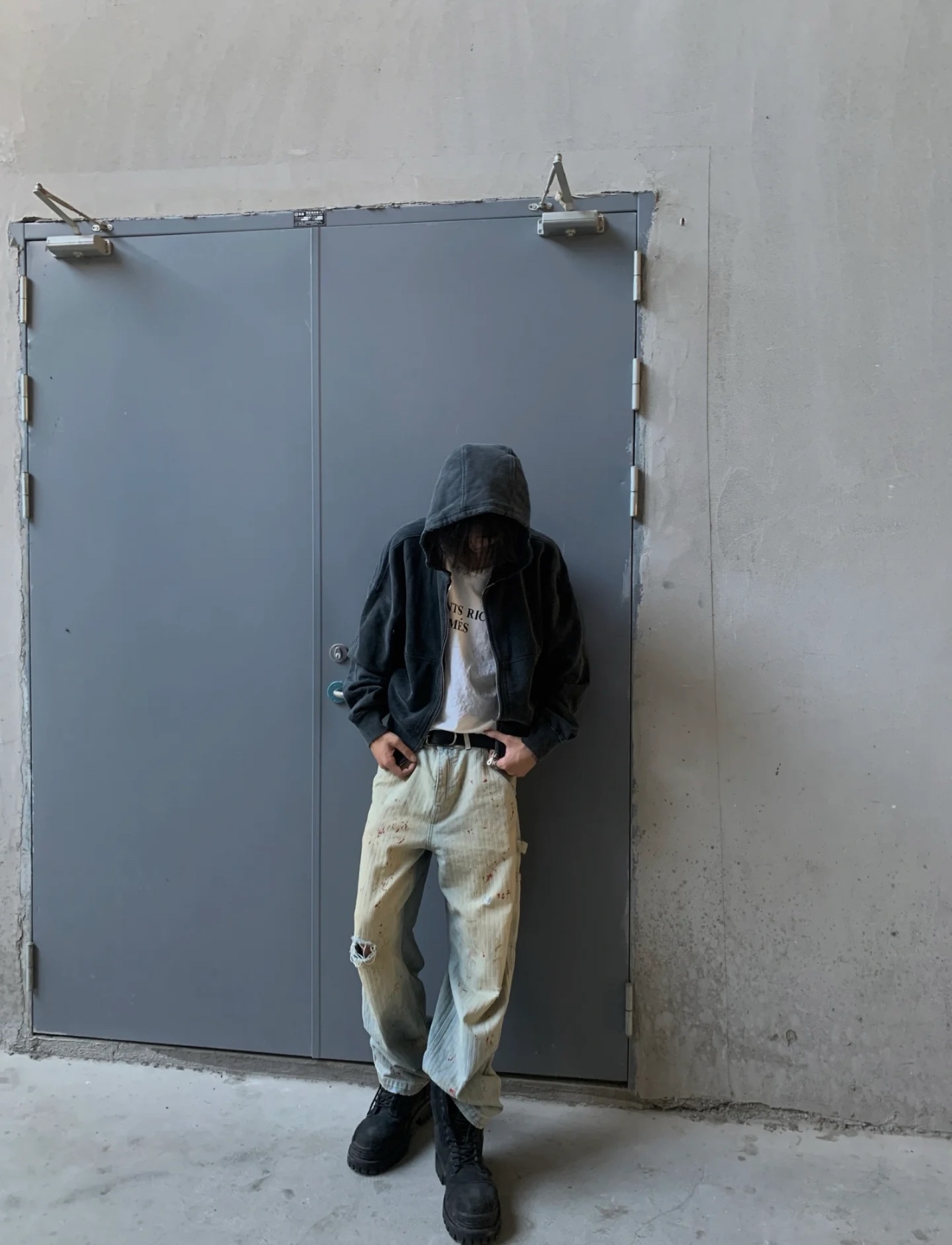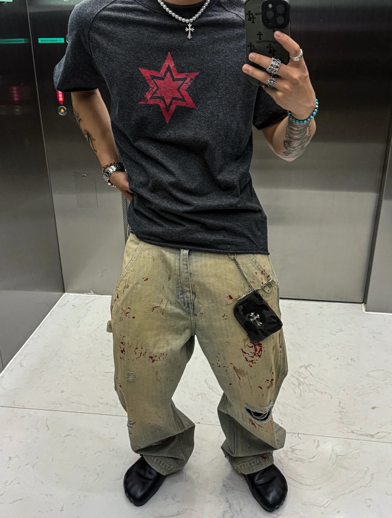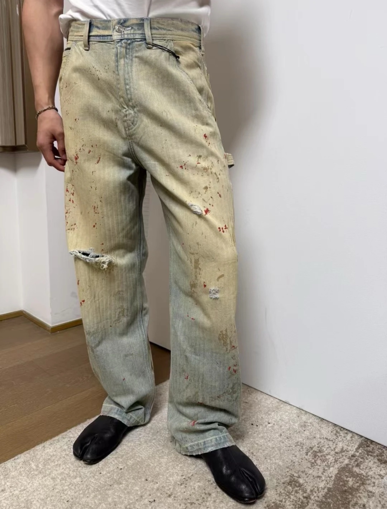 Elevate your streetwear with these E.R.D. carpenter jeans. Features a distressed, paint-splattered design in a relaxed fit. Durable denim for a unique, edgy style.