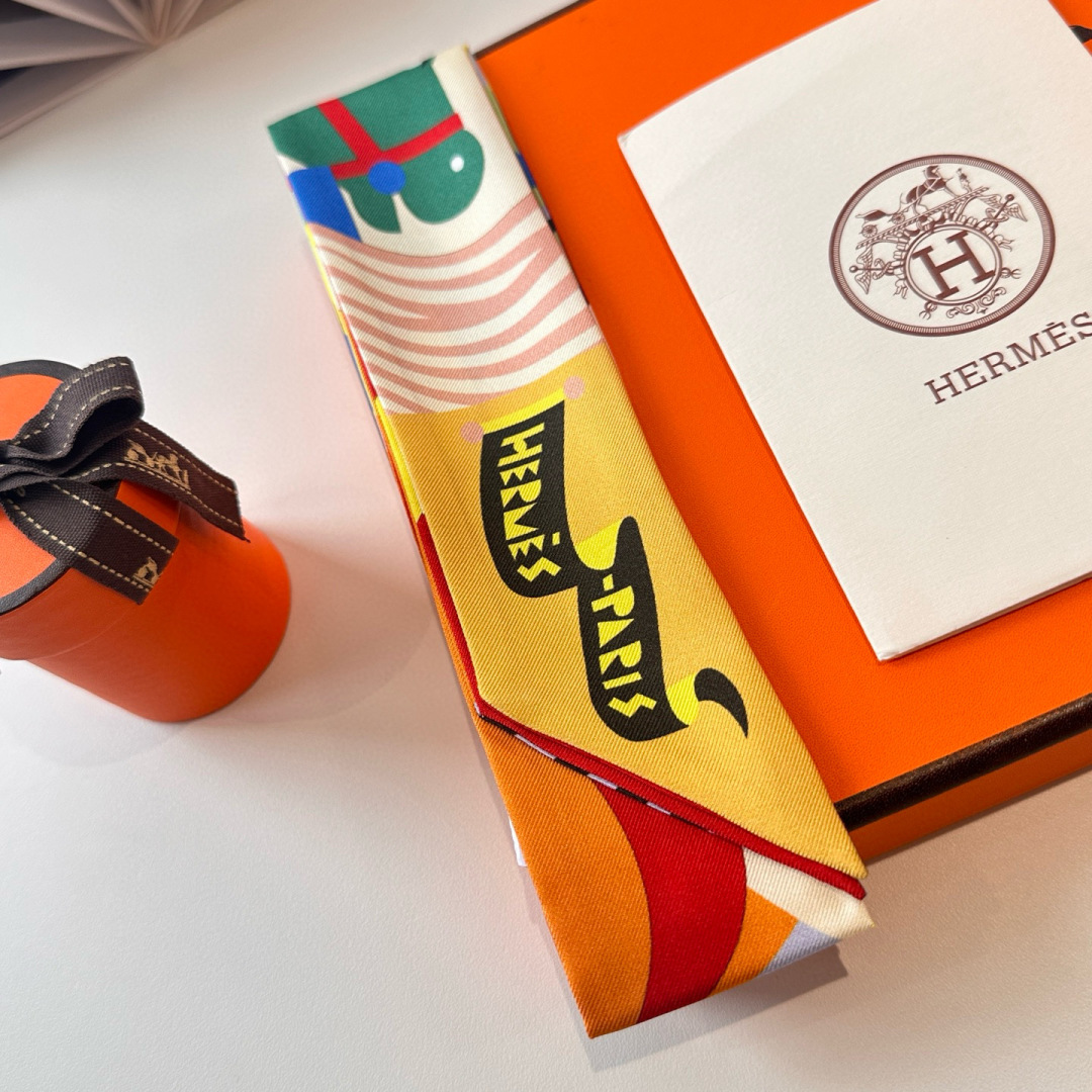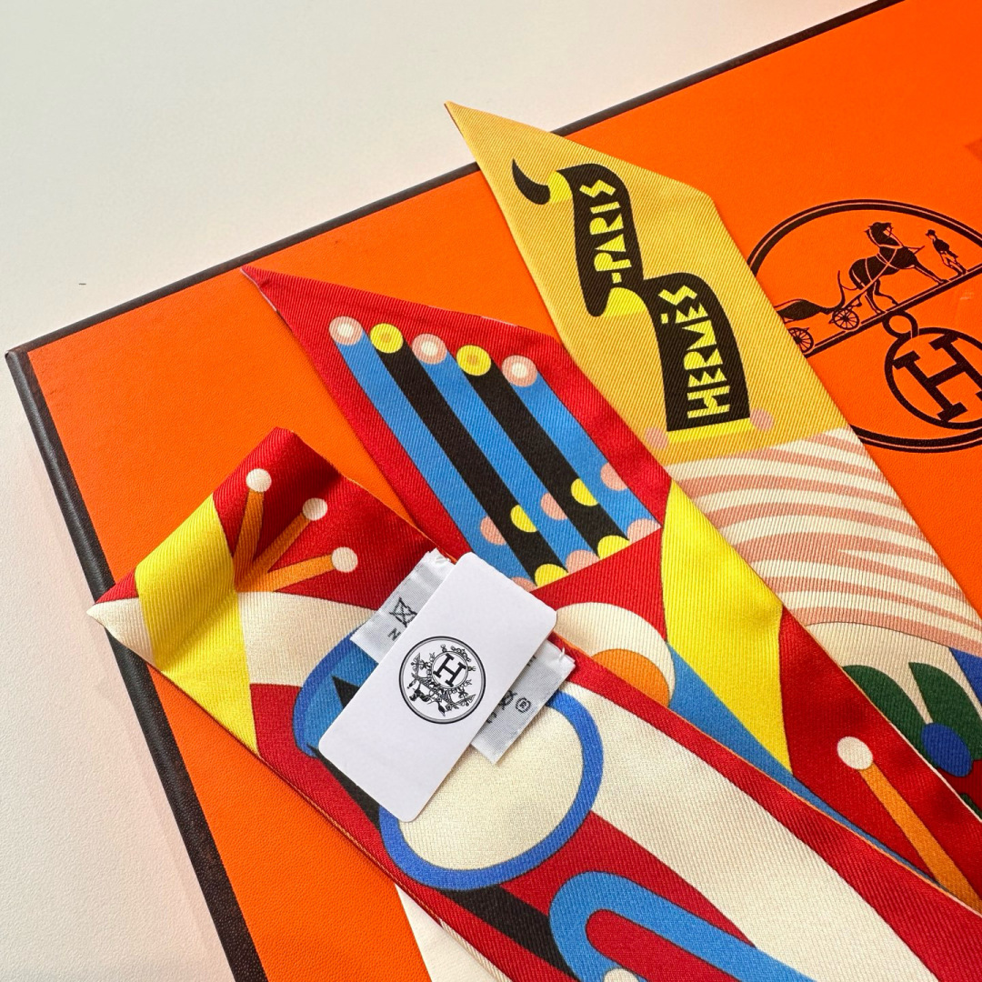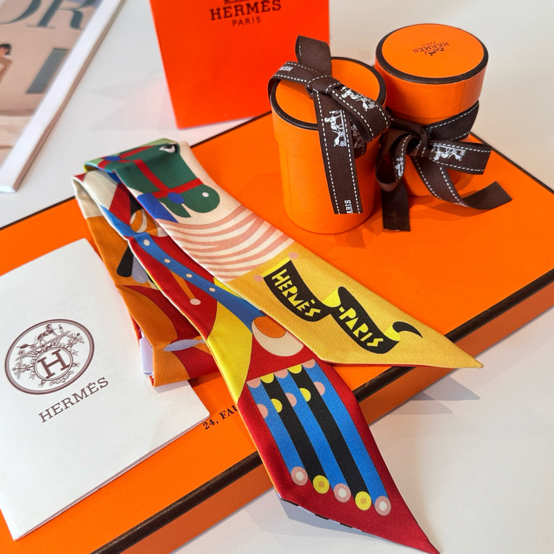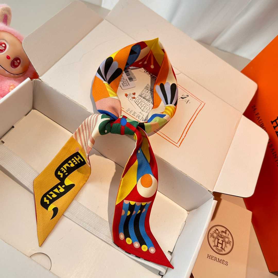 Elevate your style with this Hermes Twilly scarf. Crafted from luxurious silk with vibrant prints, it's perfect as a neck scarf or bag accessory.