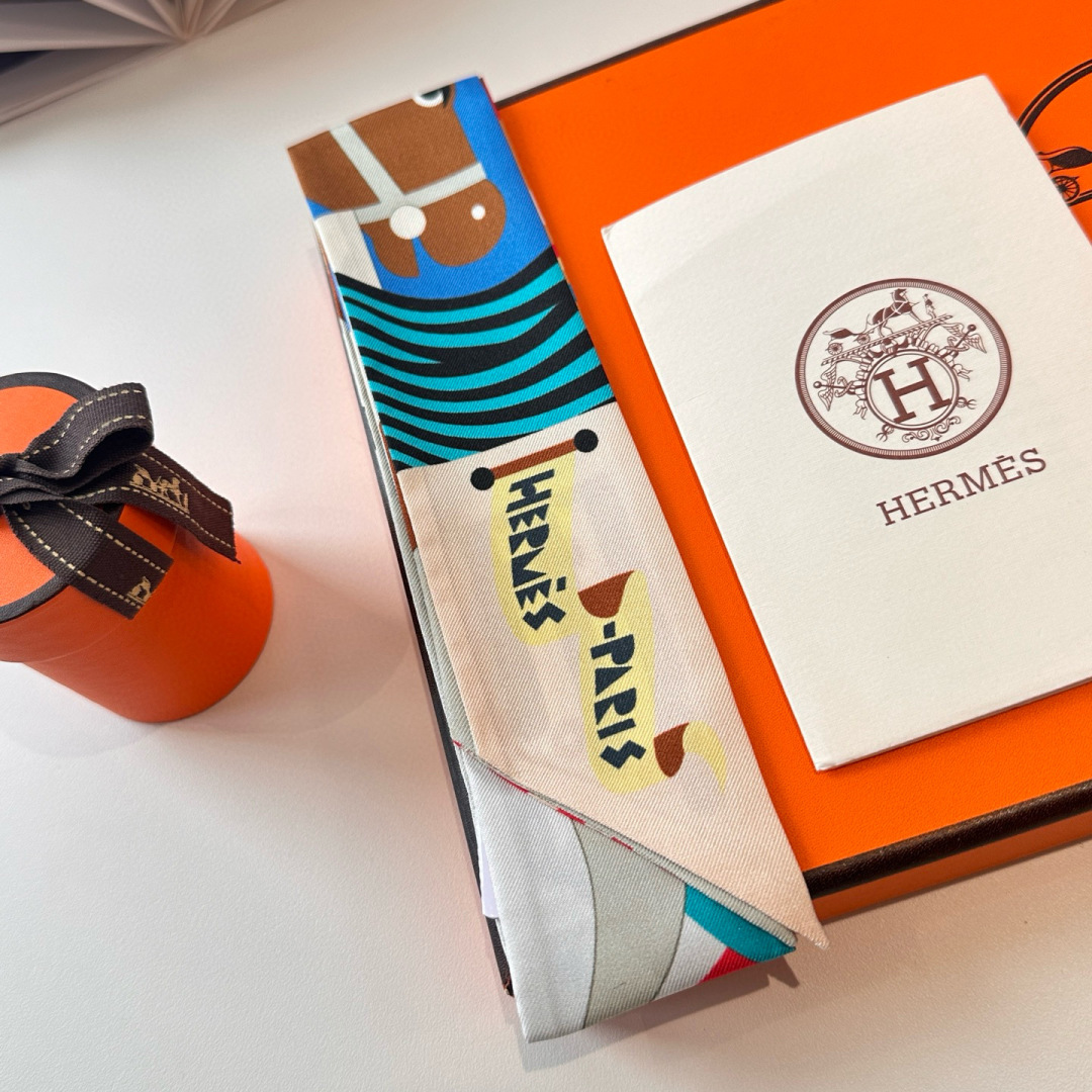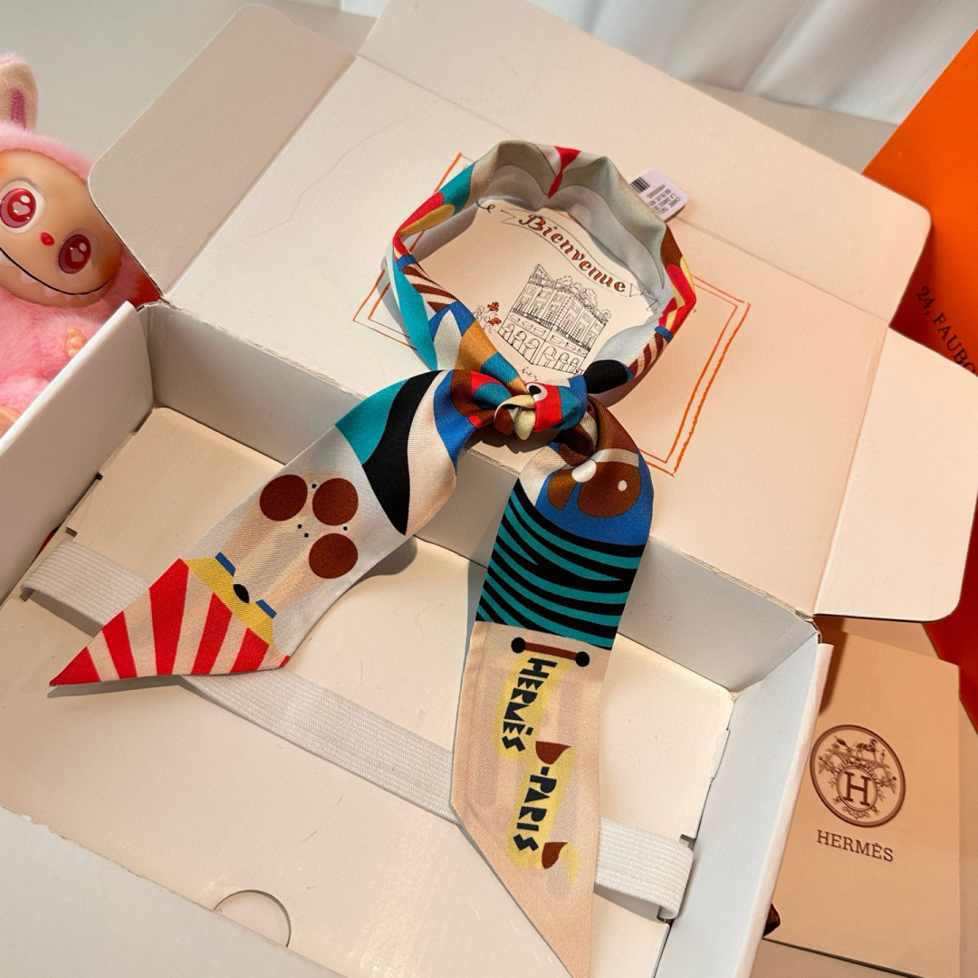 Elevate your style with this Hermes Twilly, crafted from luxurious twill silk with exquisite, detailed prints. Size: 5x86cm. 100% silk.