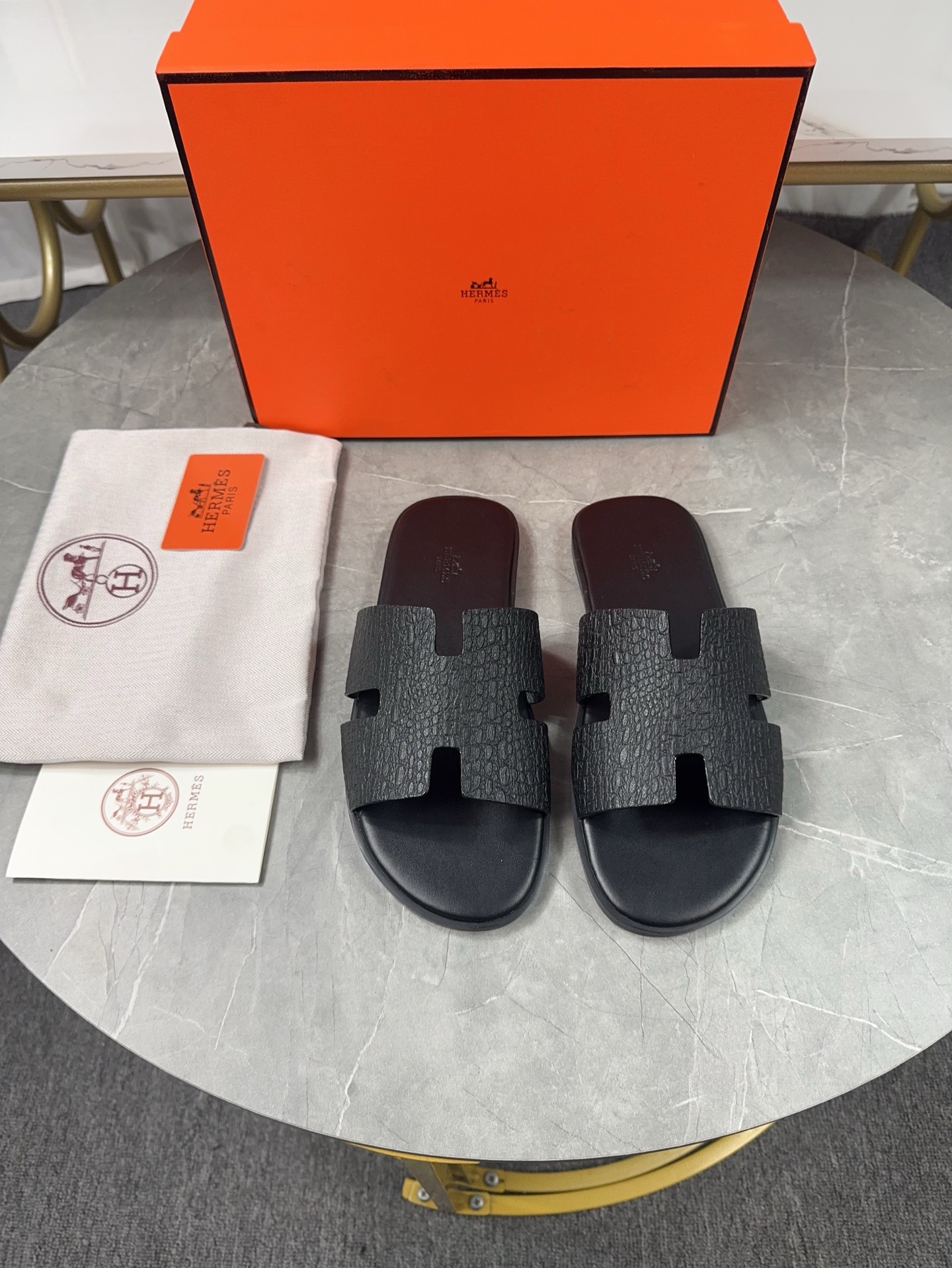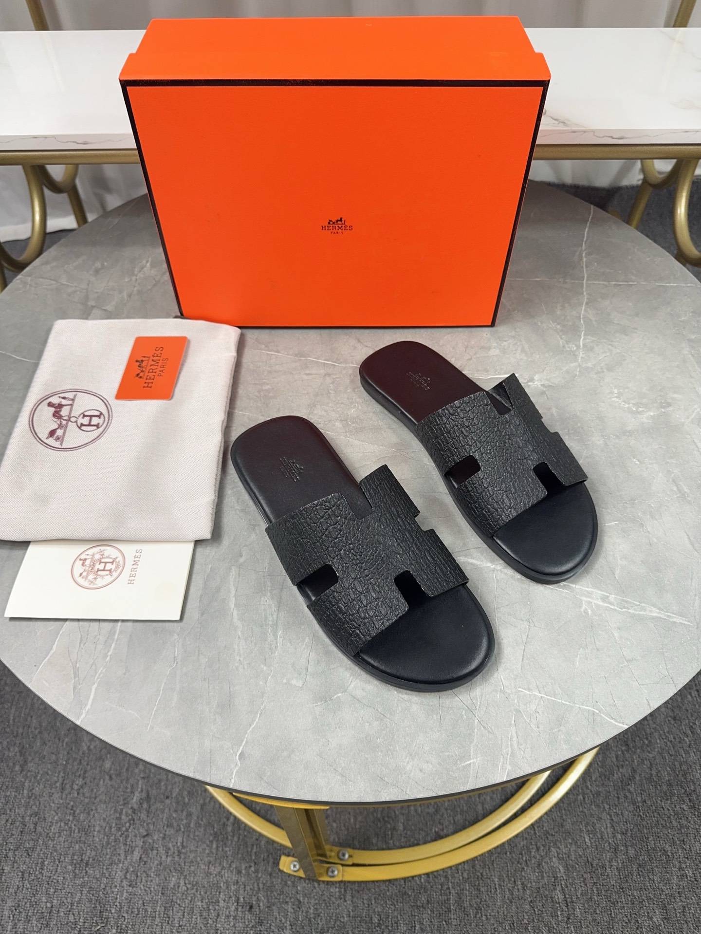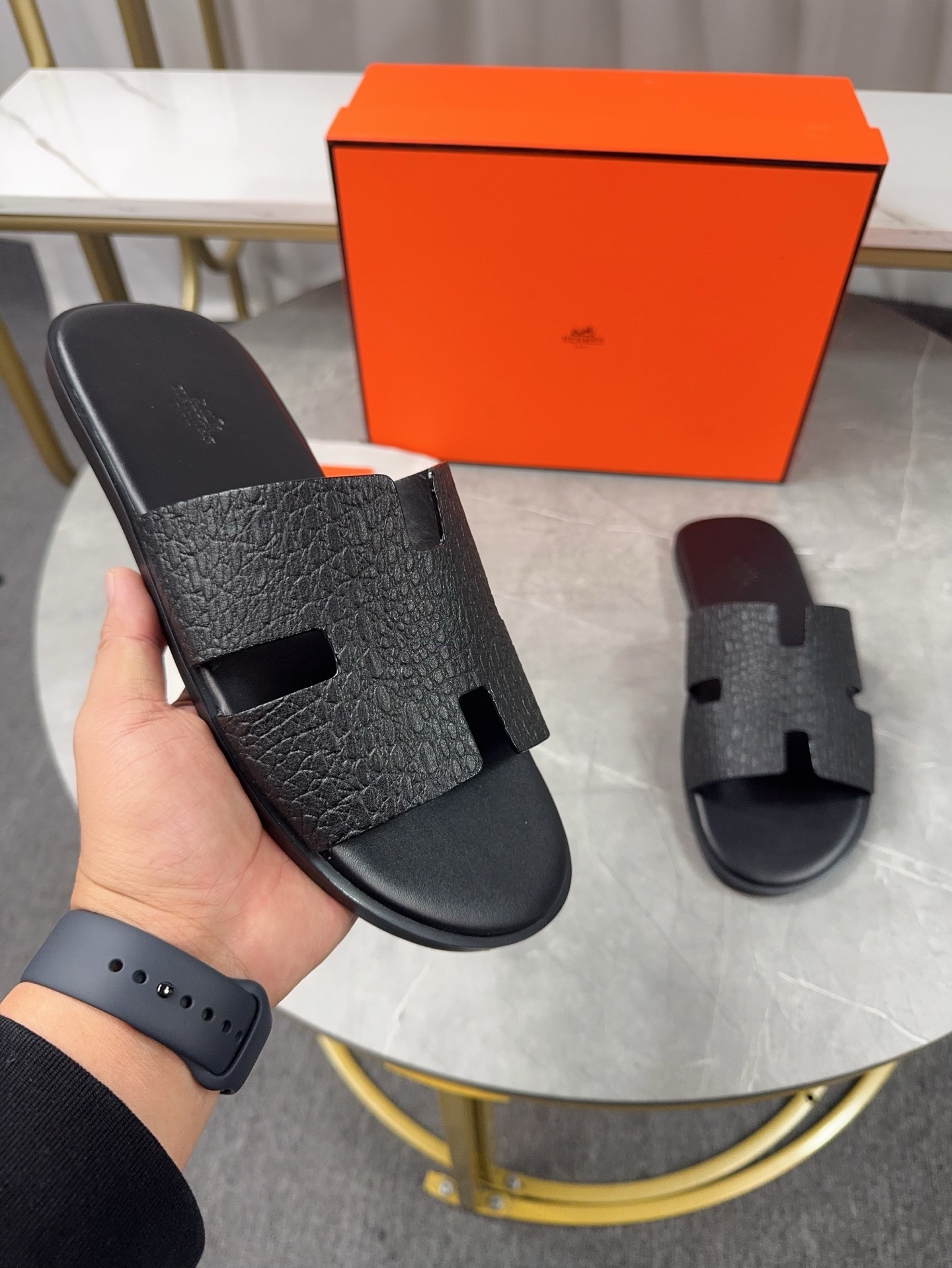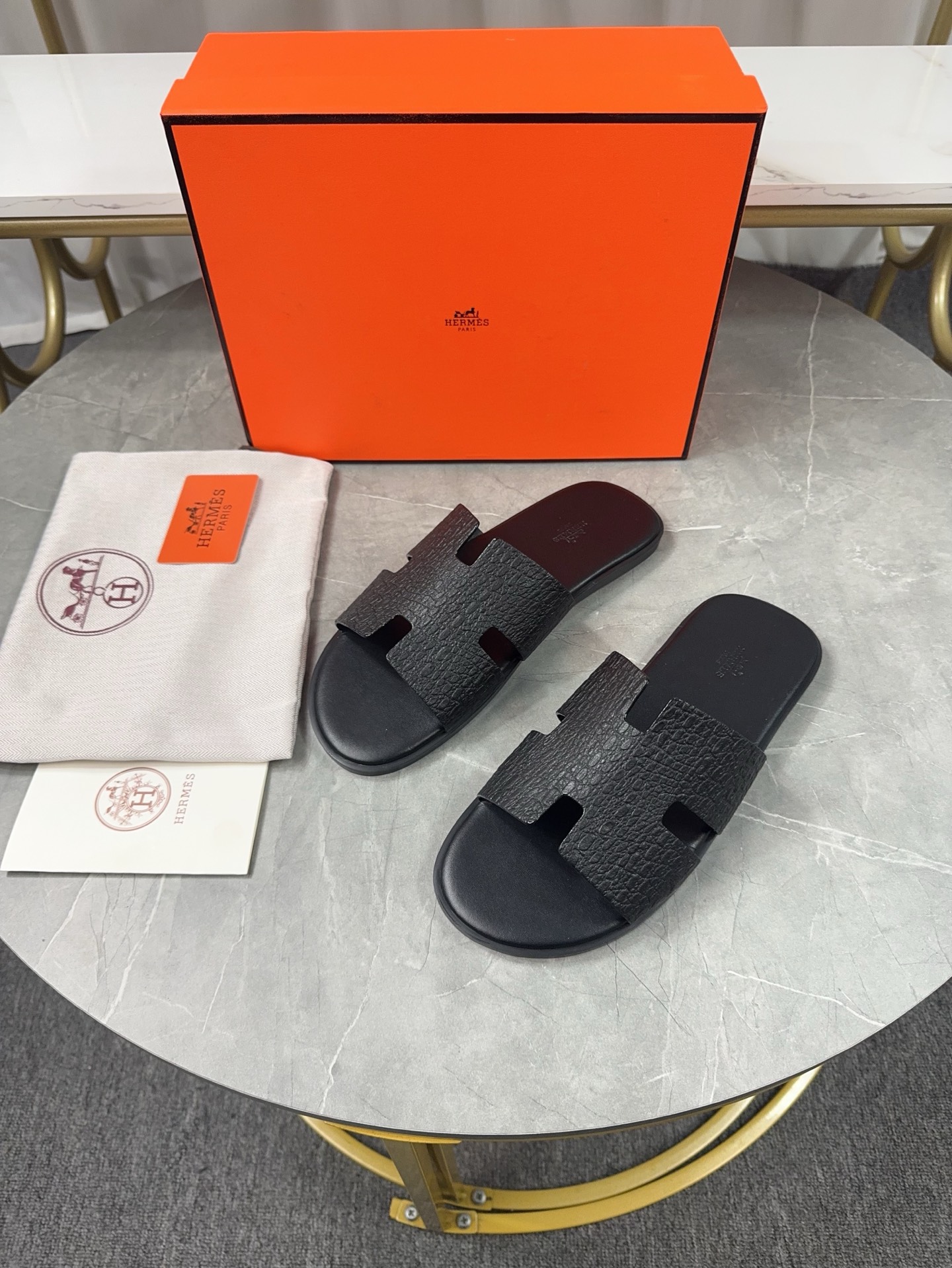 Experience the classic elegance of Hermes men's H slippers. Handcrafted with premium leather for superior comfort and style. Perfect for everyday wear.