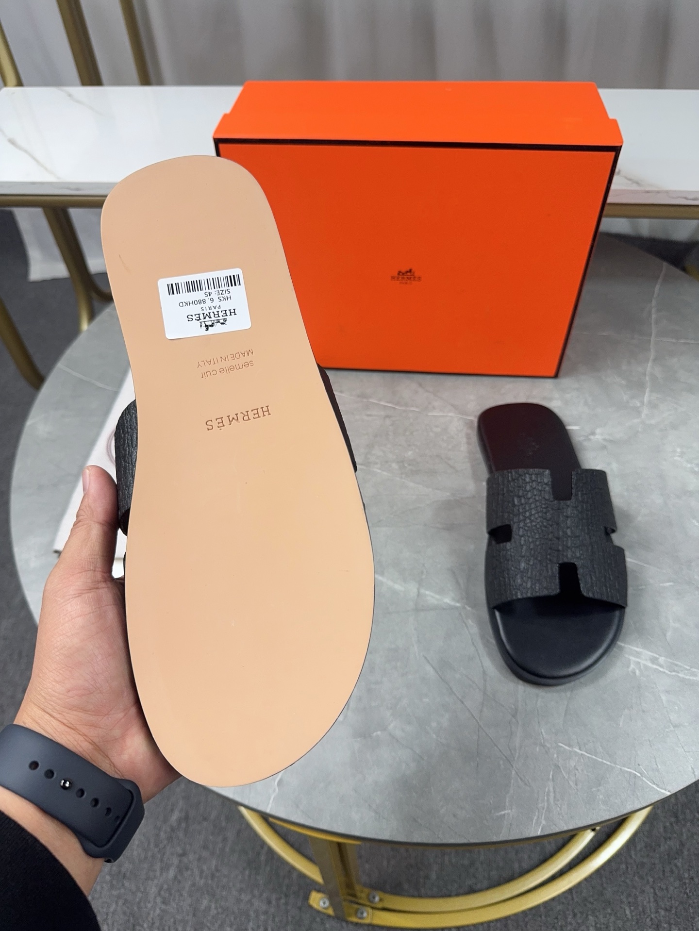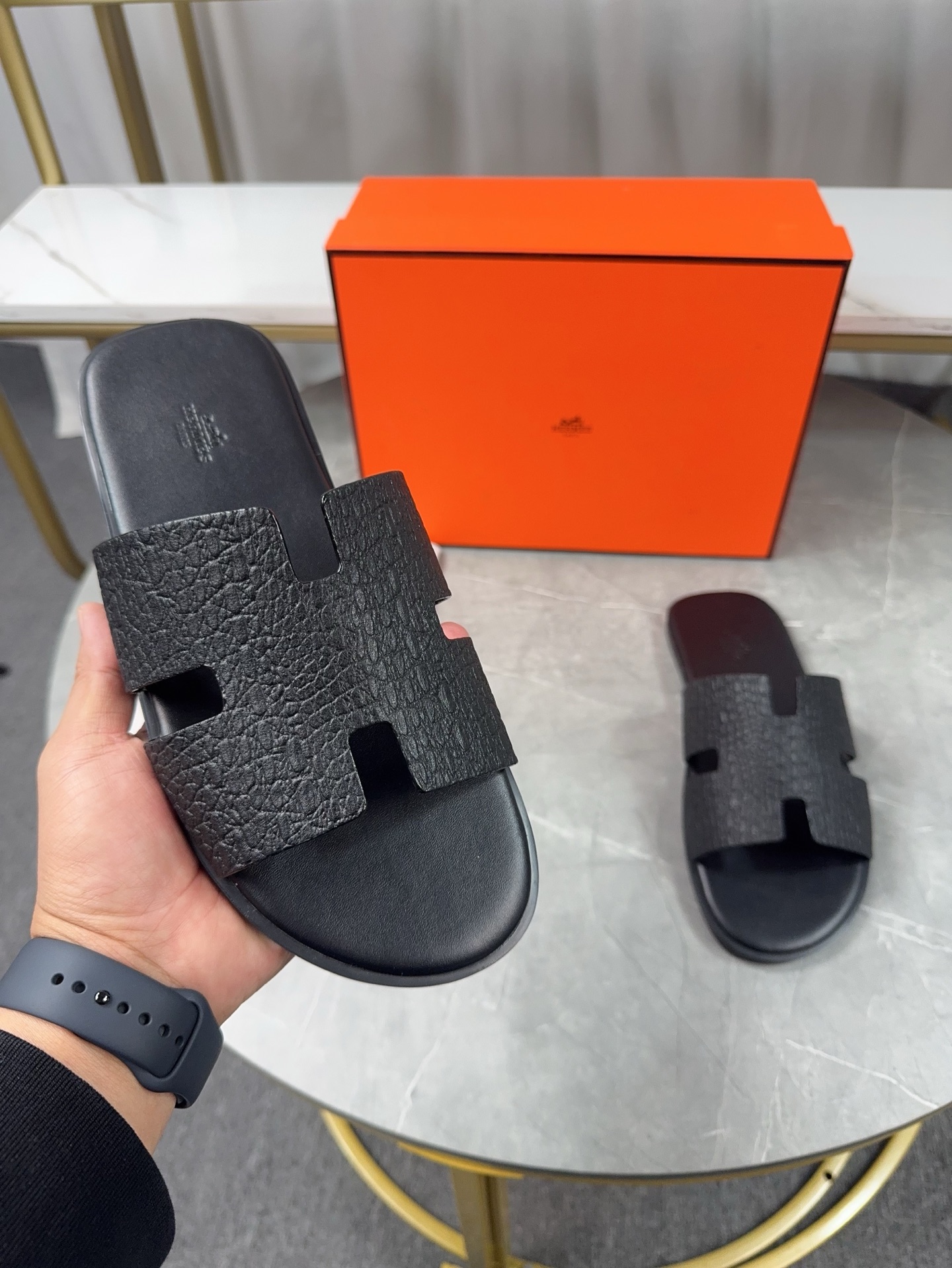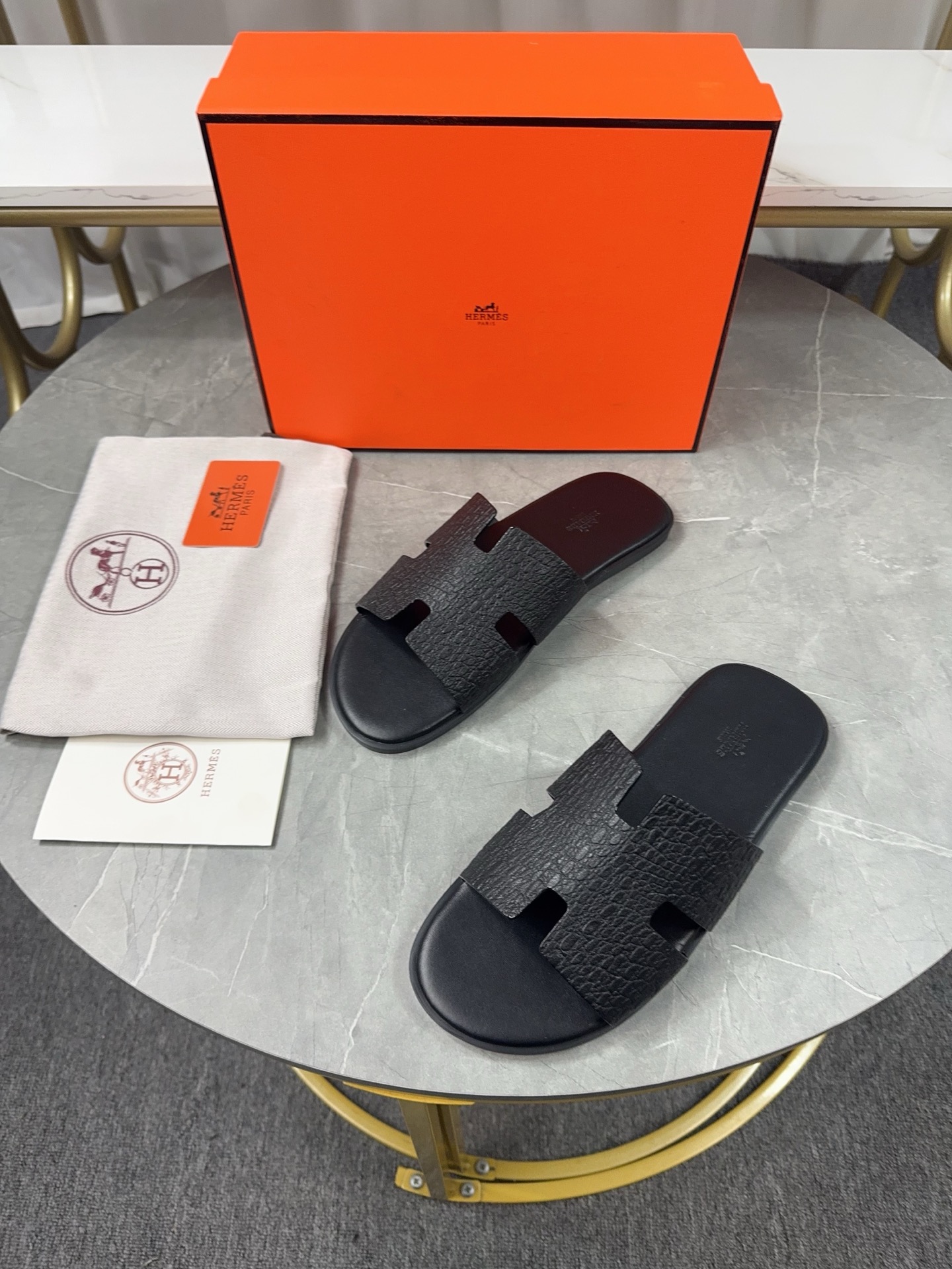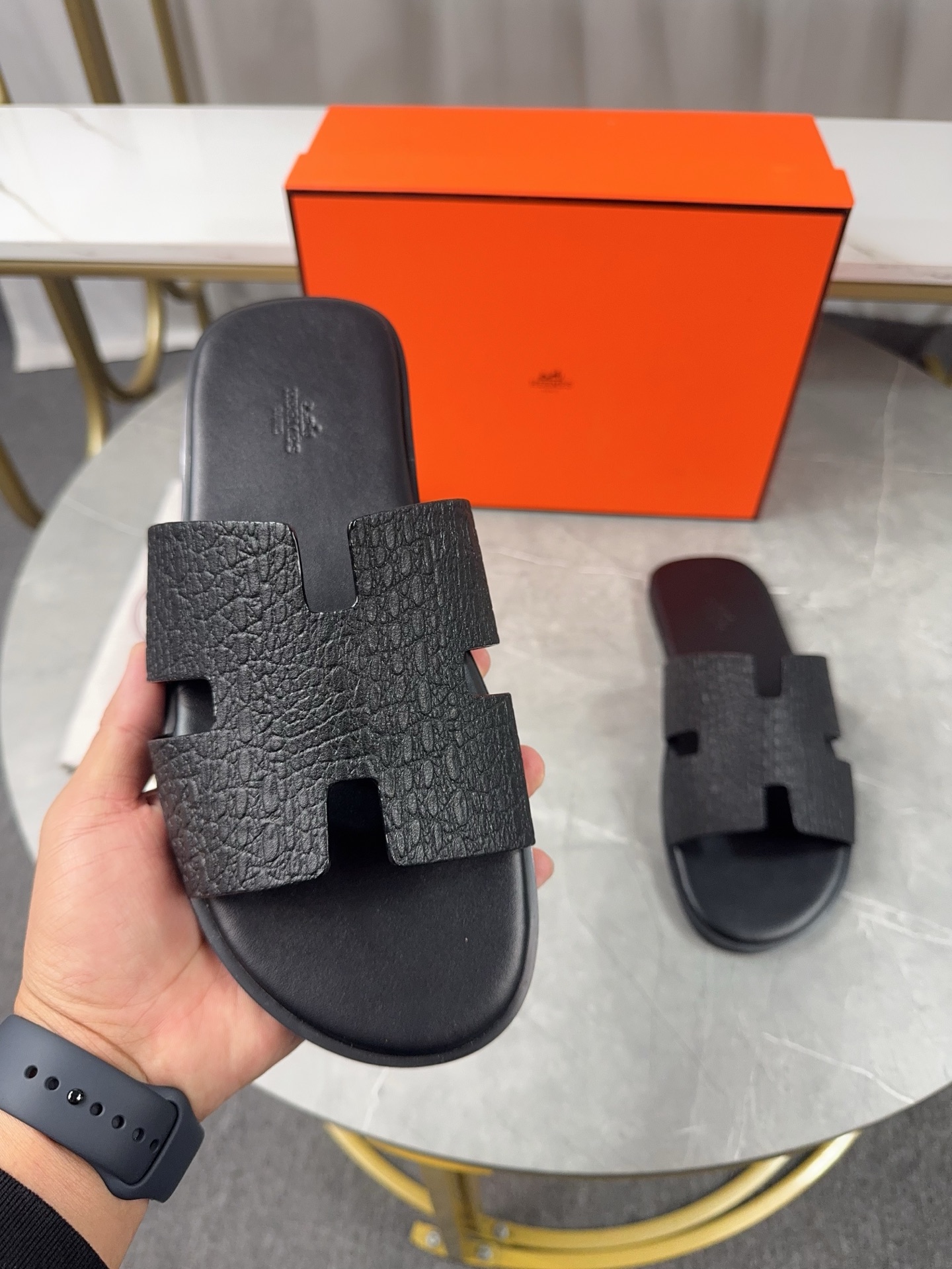 Experience the classic elegance of Hermes men's H slippers. Handcrafted with premium leather for superior comfort and style. Perfect for everyday wear.