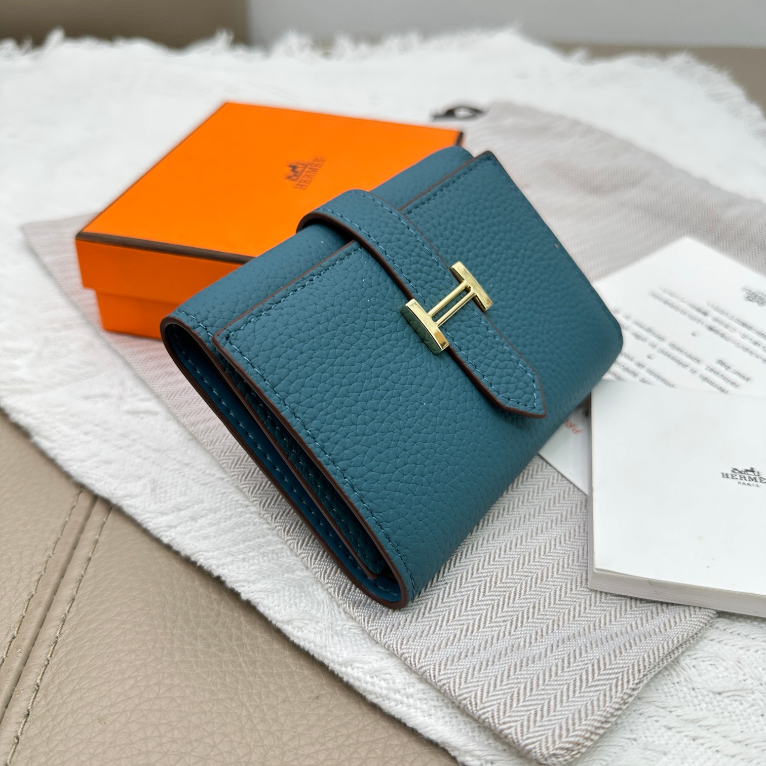 Elegant Hermes tri-fold wallet in turquoise Togo leather. Features a gold-tone hardware and multiple card slots for everyday essentials.
