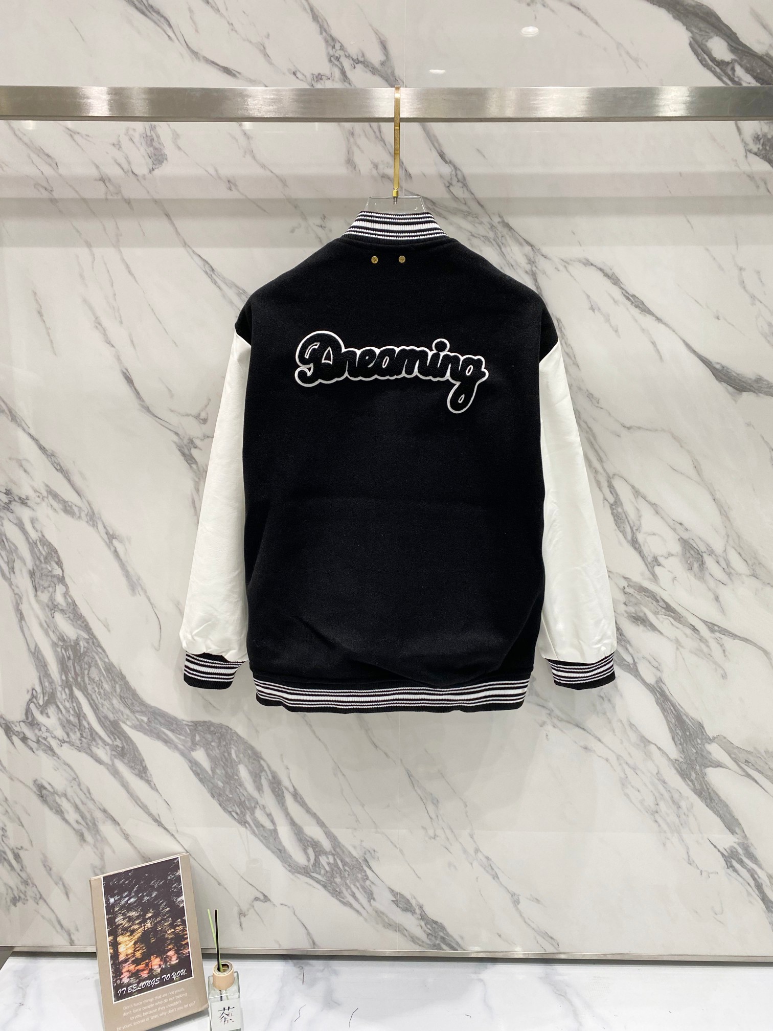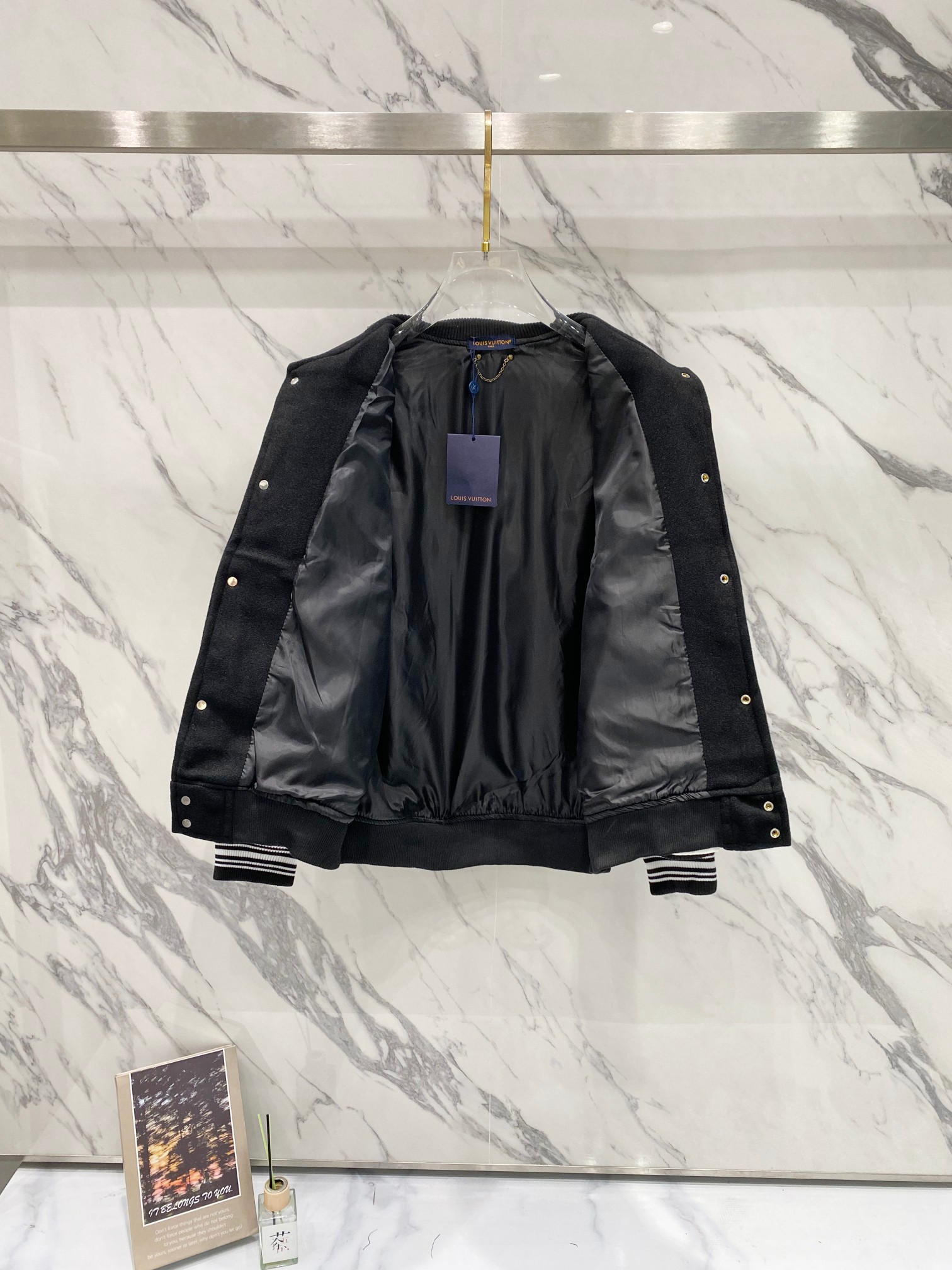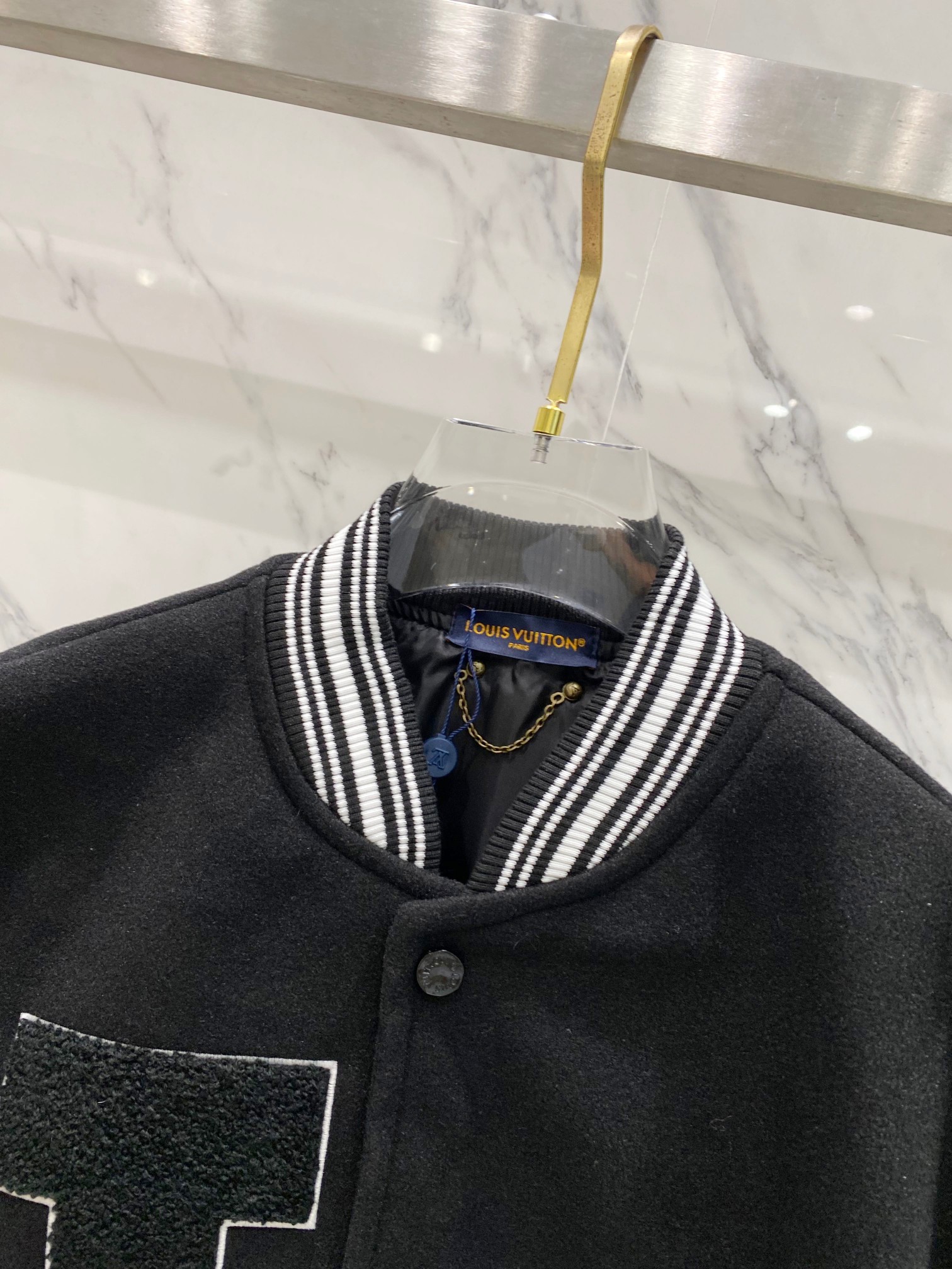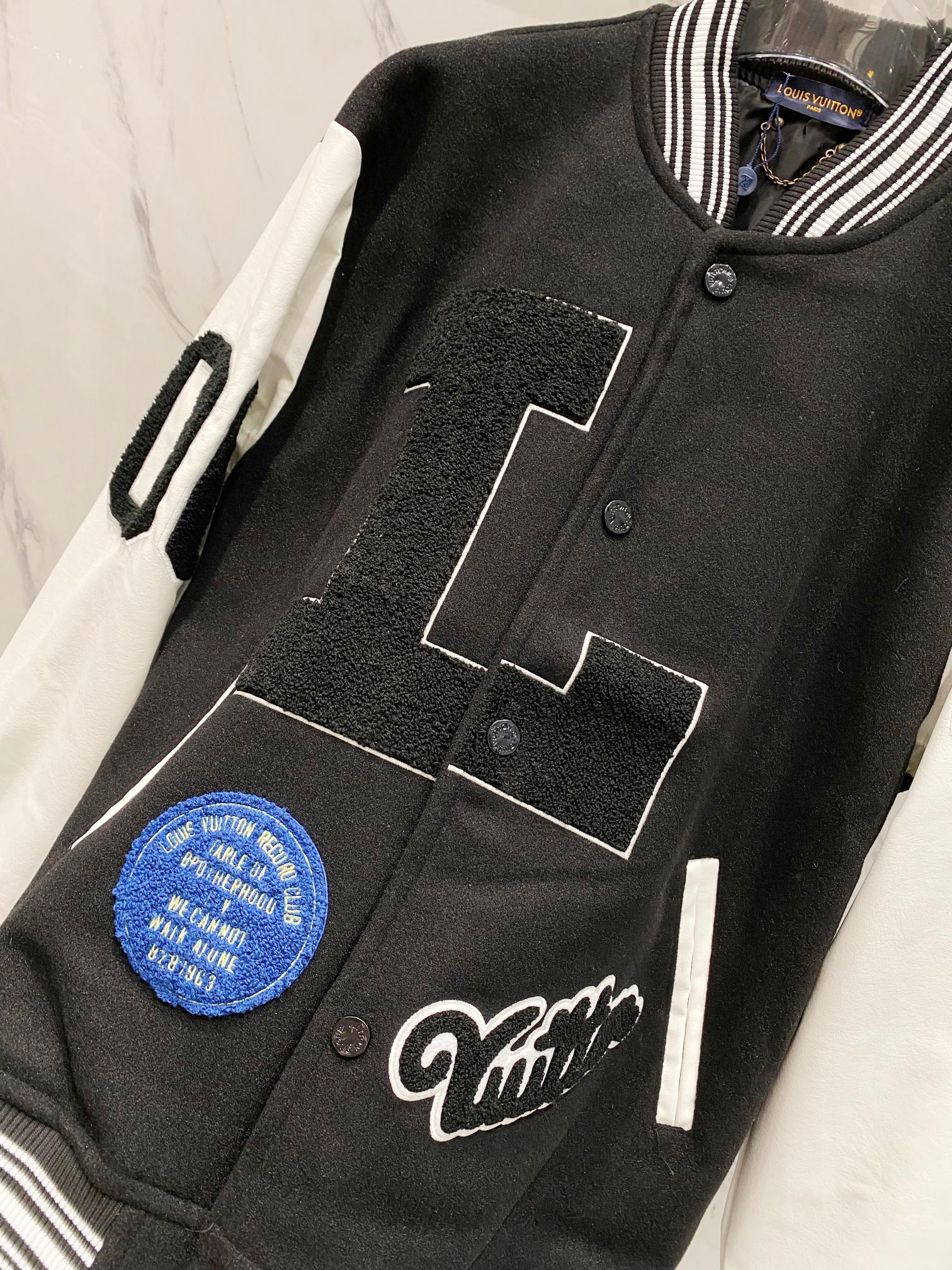 Tags: Designer Wool Blend Jacket, Embroidered Varsity Jacket, Leather Sleeve Jacket, Louis Vuitton Varsity Jacket, Luxury Letterman Jacket, Runway Fashion Jacket