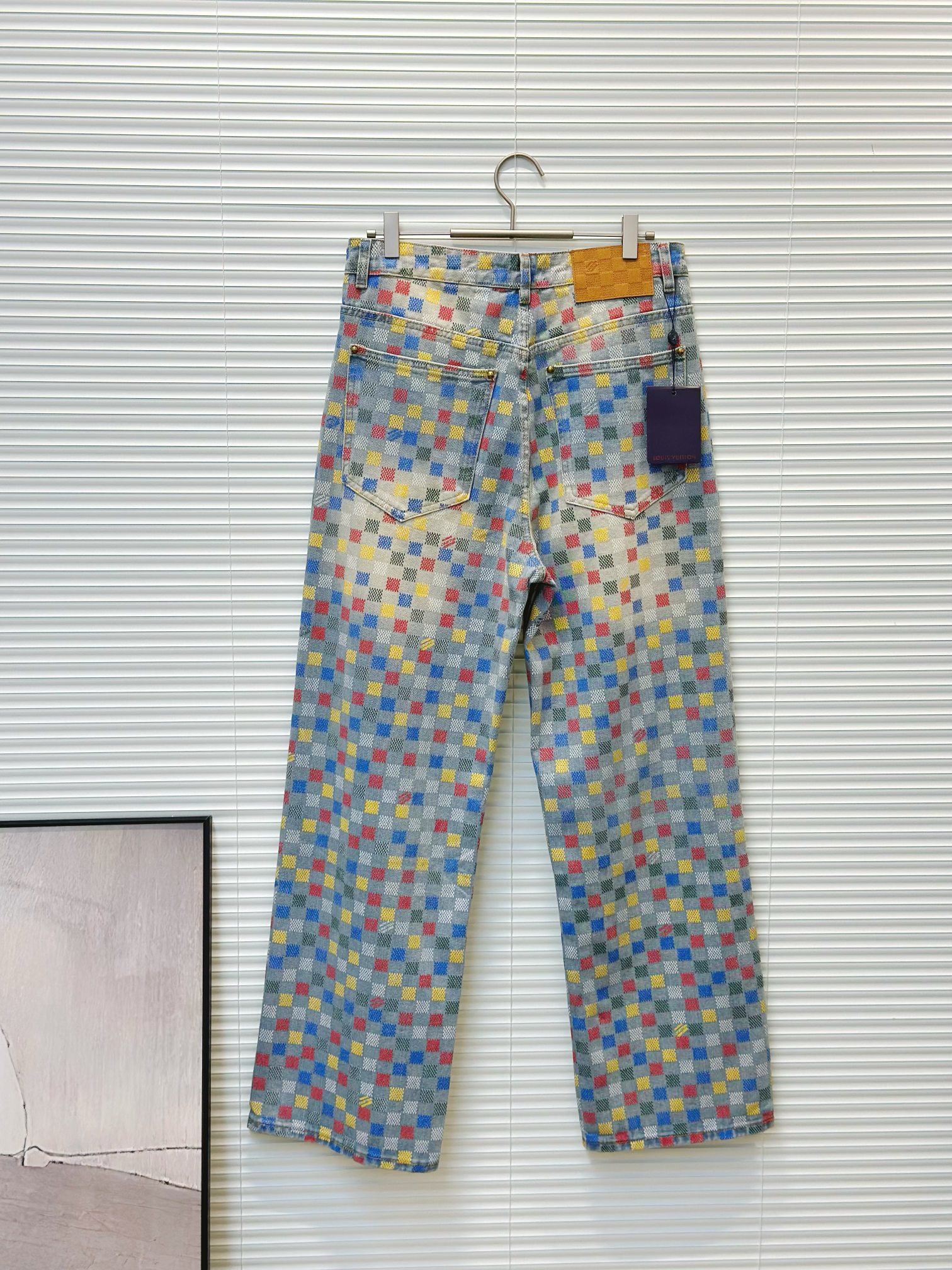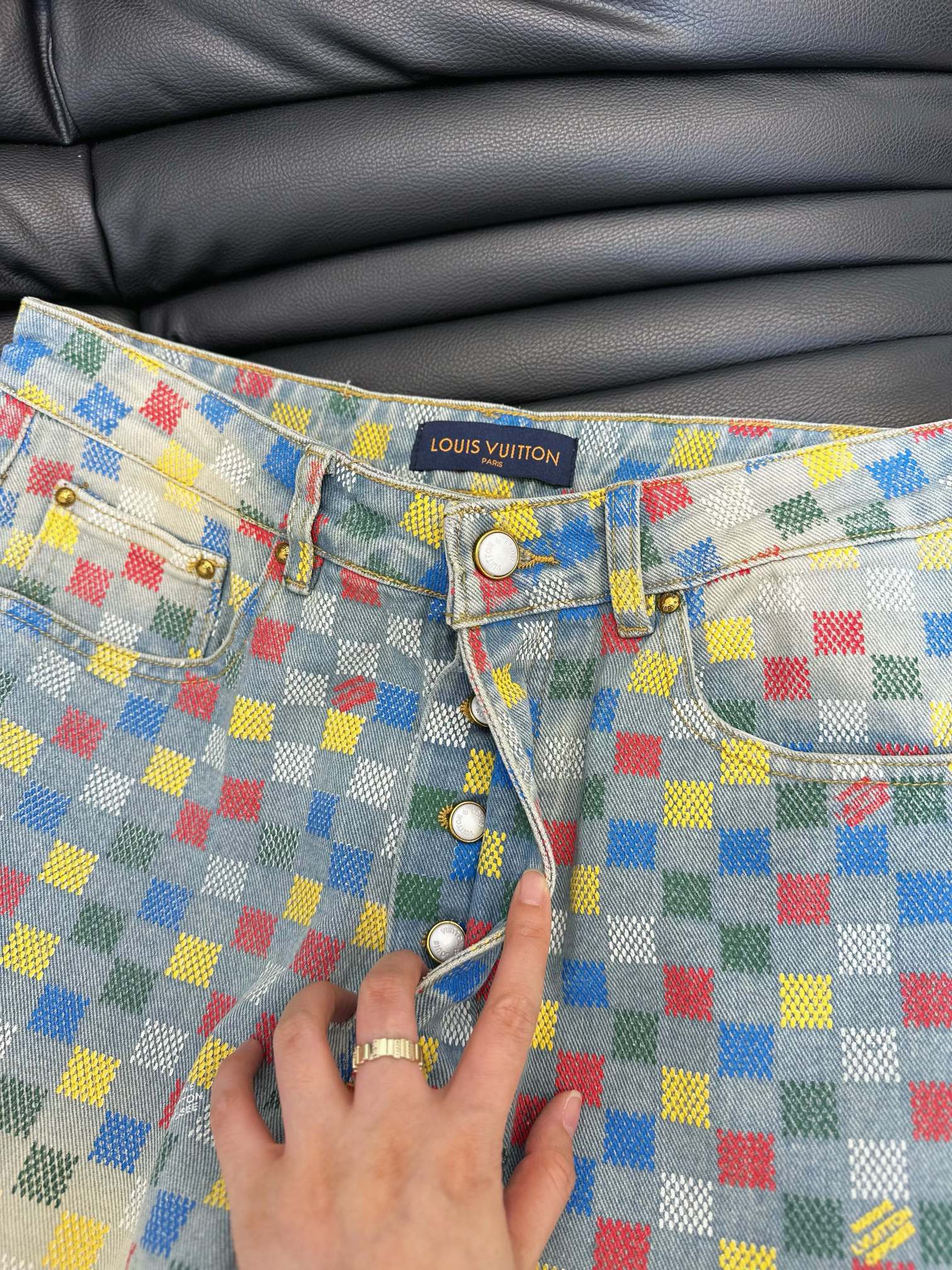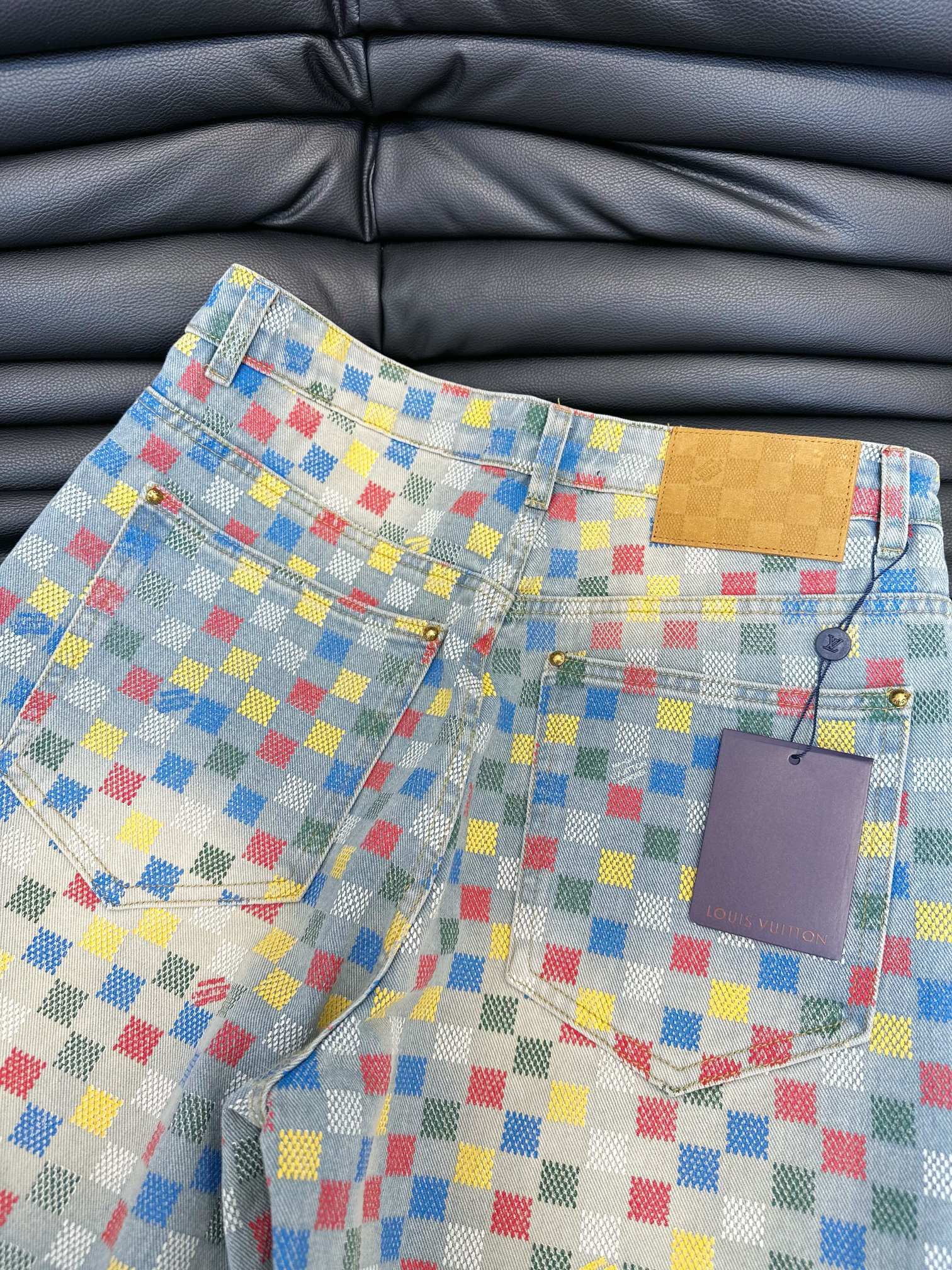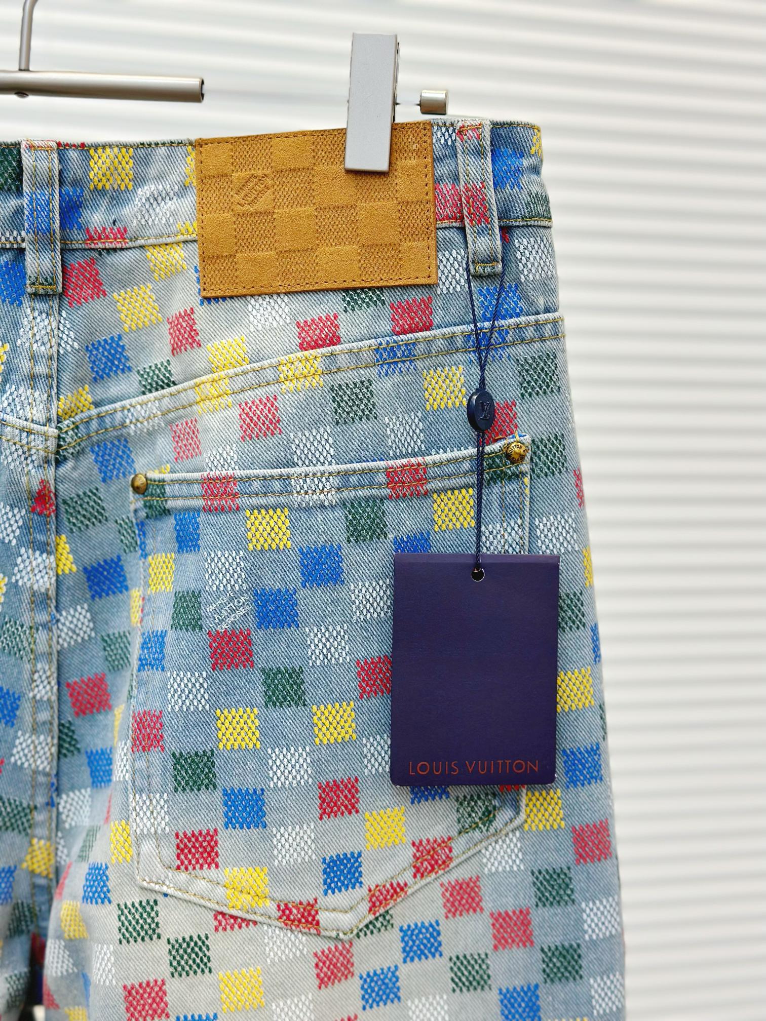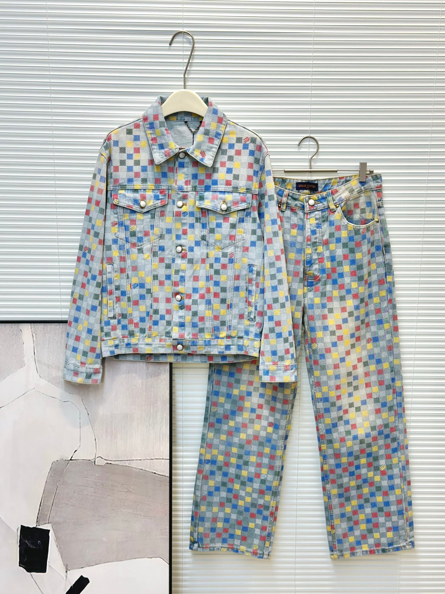 Tags: Checkered Denim Jacket, Designer Denim Set, Flocked Denim Jeans, Louis Vuitton Denim, Luxury Denim Outfit