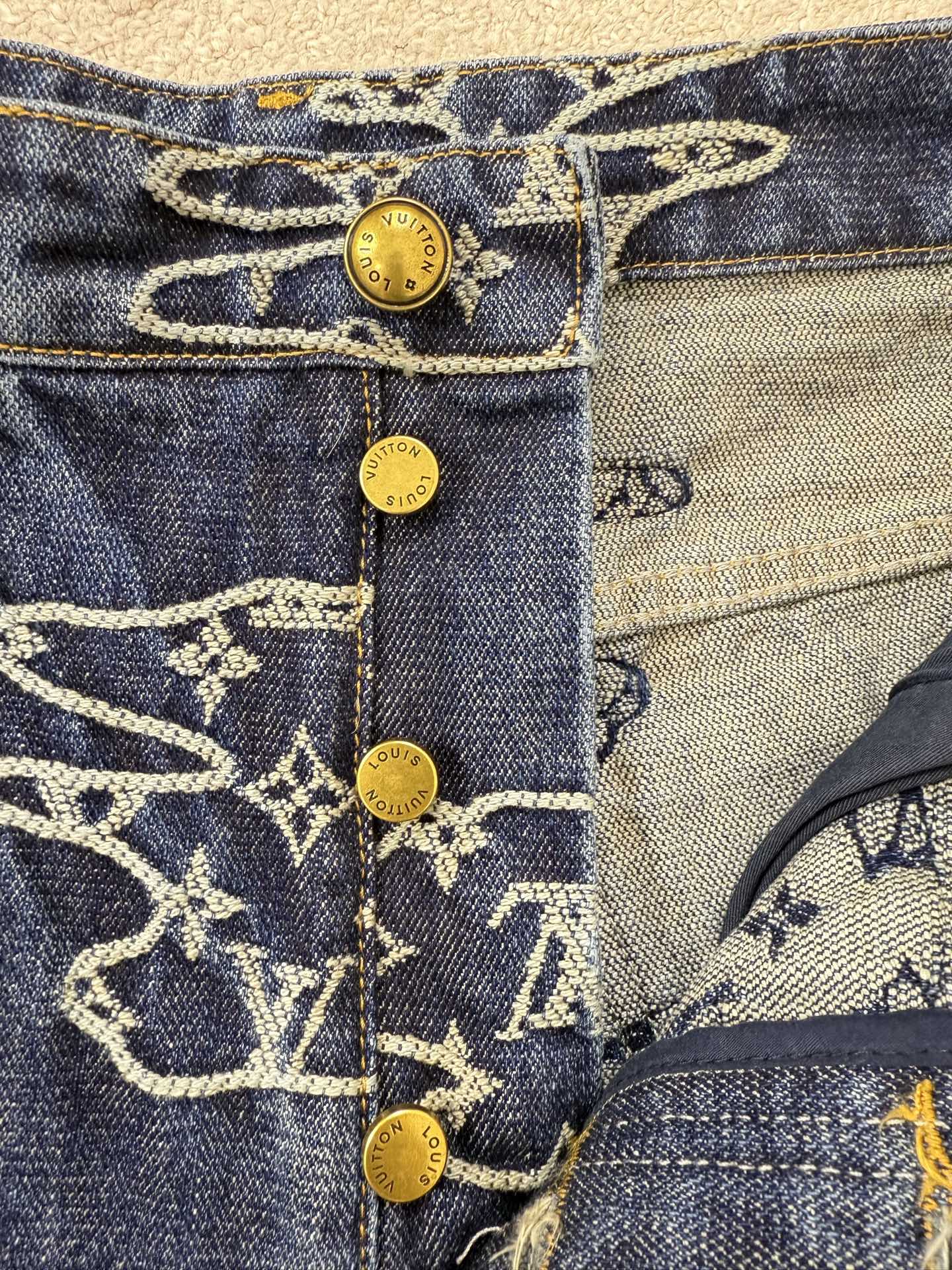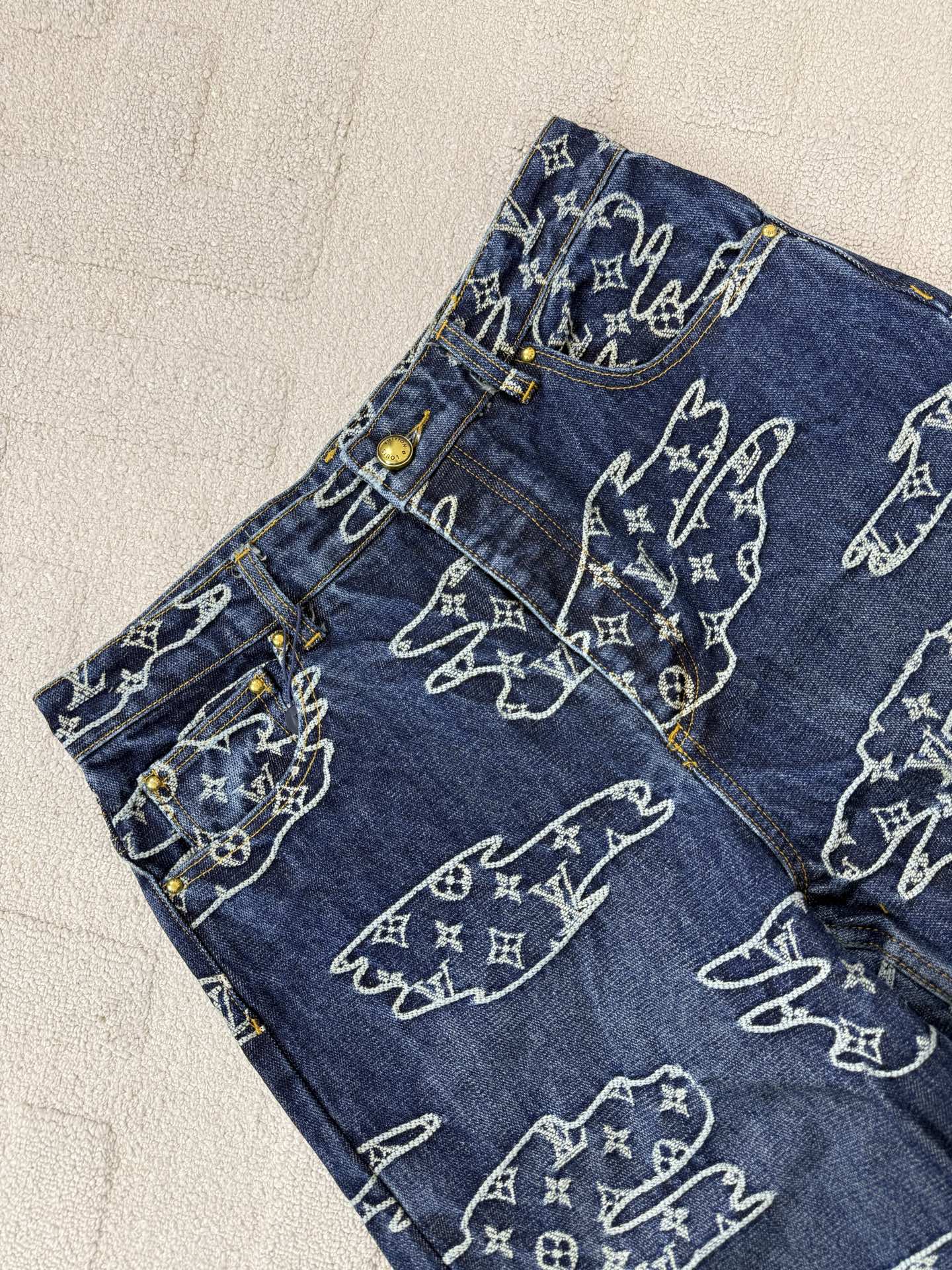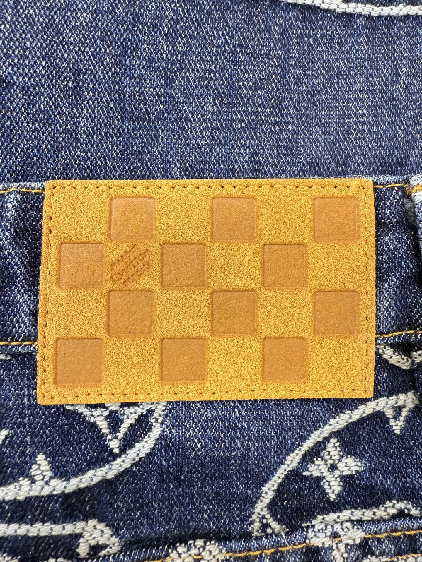 These washed denim jeans are from the collaboration of Pharrell Williams and Nigo for the Autumn-Winter 2025 collection. It features the Monogram Clouds jacquard, inspired by Japanese patchwork, with a suede Mini Damier label and pearl buttons.