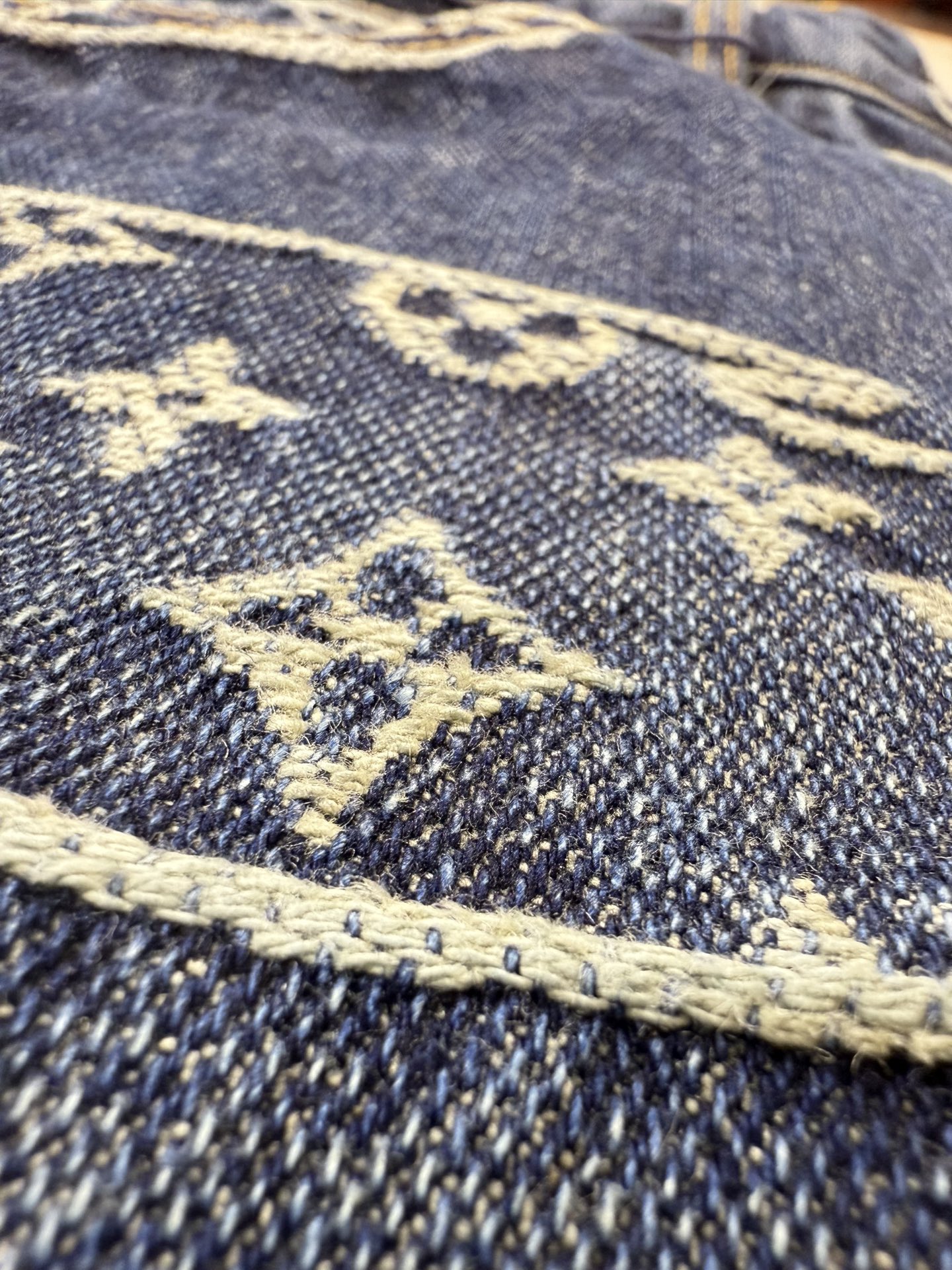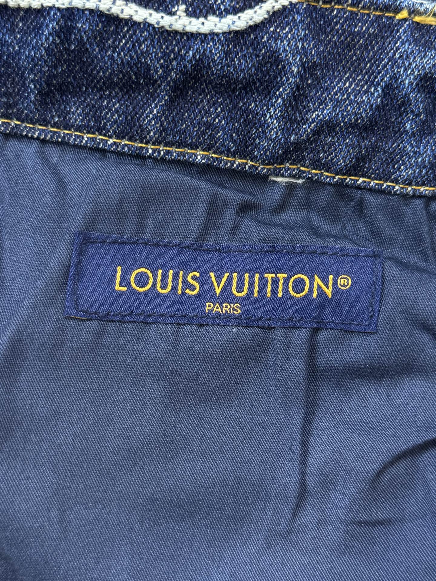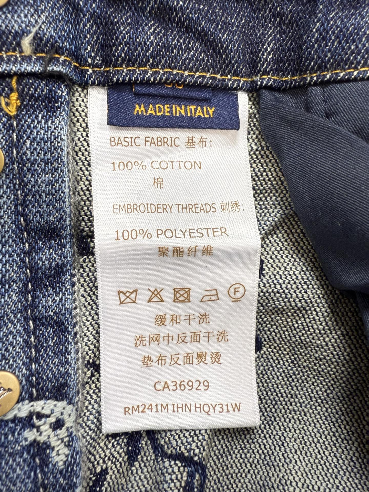 These washed denim jeans are from the collaboration of Pharrell Williams and Nigo for the Autumn-Winter 2025 collection. It features the Monogram Clouds jacquard, inspired by Japanese patchwork, with a suede Mini Damier label and pearl buttons.