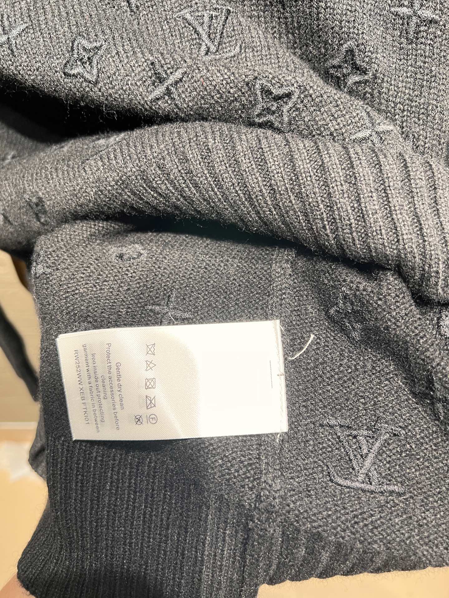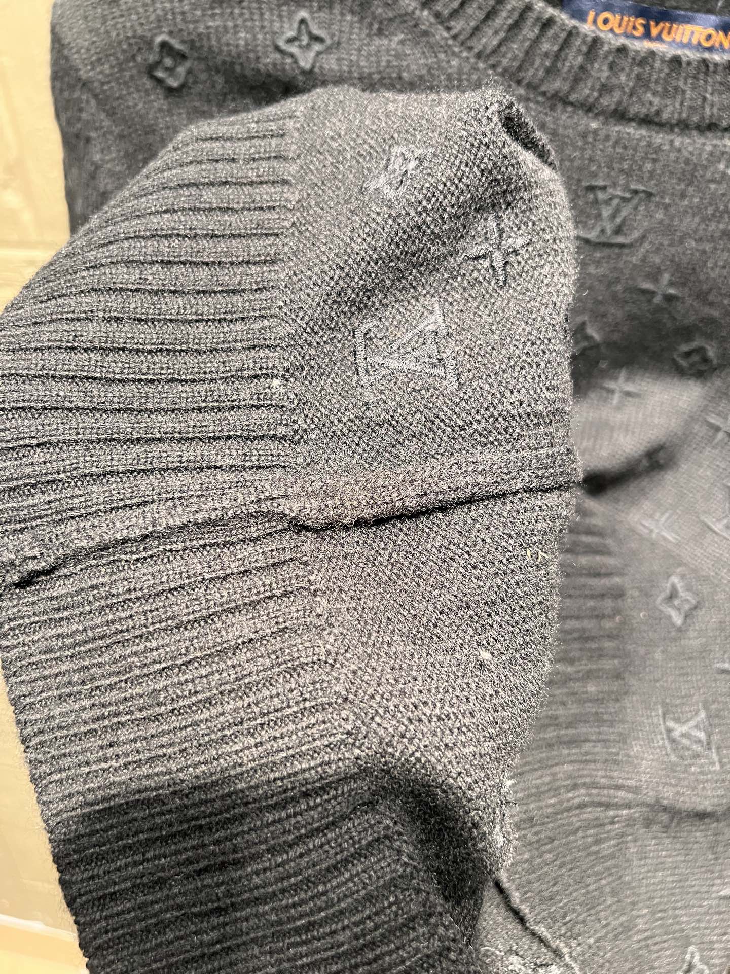 Elevate your style with this luxurious Louis Vuitton cashmere knit sweater. Features a tonal Monogram pattern and ribbed hem for added comfort.