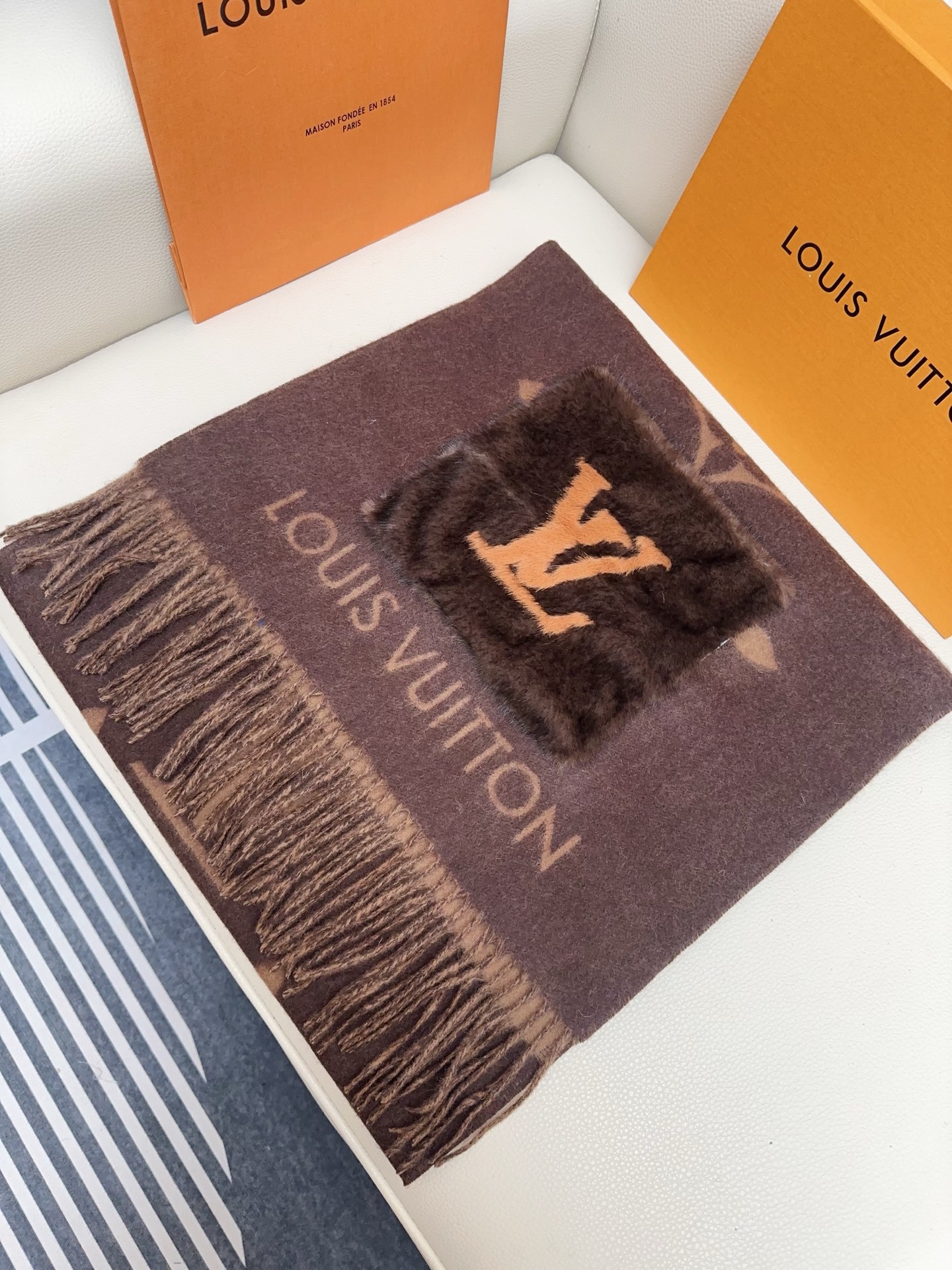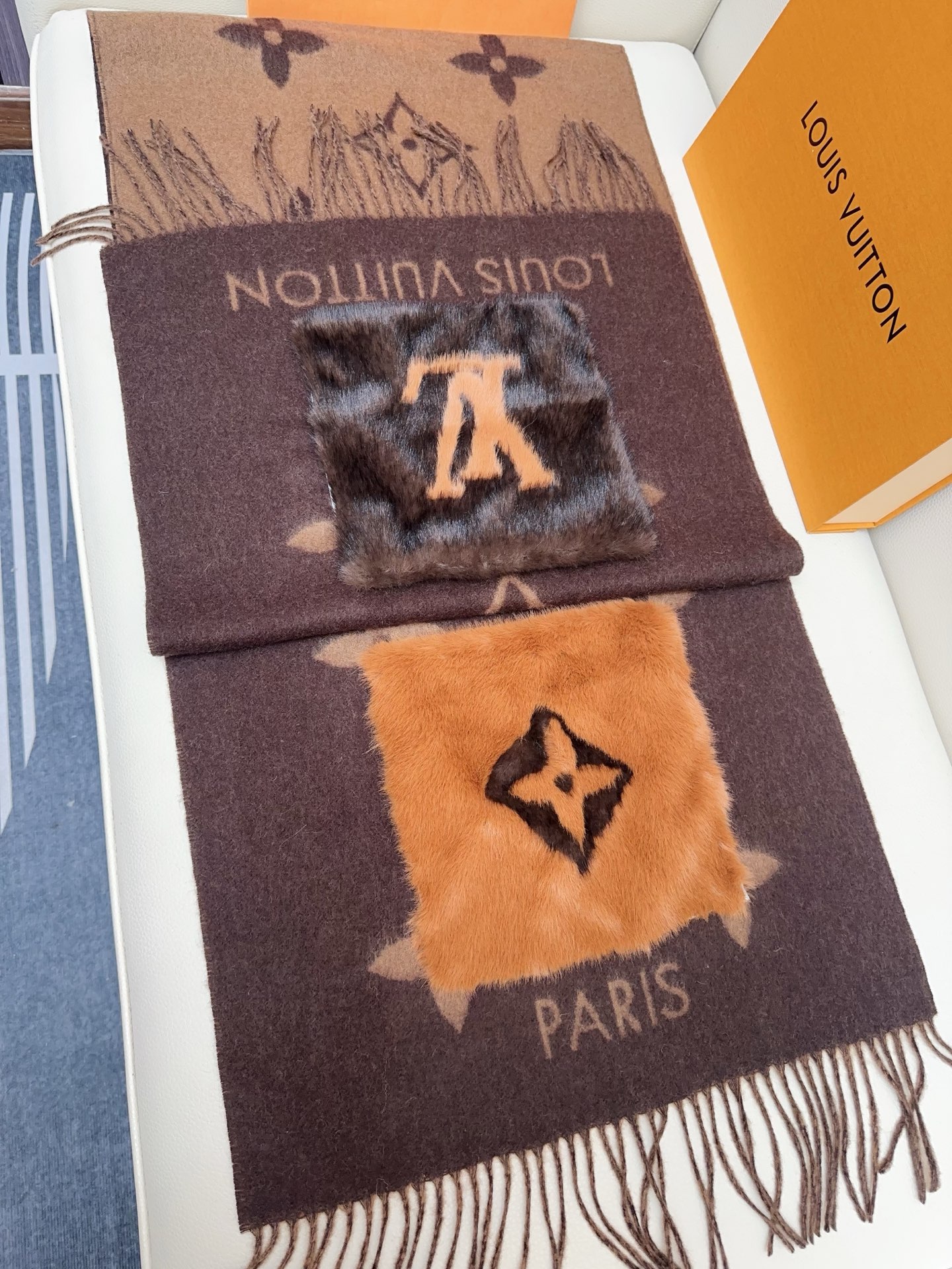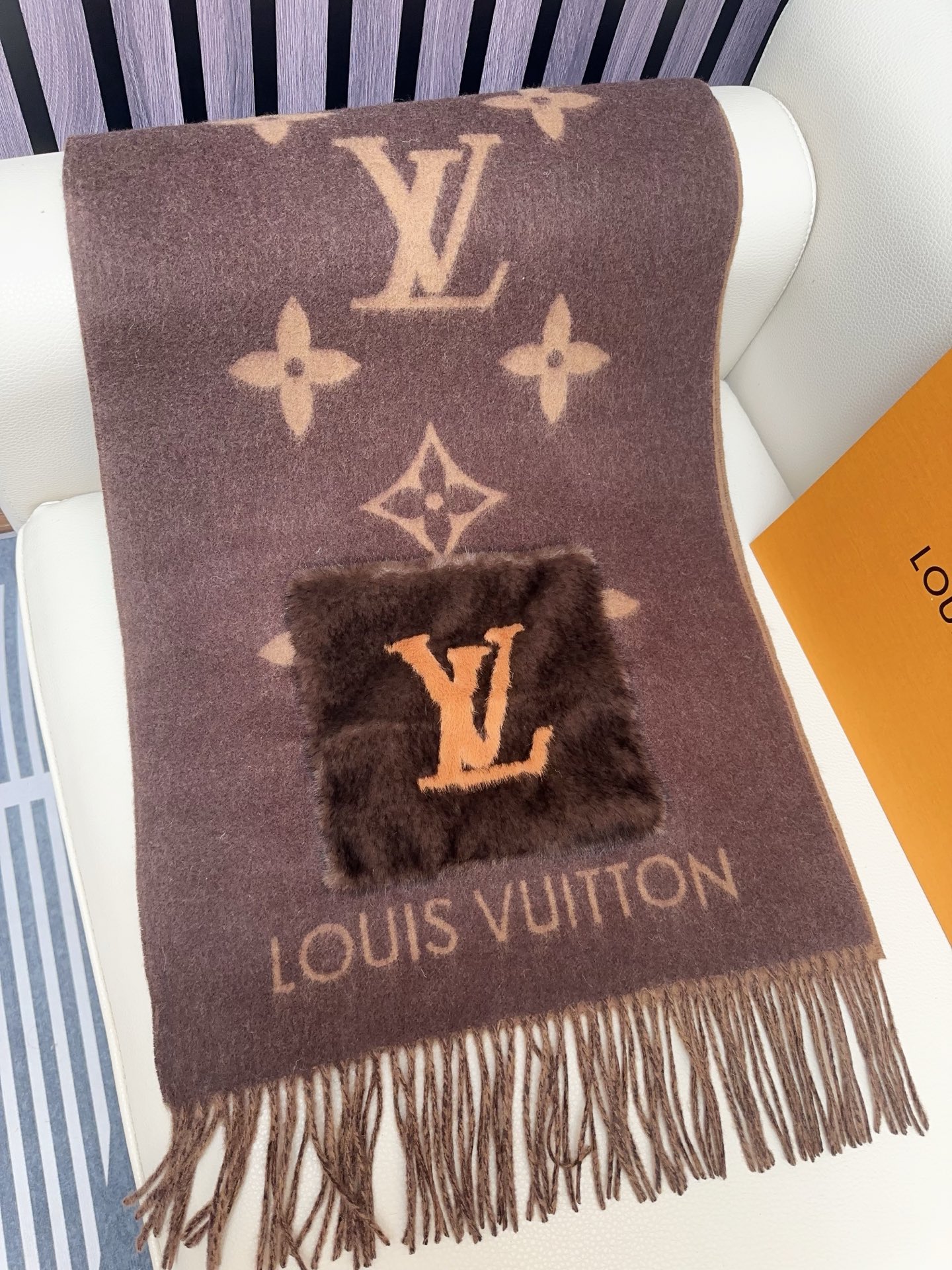 I absolutely adore this Louis Vuitton shawl! The cashmere is incredibly soft, and the mink pockets add a touch of luxury. The Monogram pattern is iconic and stylish. Perfect for chilly days!