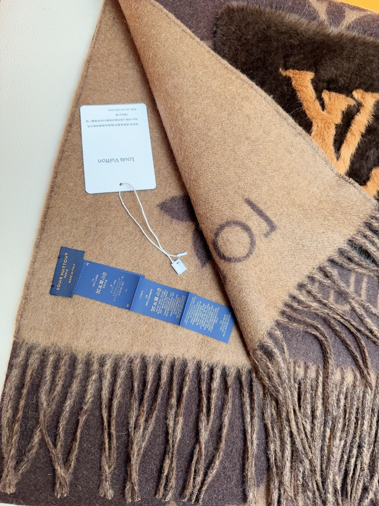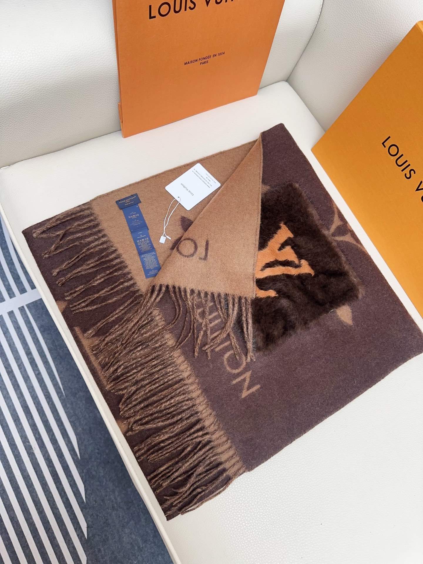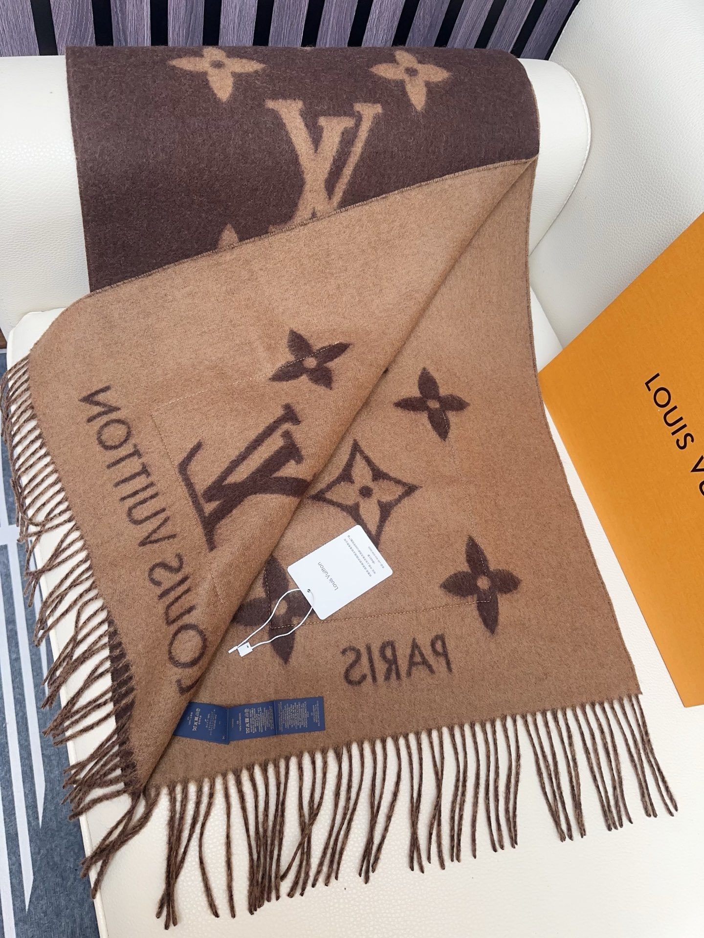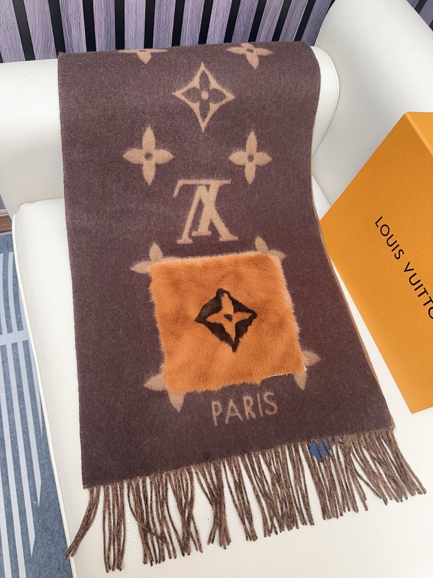 I absolutely adore this Louis Vuitton shawl! The cashmere is incredibly soft, and the mink pockets add a touch of luxury. The Monogram pattern is iconic and stylish. Perfect for chilly days!