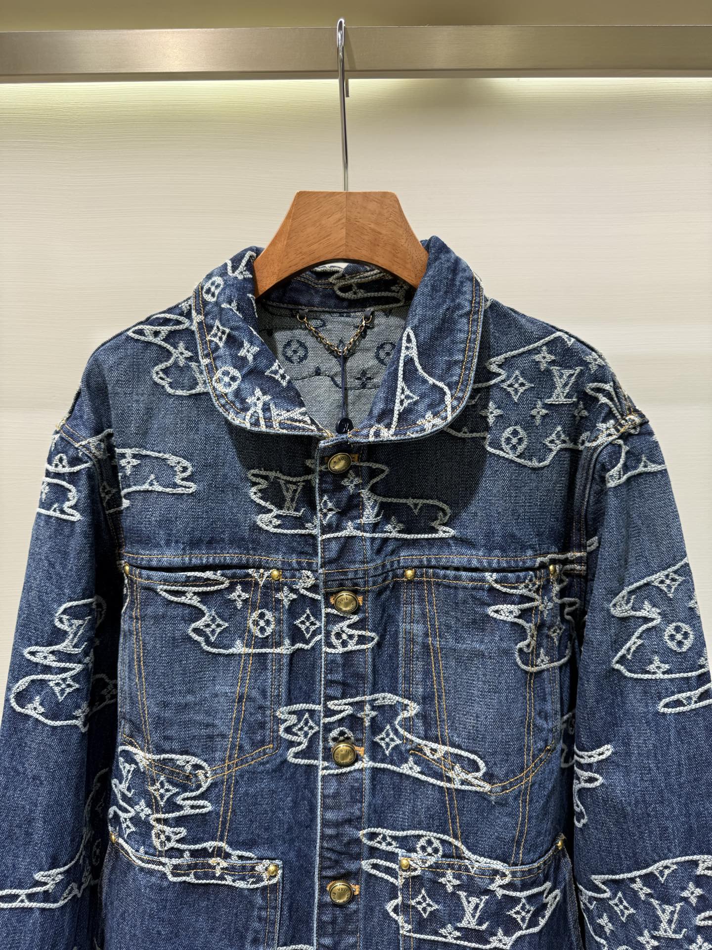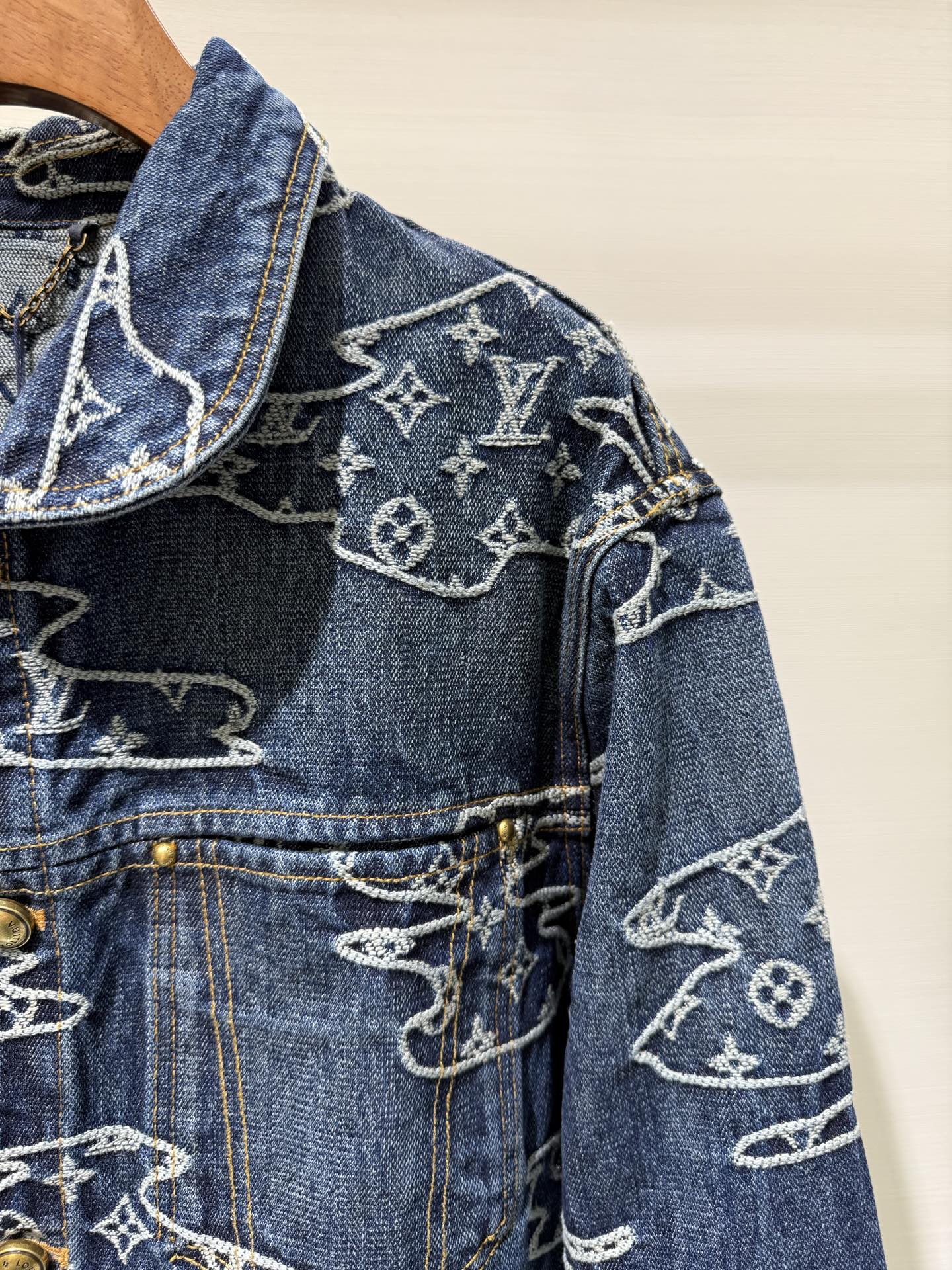 Tags: Button Closure Denim Jacket, Cloud Jacquard Denim Jacket, Designer Denim Outerwear, Monogram Denim Jacket, Washed Blue Lv Jacket