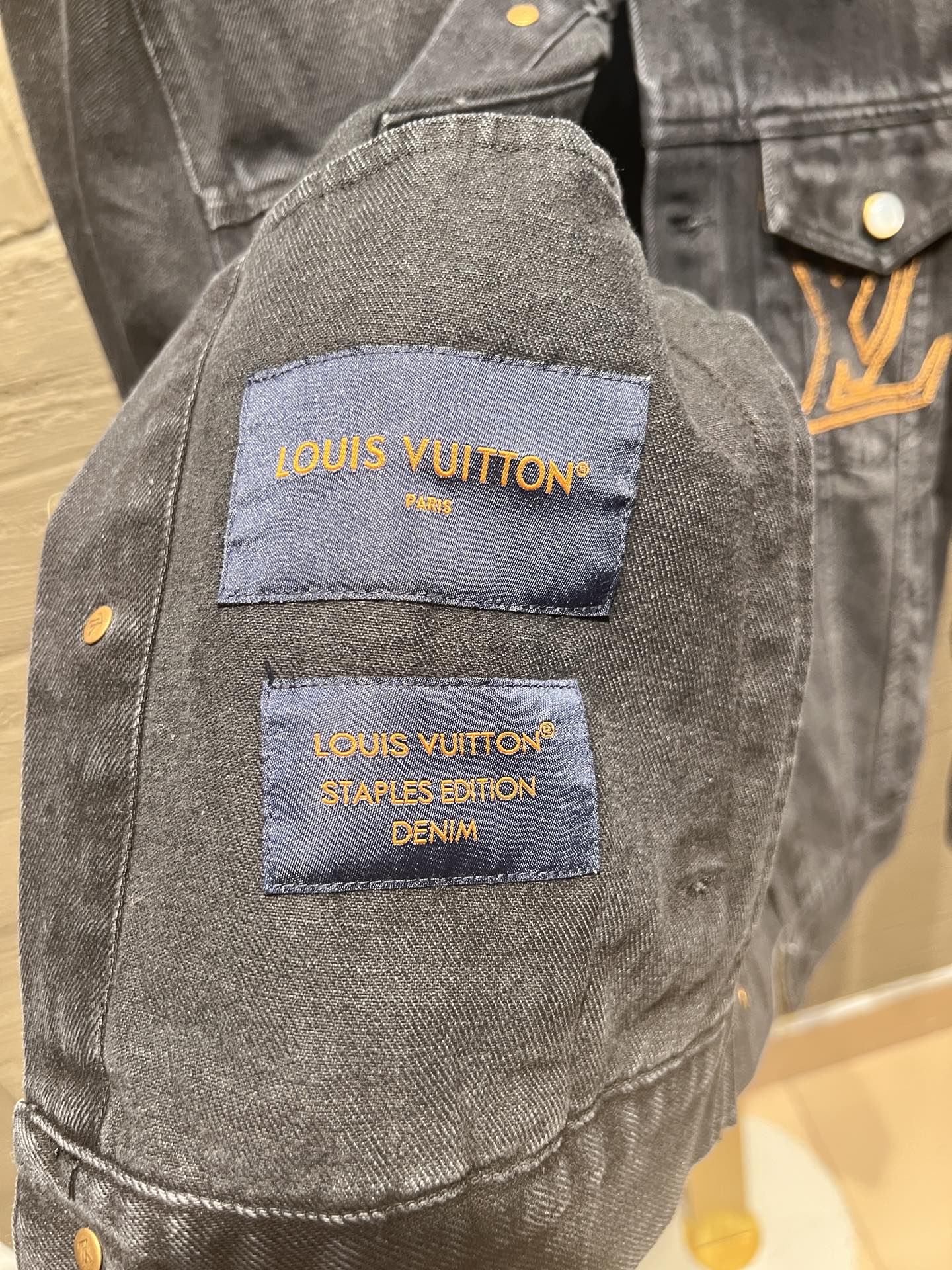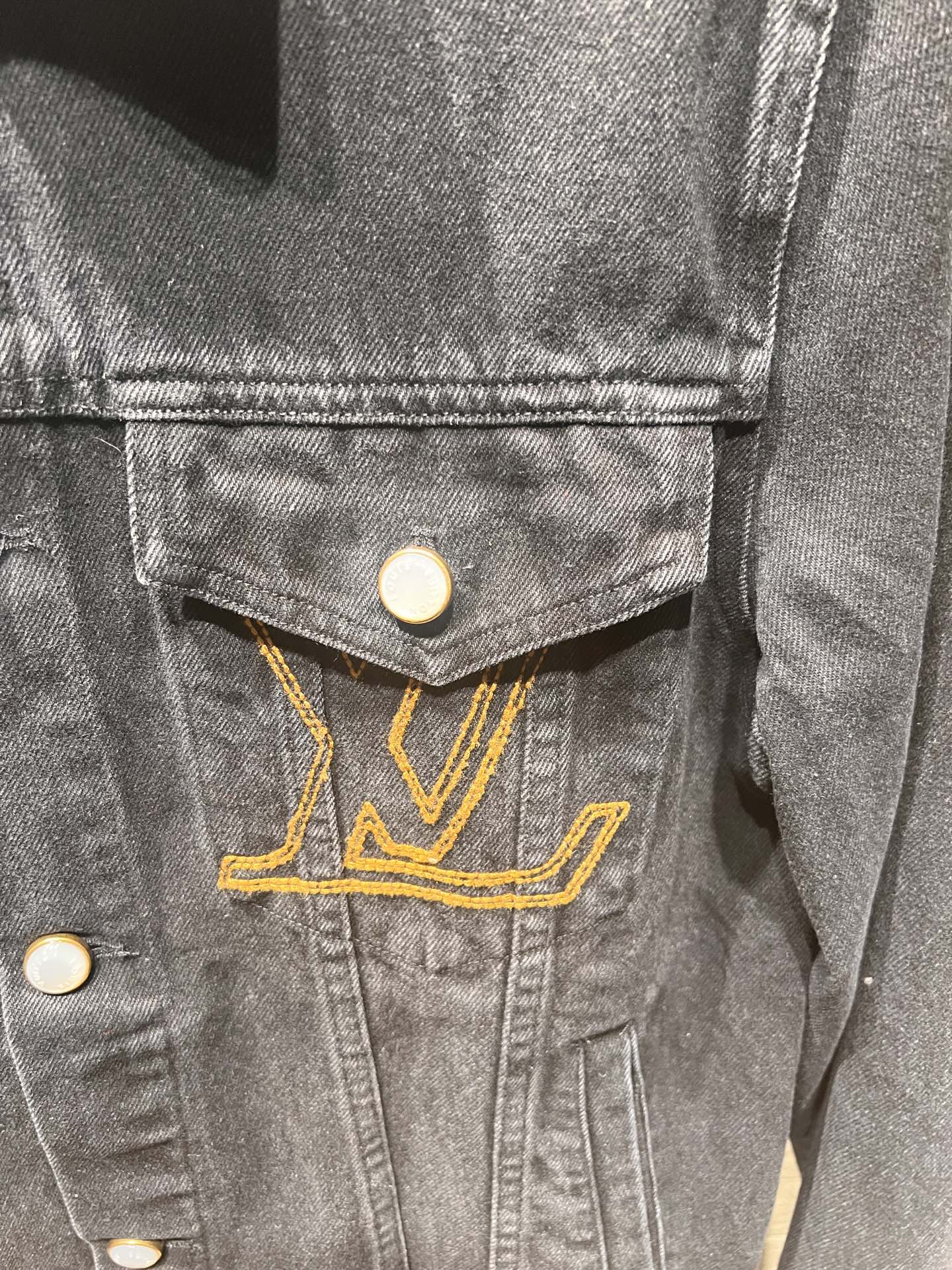 Tags: Designer Denim Outerwear, Embroidered Trucker Jacket, Louis Vuitton Denim Jacket, Luxury Denim Jacket, Washed Denim Jacket