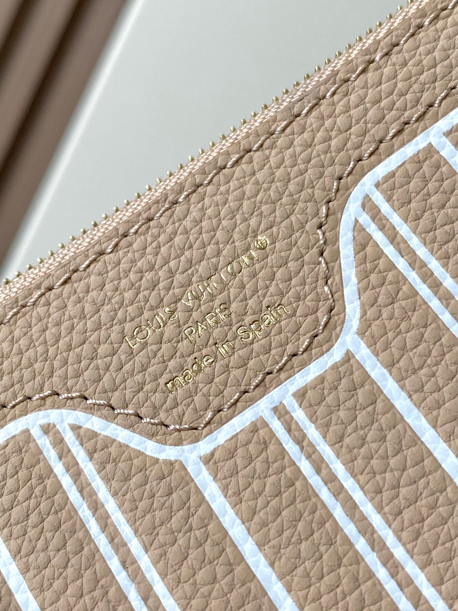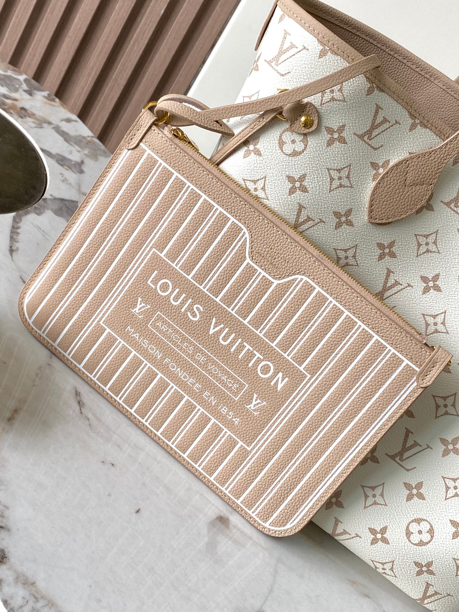 The Louis Vuitton Neverfull Inside Out medium tote features A-grade steel hardware and imported original fabric. Dimensions: 28 x 14 x 31 cm.