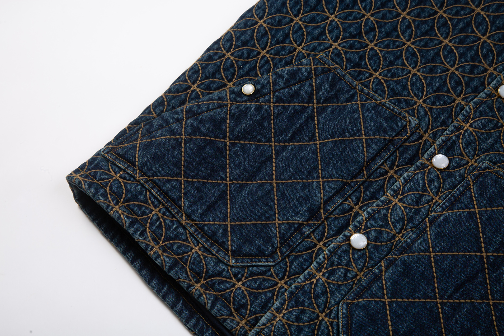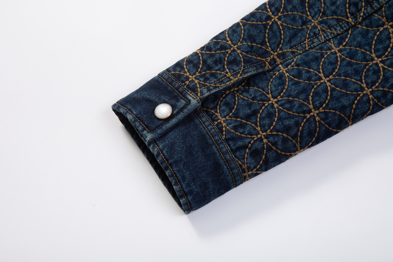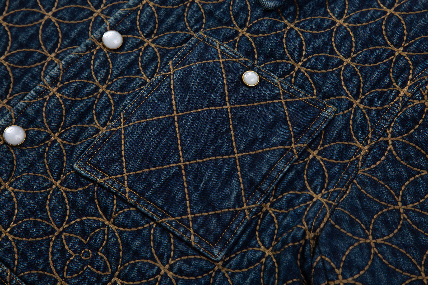 Elevate your wardrobe with this Louis Vuitton denim jacket. Features intricate quilted embroidery and pearl button accents.
