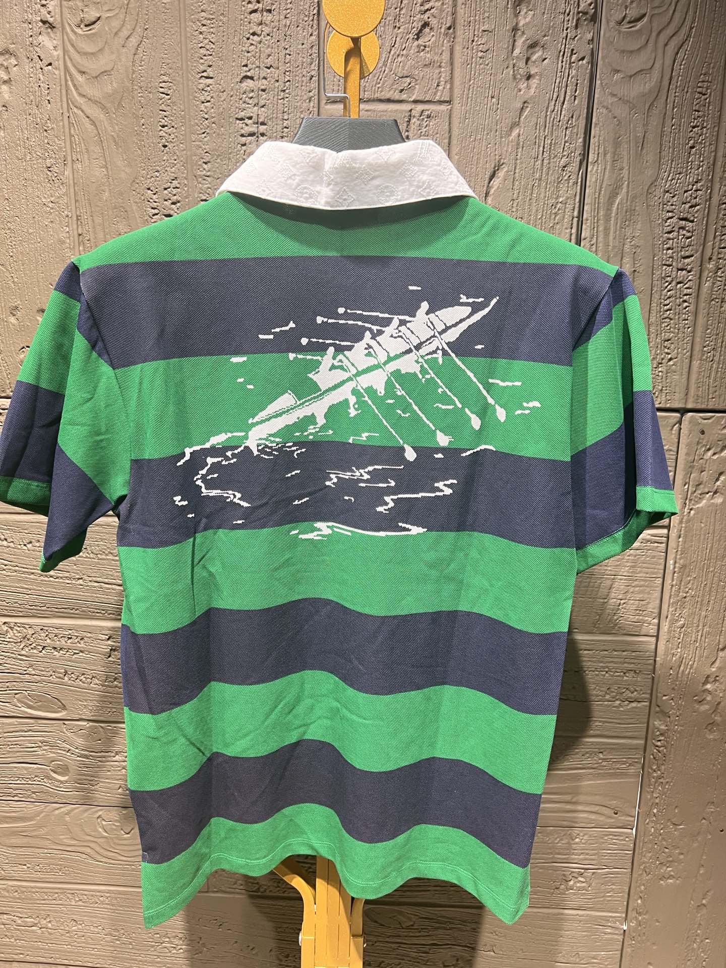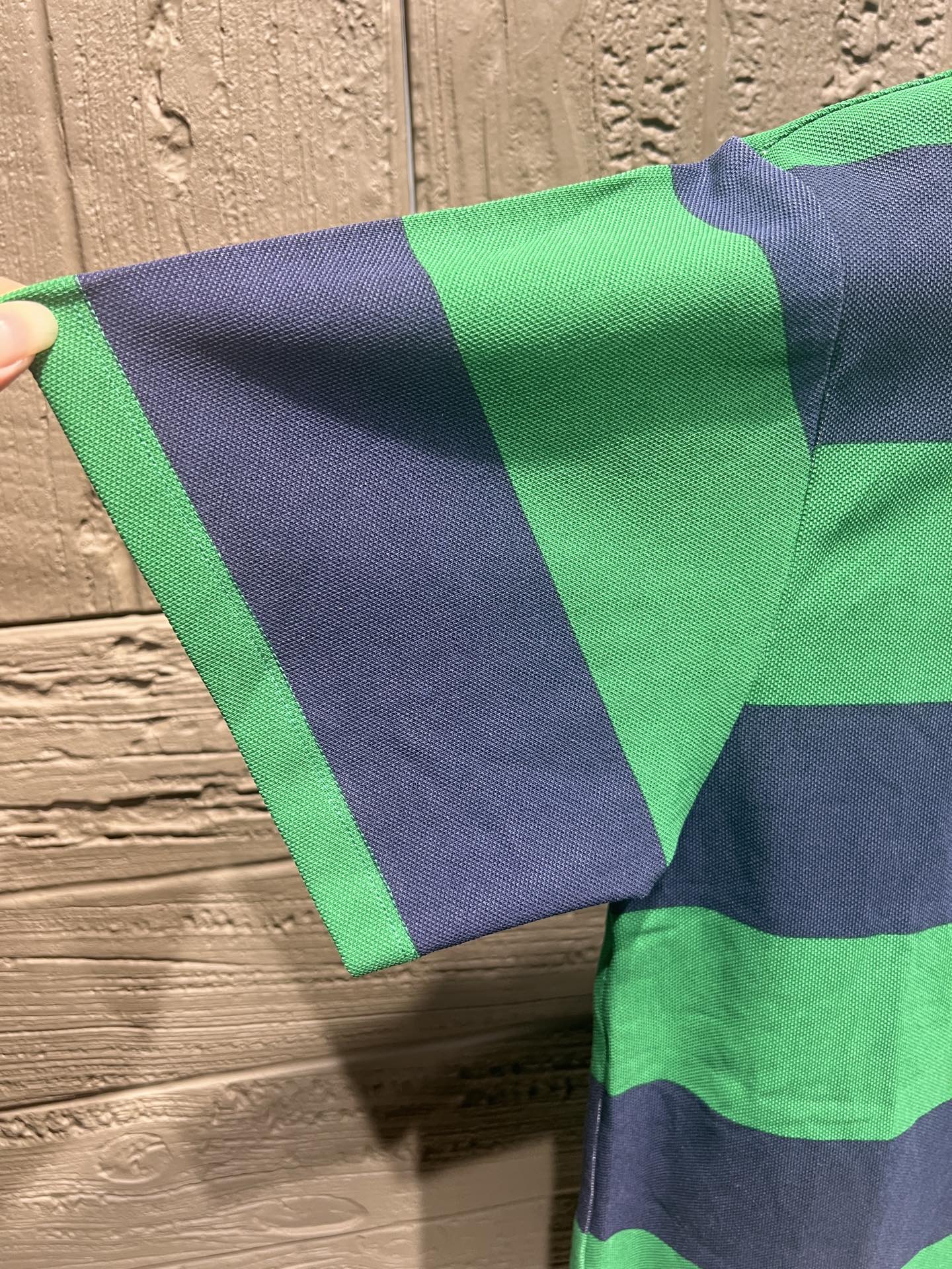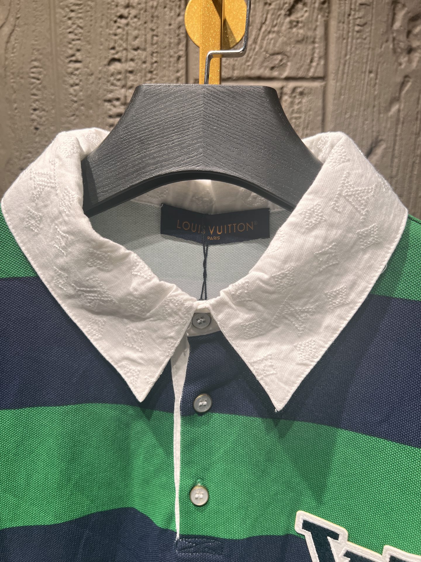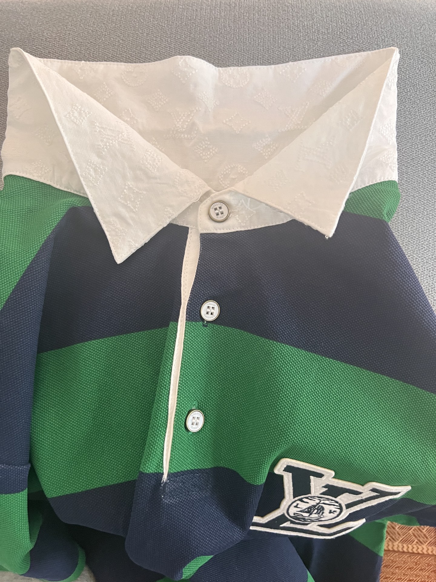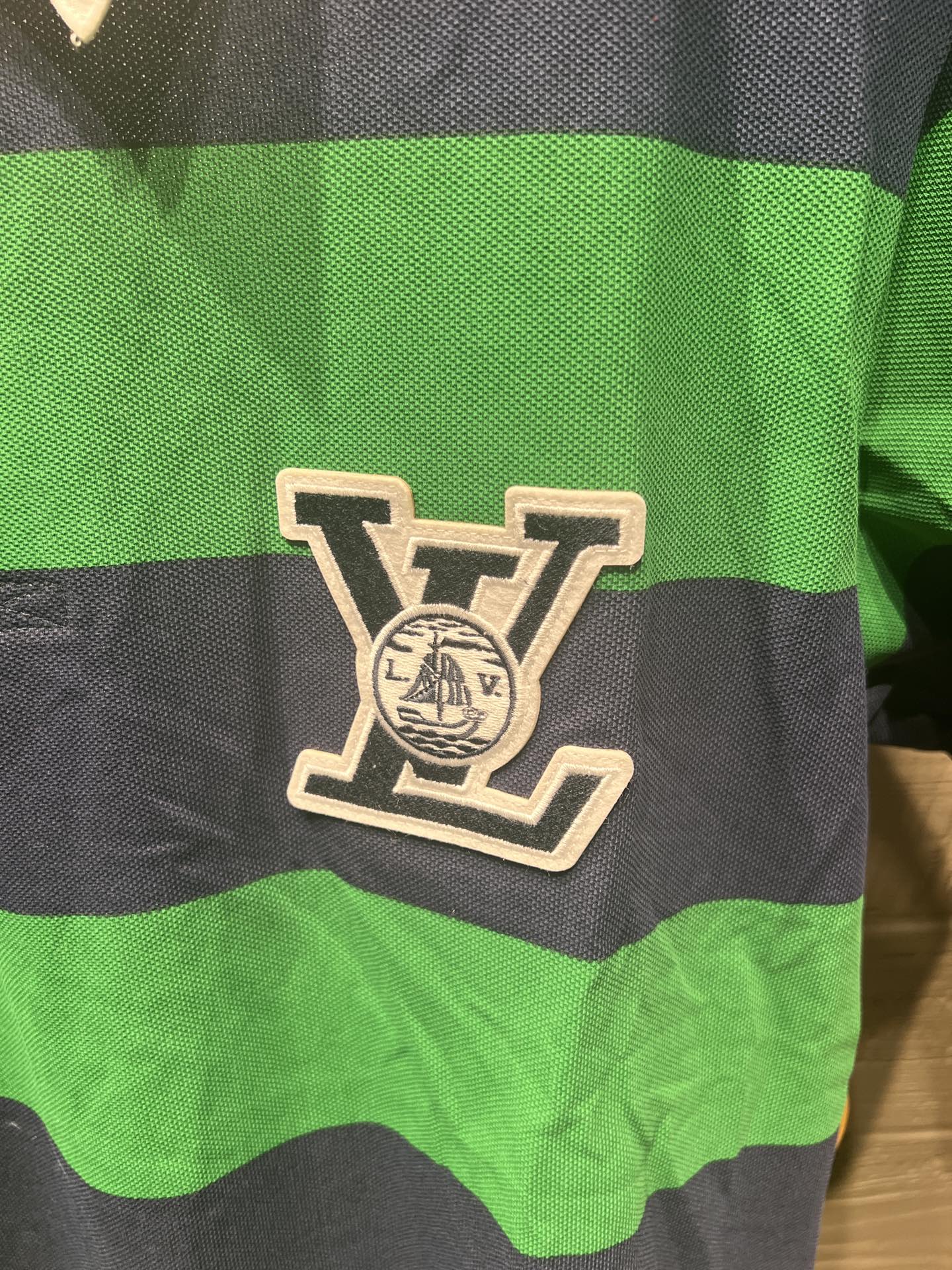 Striped polo shirt with Monogram collar and Louis Vuitton patch. Perfect for a casual yet stylish look. Available in sizes S, M, L.