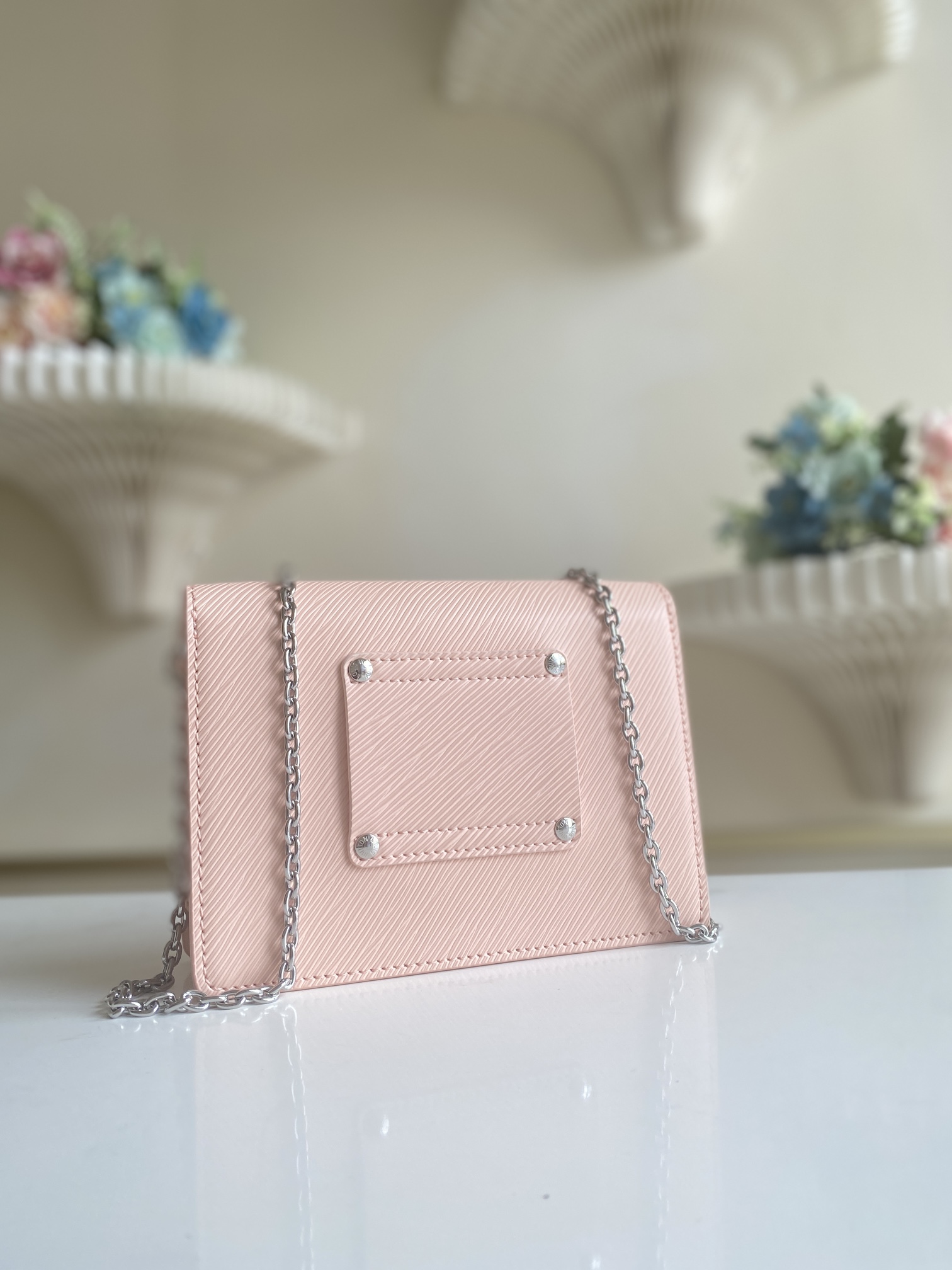 Tags: Convertible Belt Bag, Designer Chain Bag, Louis Vuitton Twist Bag, Pink Epi Leather Bag, Silver Chain Belt Bag, Twist Lock Shoulder Bag