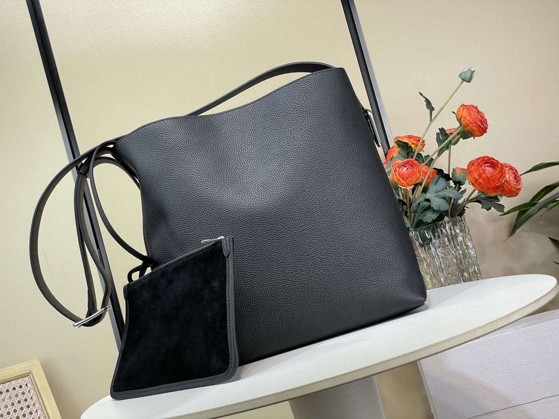 The Louis Vuitton Verso Hobo Bag in black leather. Features a V-stitched pocket and a detachable suede pouch. Dimensions: 33 x 15.5 x 30 cm.